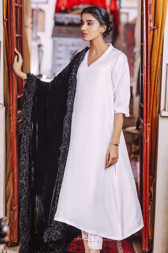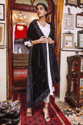 Black pure velvet shawl is a perfect fix for winters. The crystal and beads work on side complements best with the fur edging.