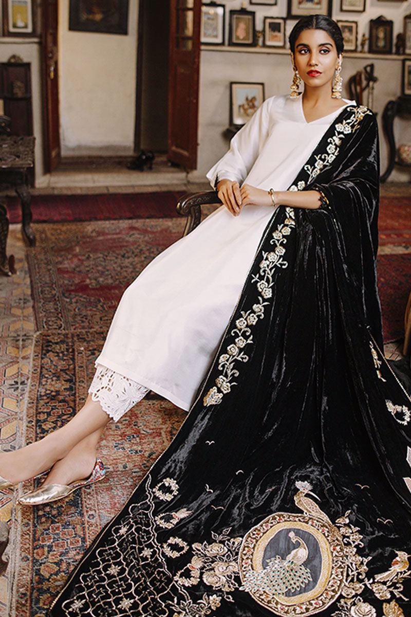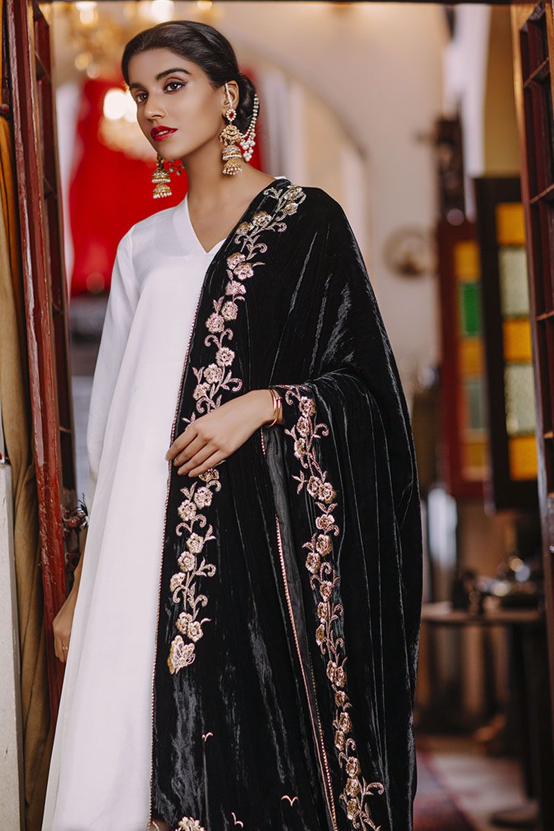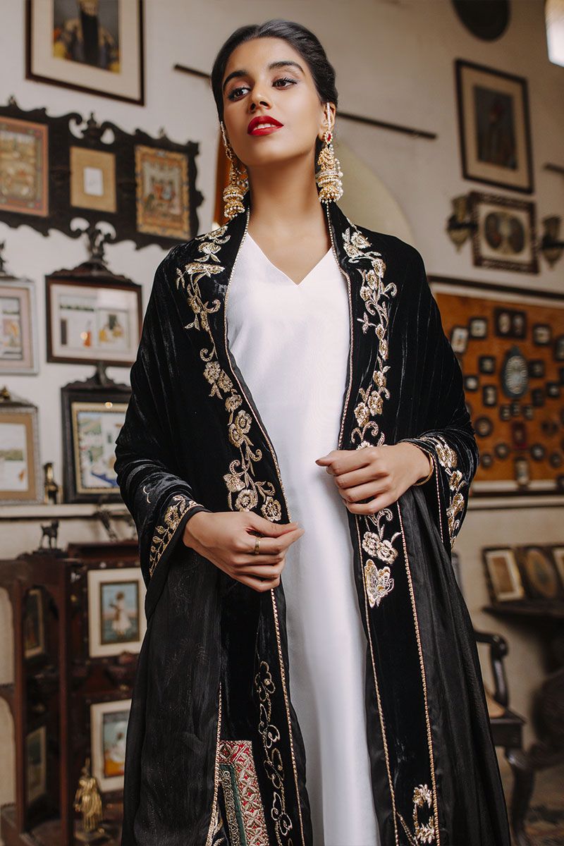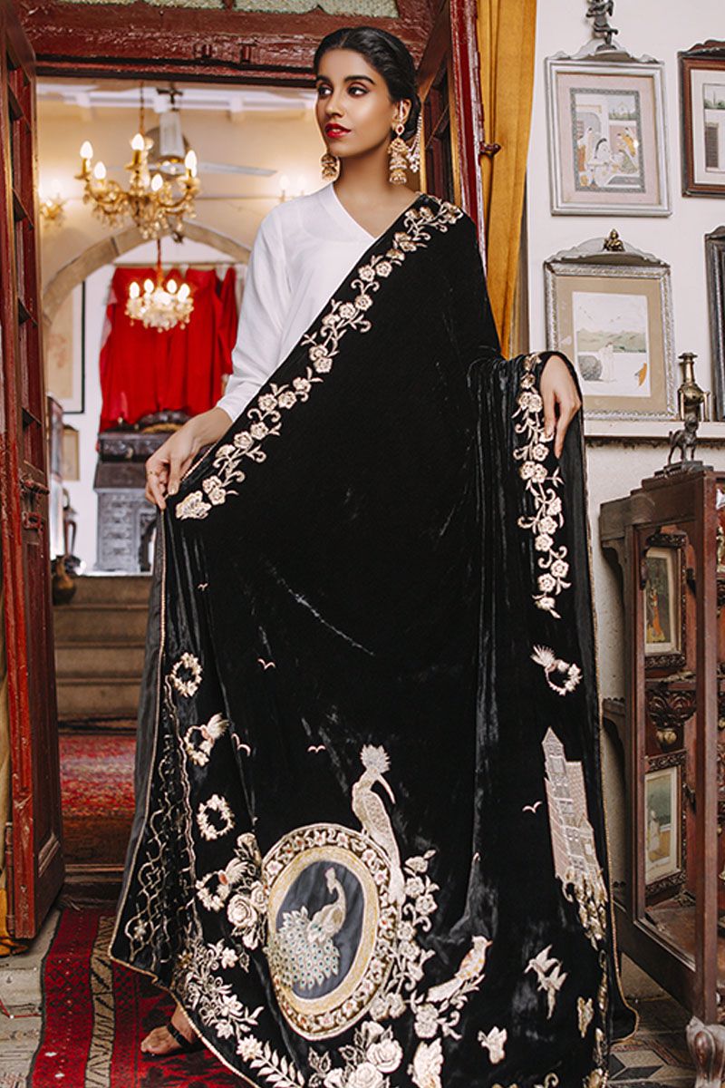This black velvet shawl acts as the canvas with artwork of flora and fauna along with ogee motifs. The embellishment comprises of resham, gota and zari work all over .
