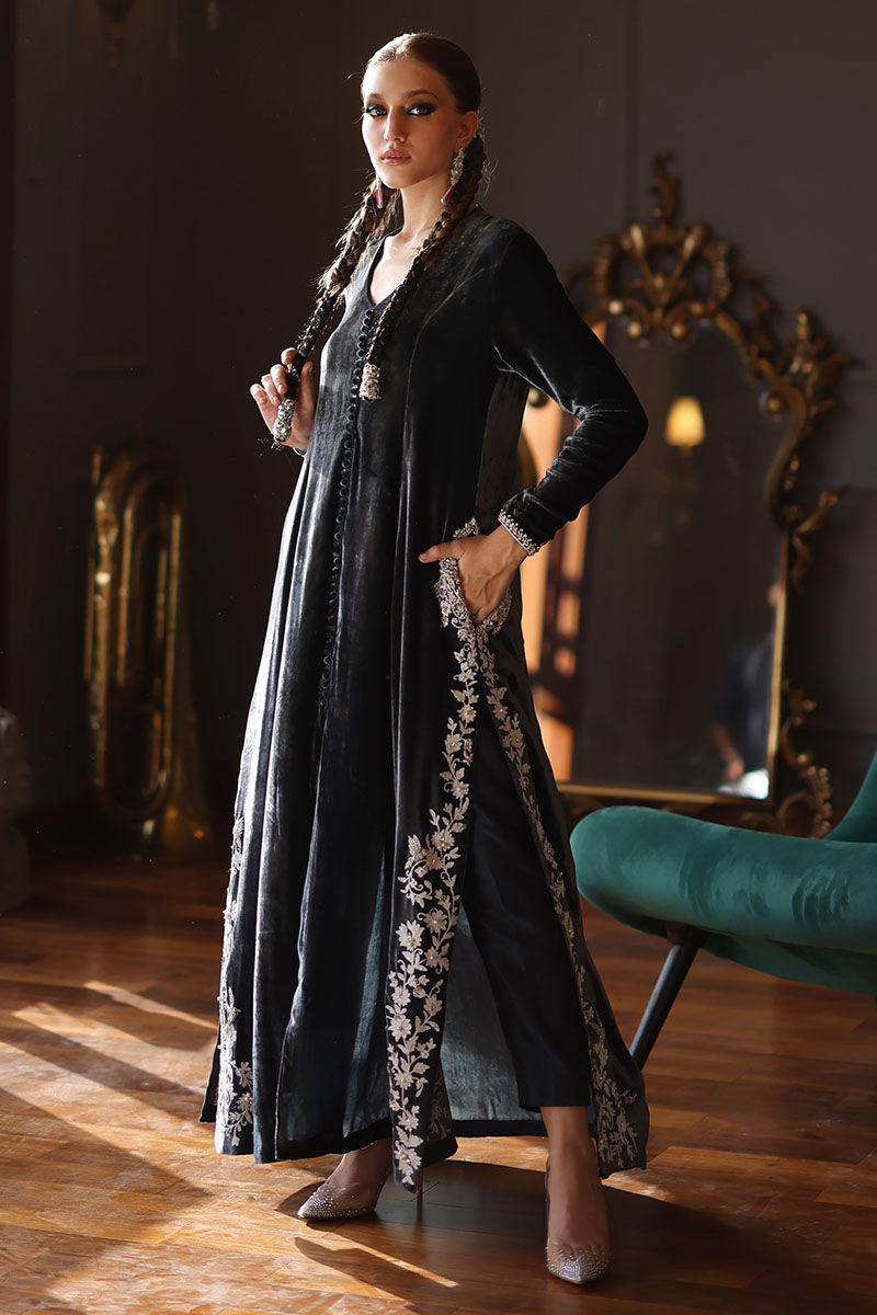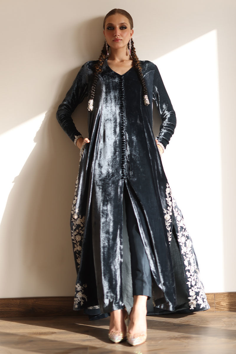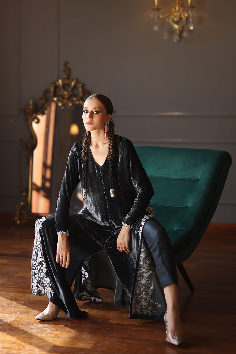 Step into elegance with our steeple grey velvet prince panel shirt ensemble. The steeple grey hue exudes sophistication, and the exquisite ivory resham ari work, hand-touched on all four side slits, adds an artisanal touch. To complete the ensemble, the shirt features pure zardozi handwork of dabka and naqshi on the pockets. To complete your look pure raw silk pants, offer the ideal balance of comfort and style.