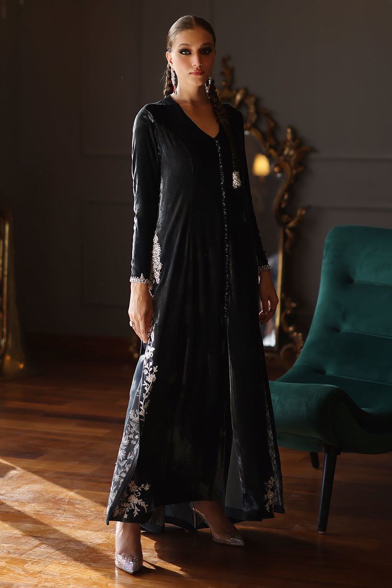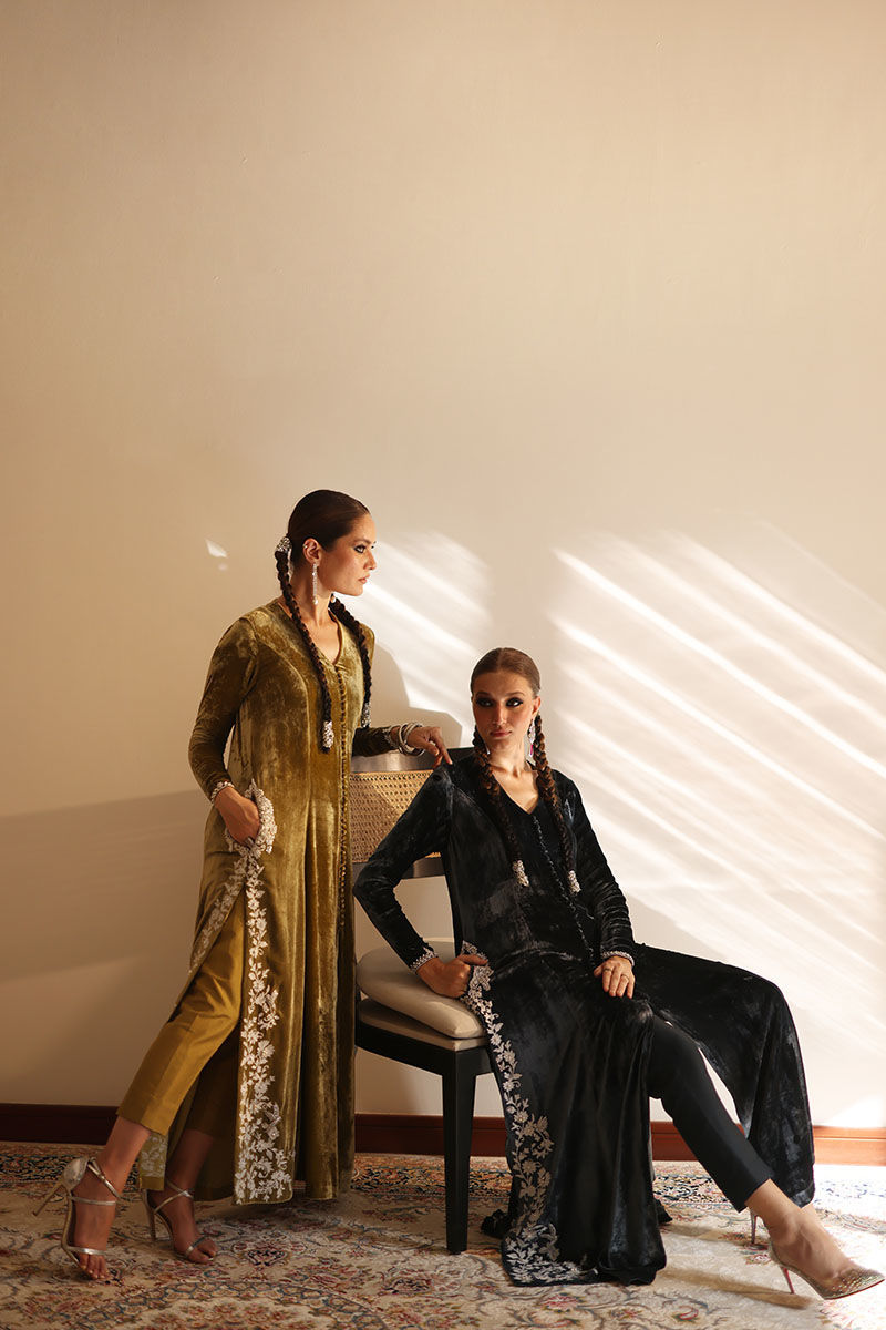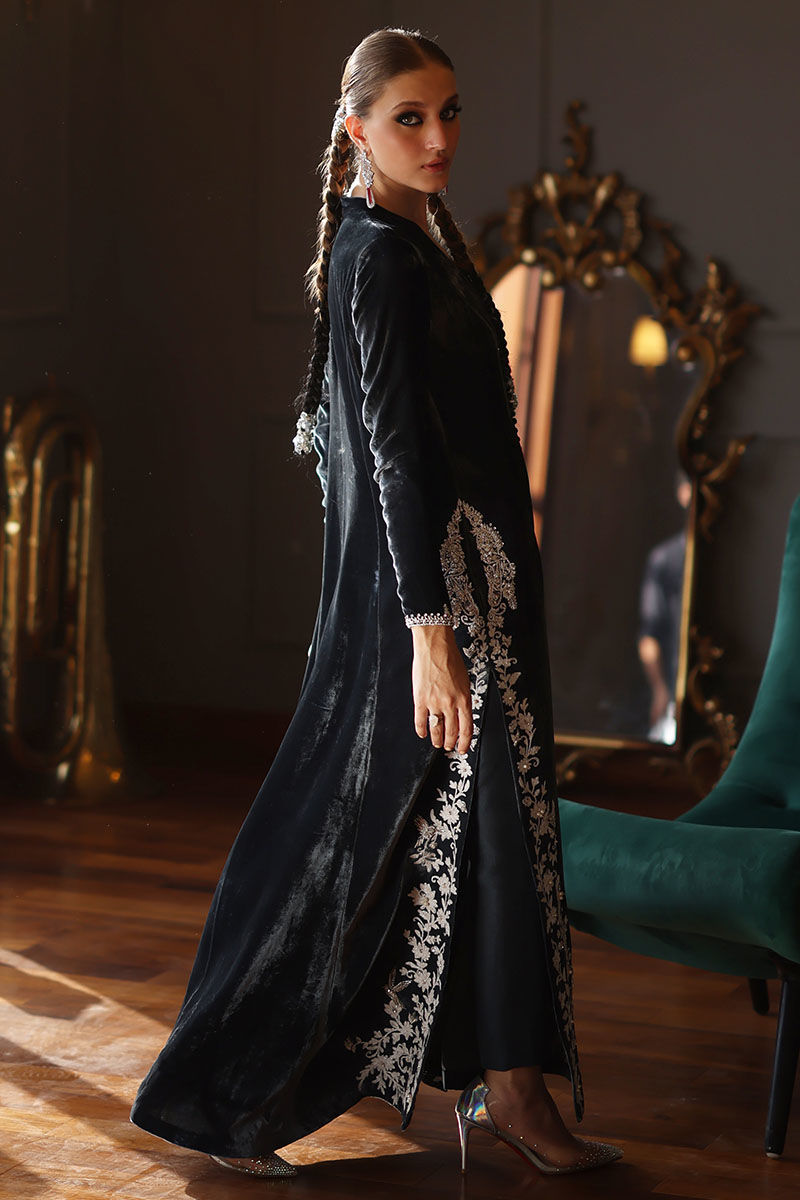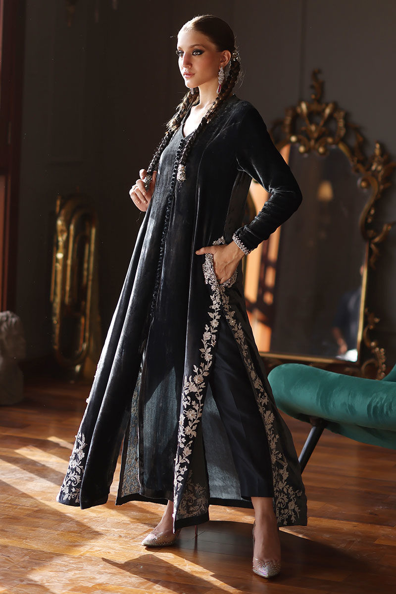 Step into elegance with our steeple grey velvet prince panel shirt ensemble. The steeple grey hue exudes sophistication, and the exquisite ivory resham ari work, hand-touched on all four side slits, adds an artisanal touch. To complete the ensemble, the shirt features pure zardozi handwork of dabka and naqshi on the pockets. To complete your look pure raw silk pants, offer the ideal balance of comfort and style.