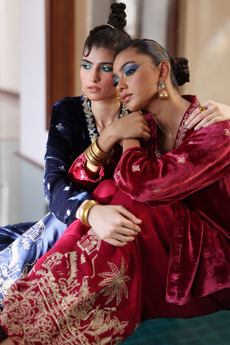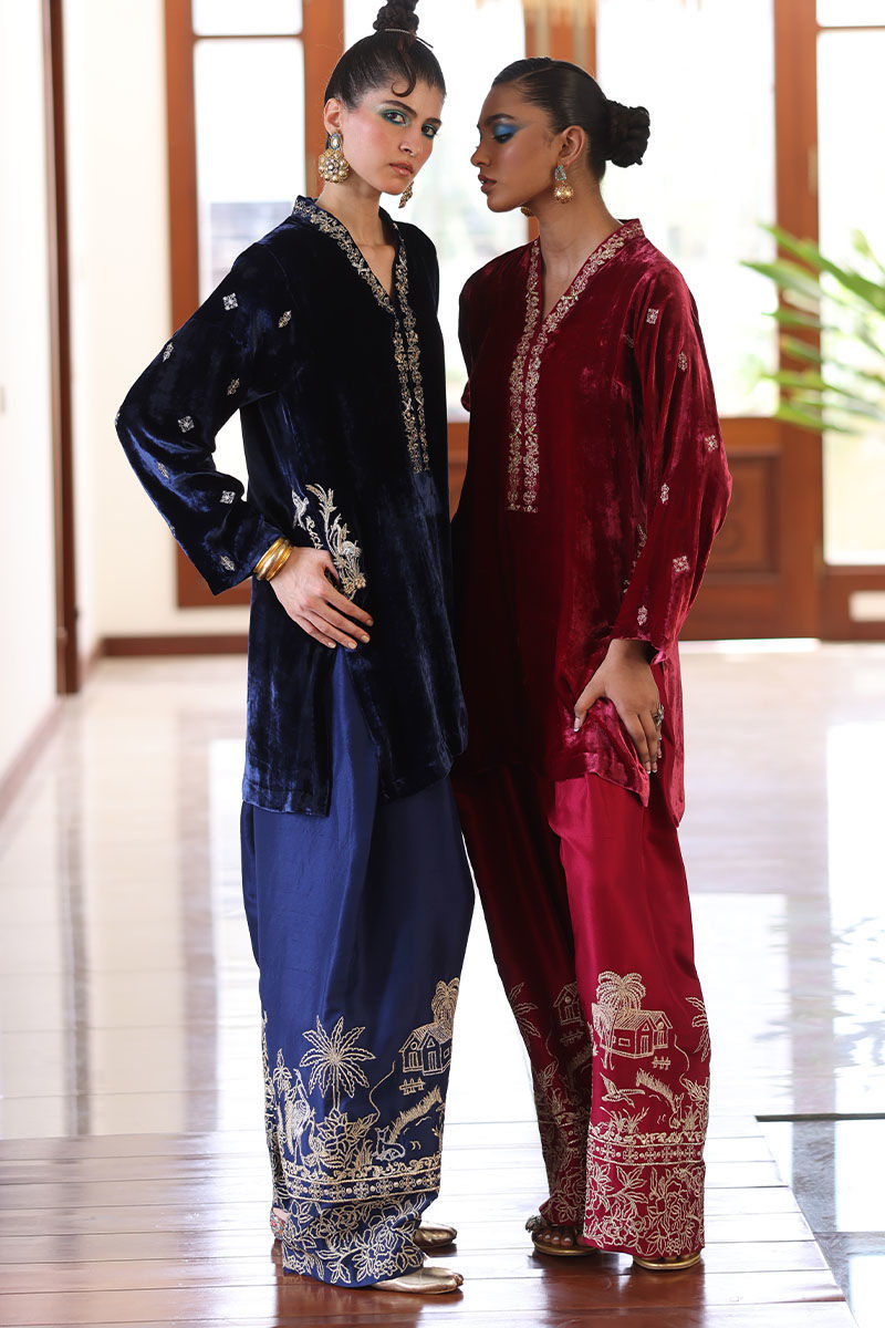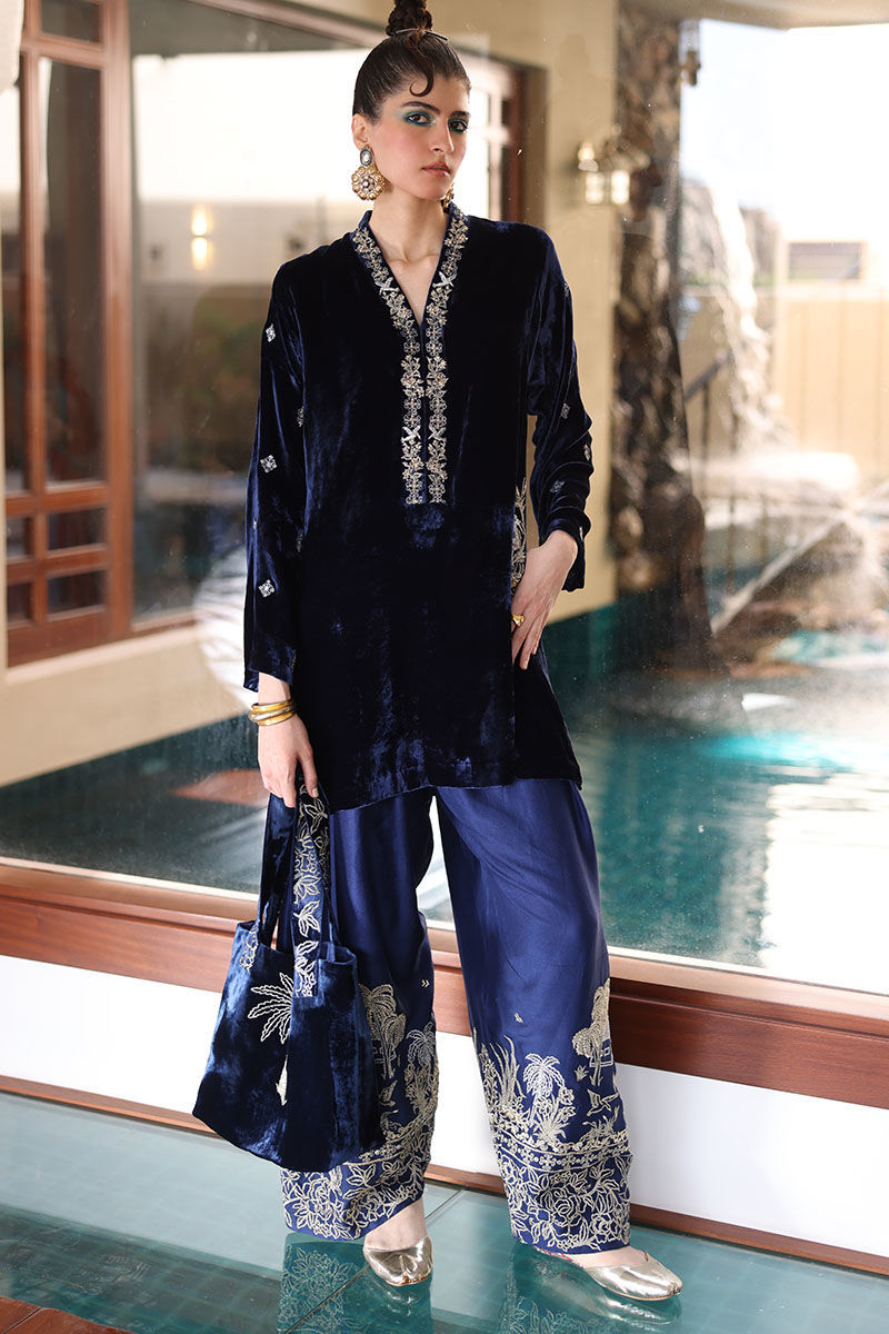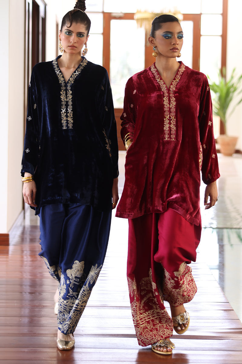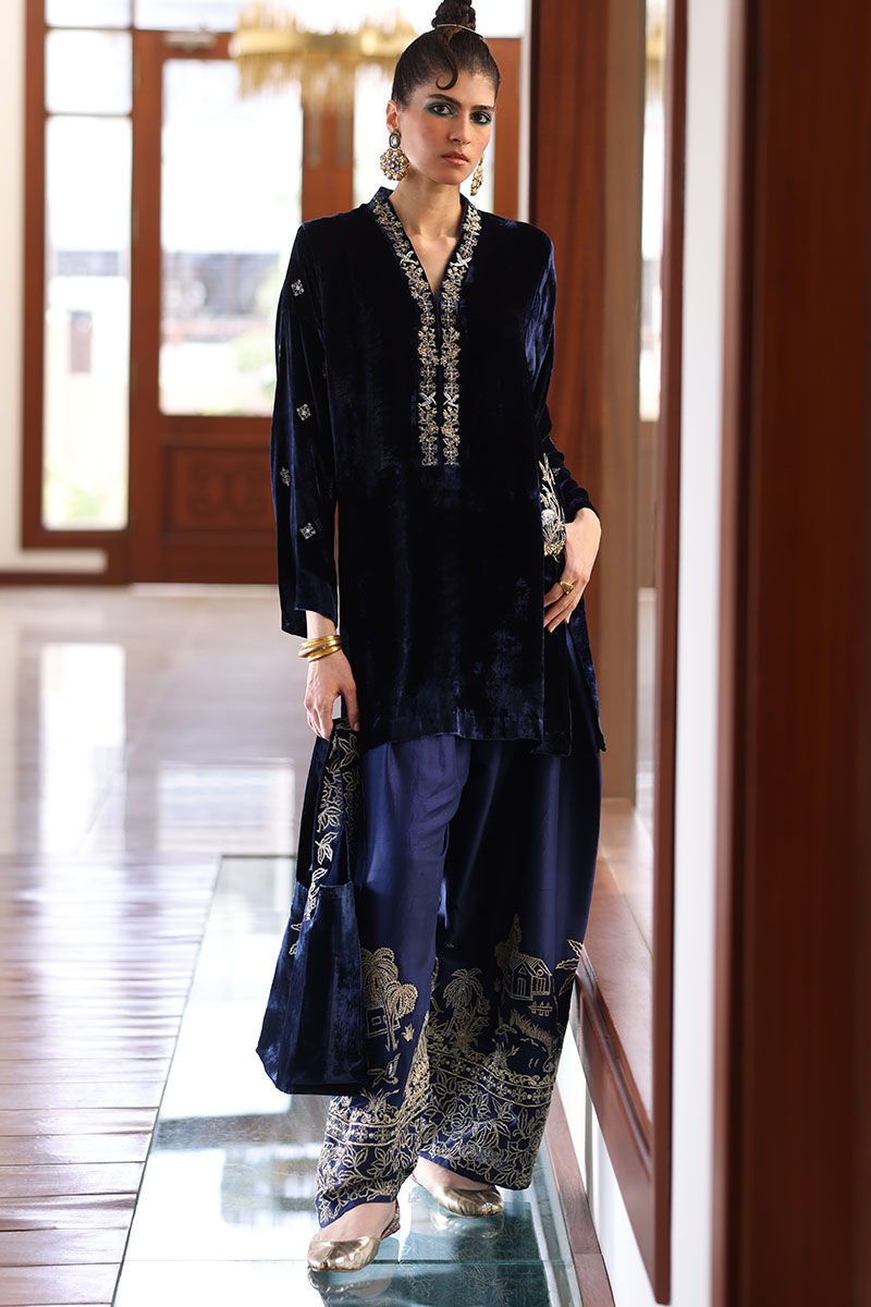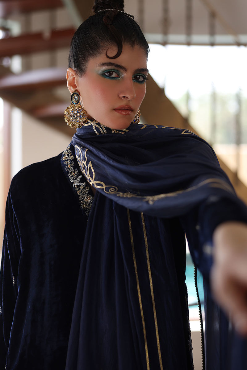This ensemble features a shirt meticulously crafted from pure silk velvet, exuding opulence and elegance. In a rich true navy hue, the shirt is adorned with intricate embroidery on the pockets, sleeves, and neckline. The embroidery work features zari, zardozi, sequence, and pearls, creating a regal and captivating design. Complete the ensemble with pure raw silk shalwar and with diamond organza silk dupatta, featuring an all-over floral pattern embroidery accentuated with exquisite gota dhanak work. It's finished with a four-sided edging graced with gota lace.