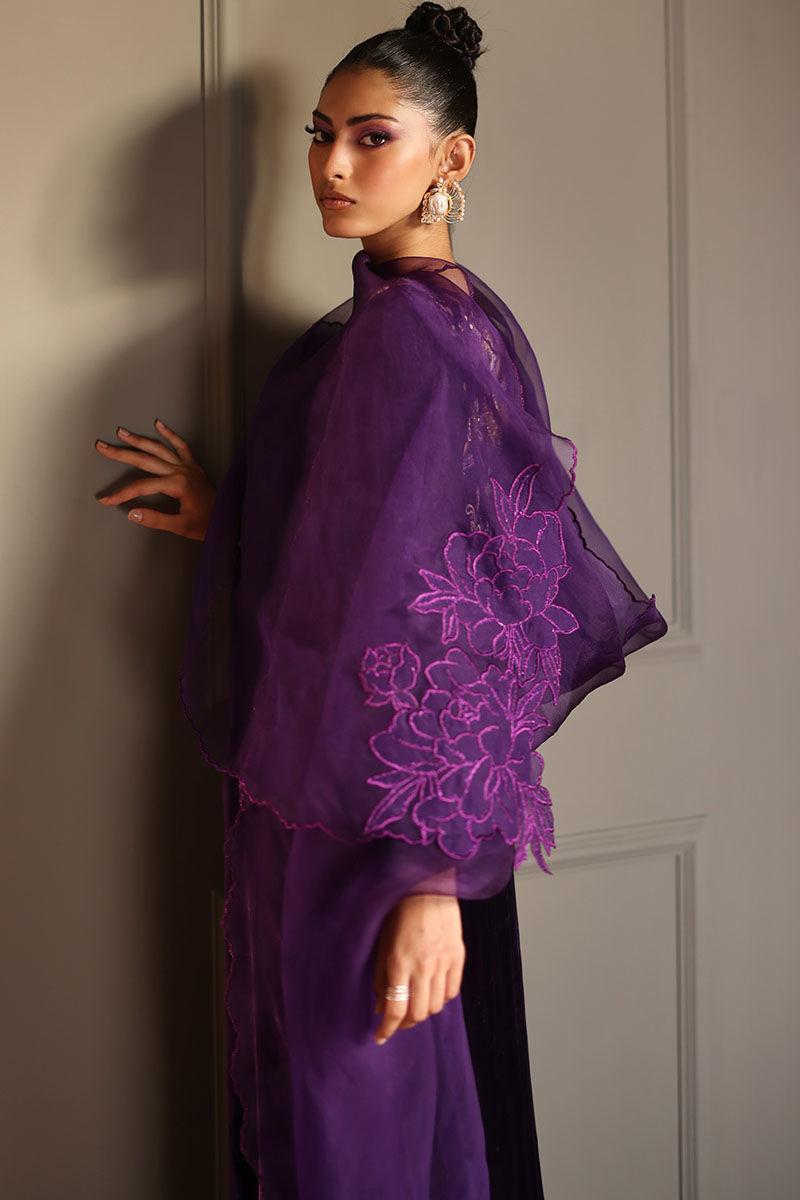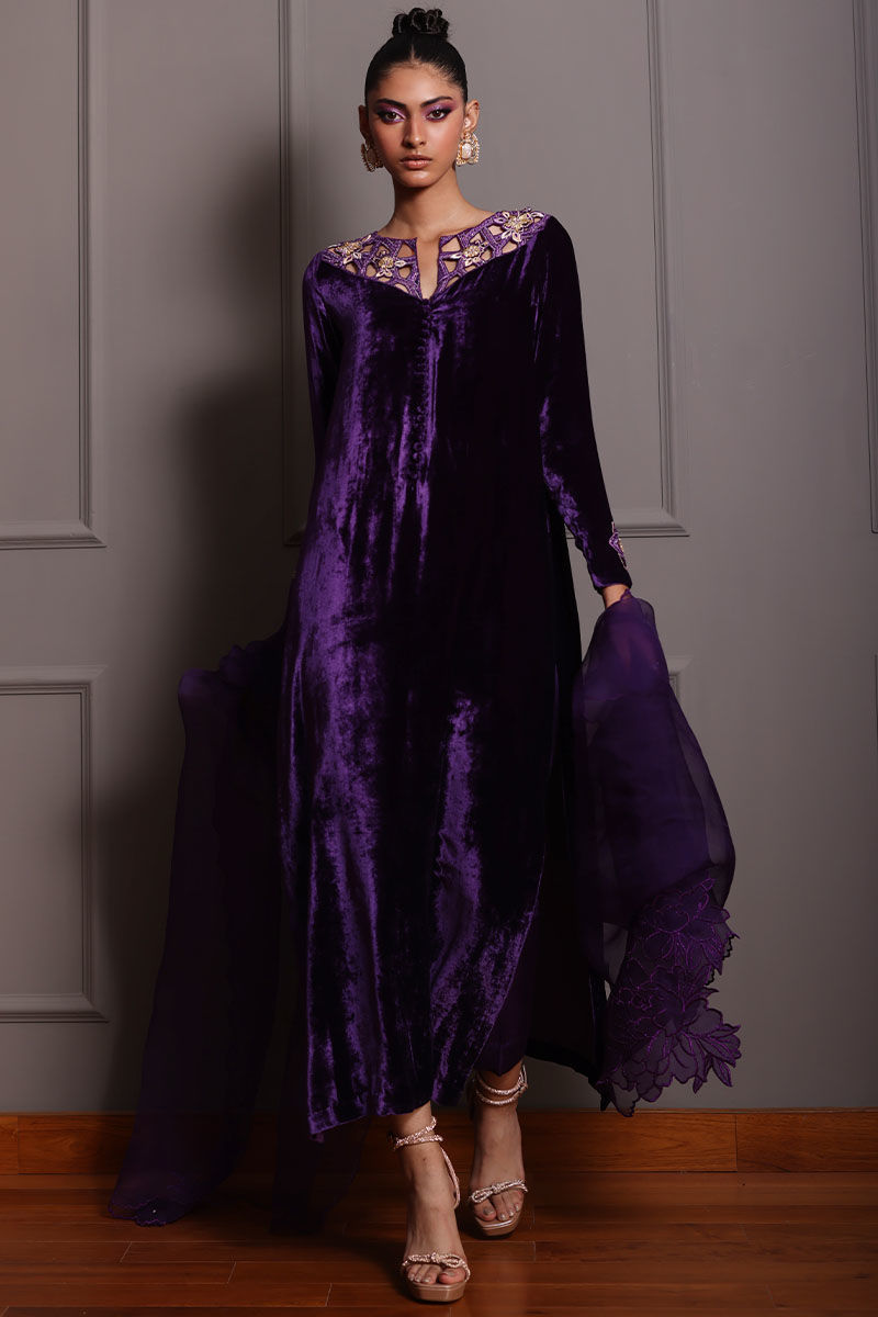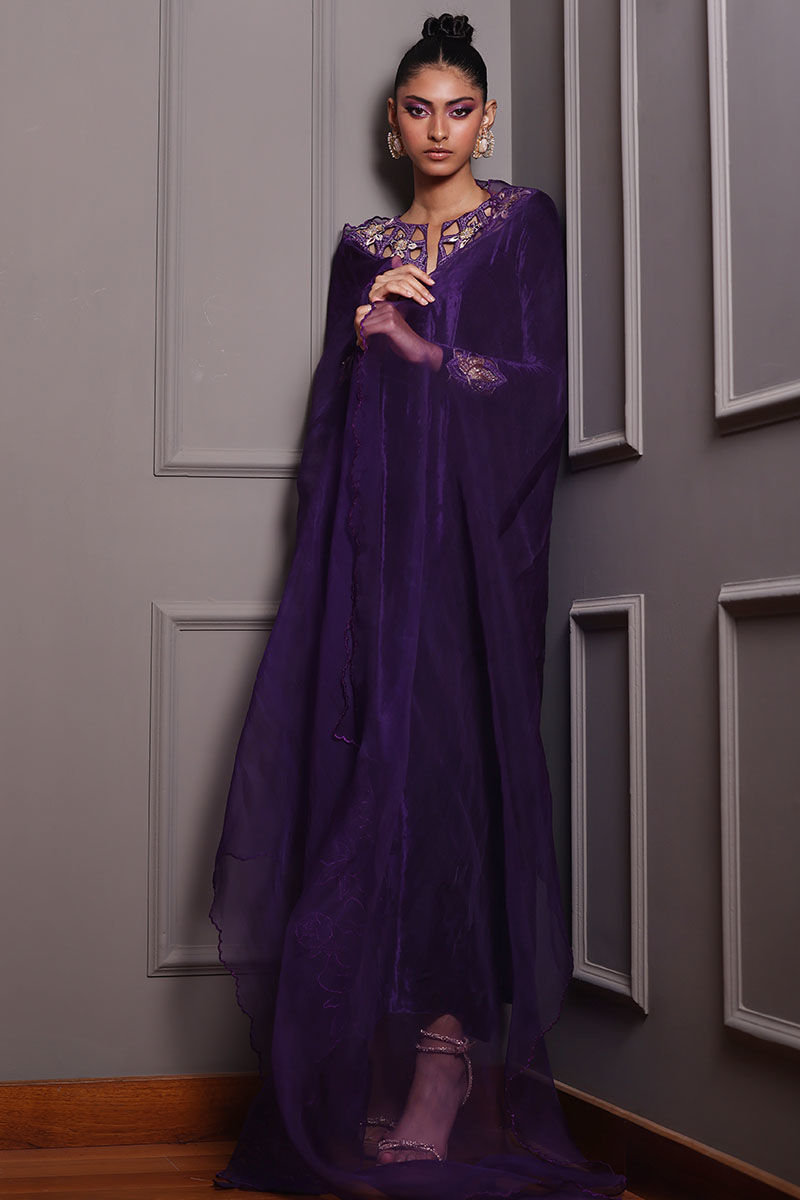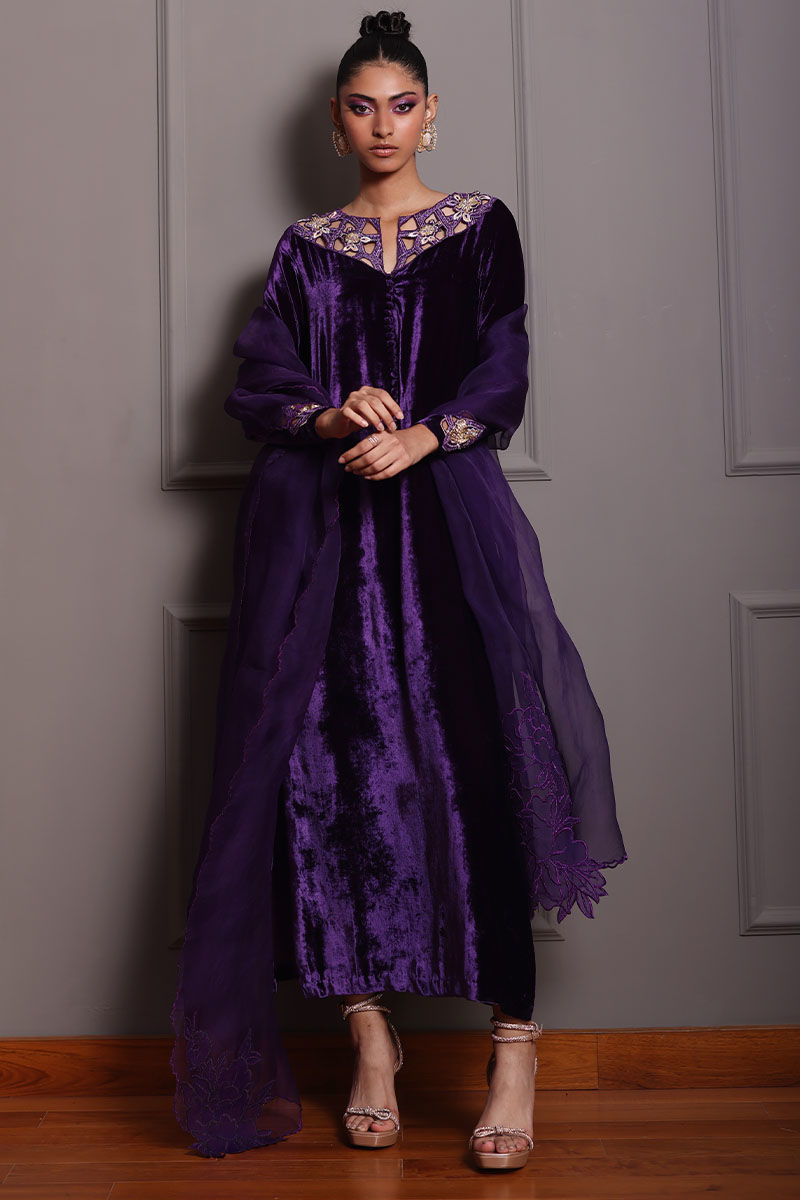 Elevate your style with our royal purple silk velvet shirt ensemble. This straight shirt in regal purple boasts cutwork on the back, front, and sleeves, along with all-over embroidery featuring gota, resham, zari, cutdana, tiki stones, lorex, and sequence. Paired with pure raw silk pants and a pure organza dupatta with a corner embroidered motifs. This ensemble is perfect for making a lasting impression at any event.