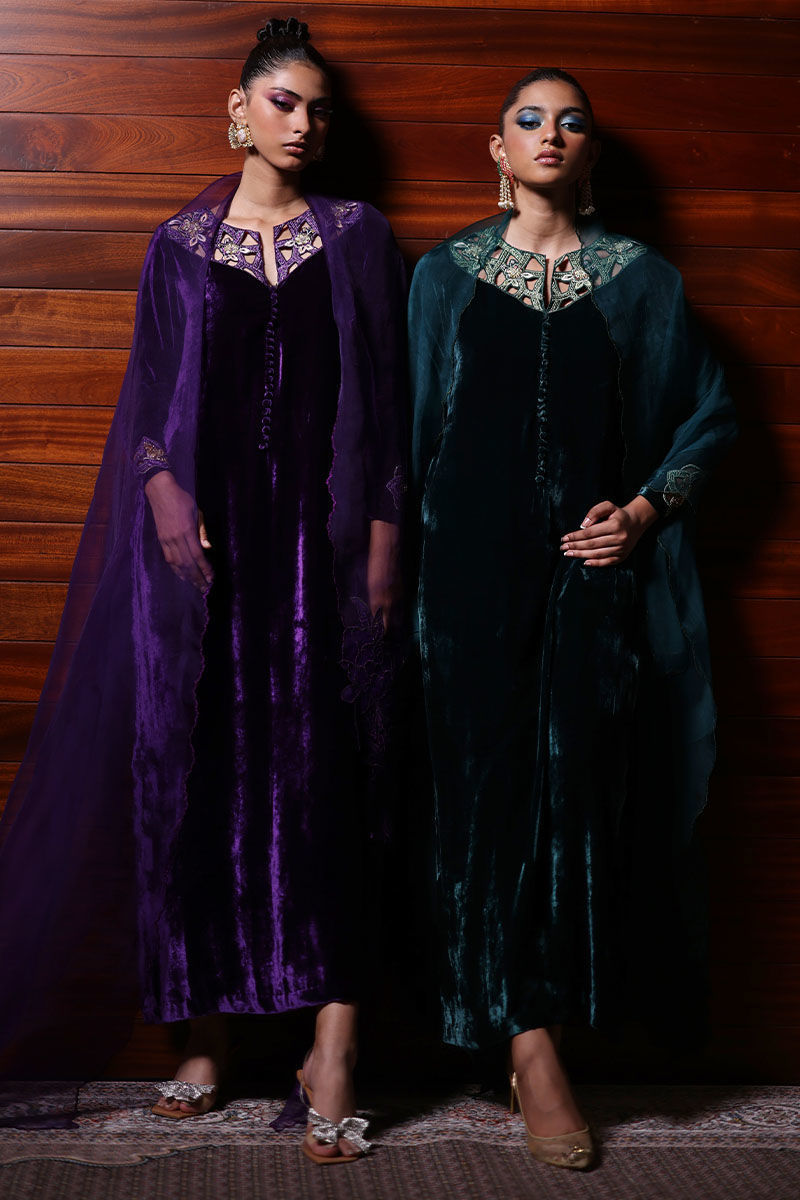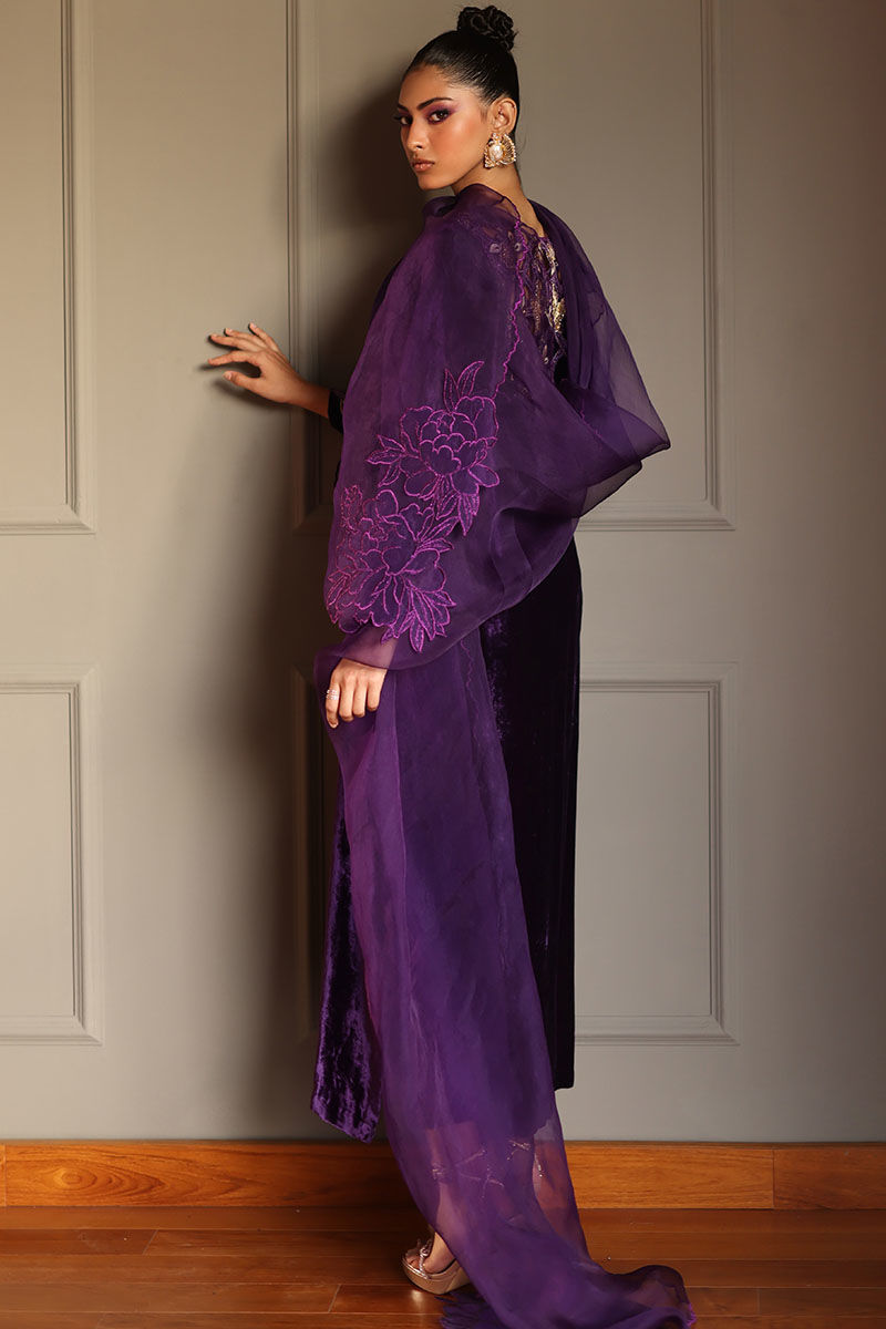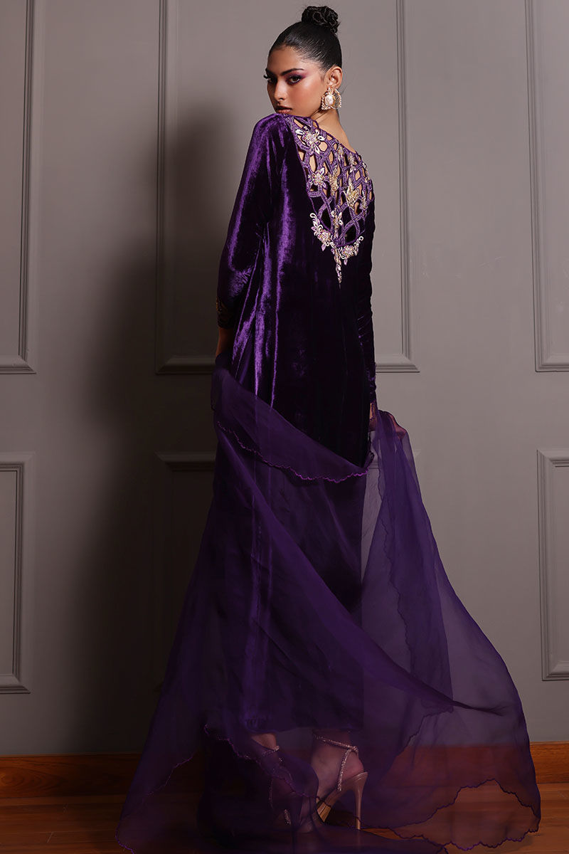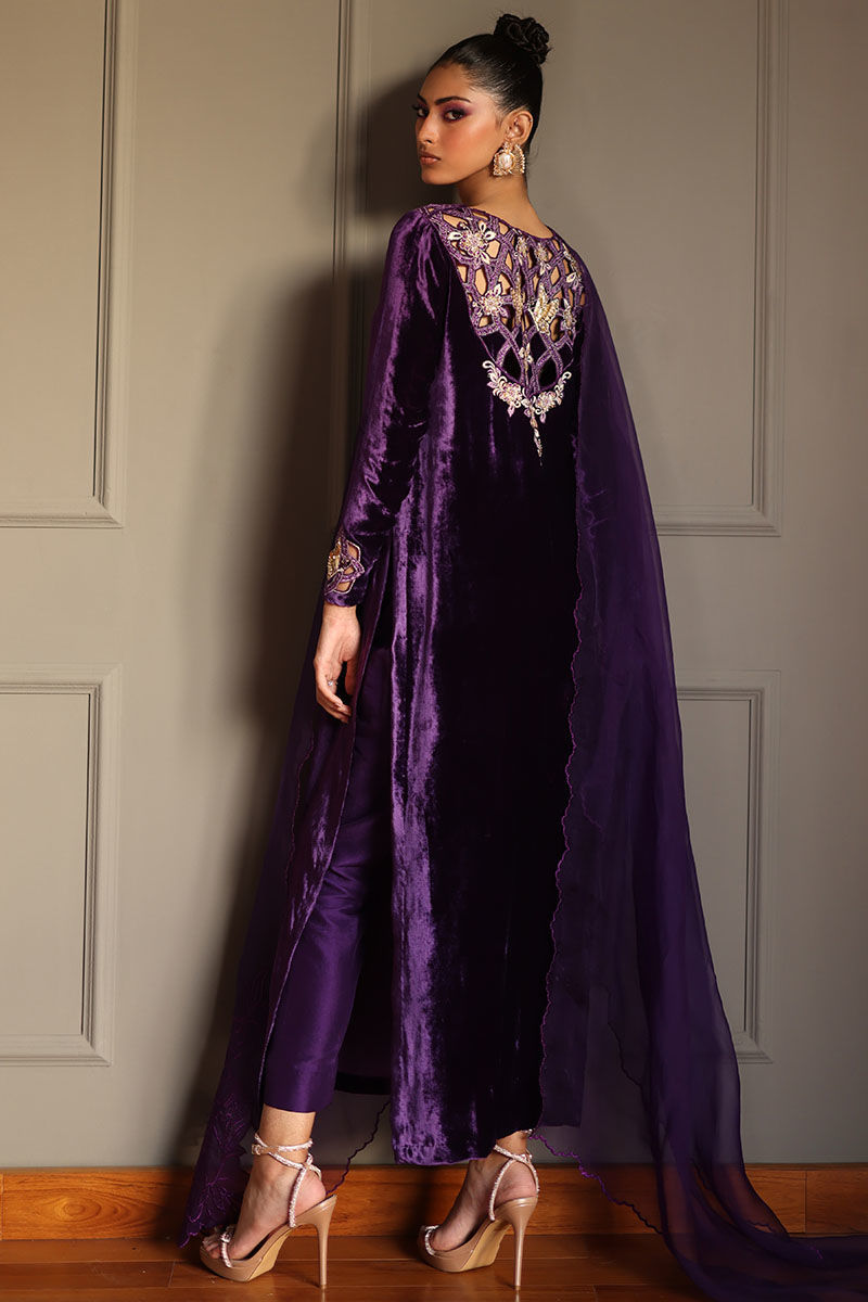 Elevate your style with our royal purple silk velvet shirt ensemble. This straight shirt in regal purple boasts cutwork on the back, front, and sleeves, along with all-over embroidery featuring gota, resham, zari, cutdana, tiki stones, lorex, and sequence. Paired with pure raw silk pants and a pure organza dupatta with a corner embroidered motifs. This ensemble is perfect for making a lasting impression at any event.