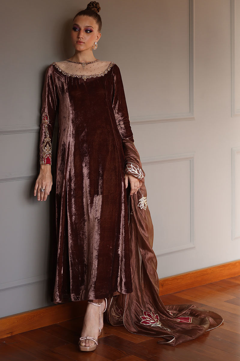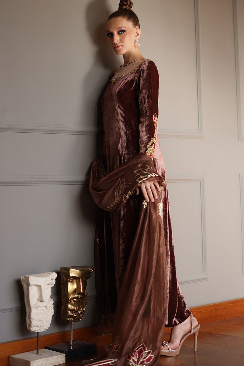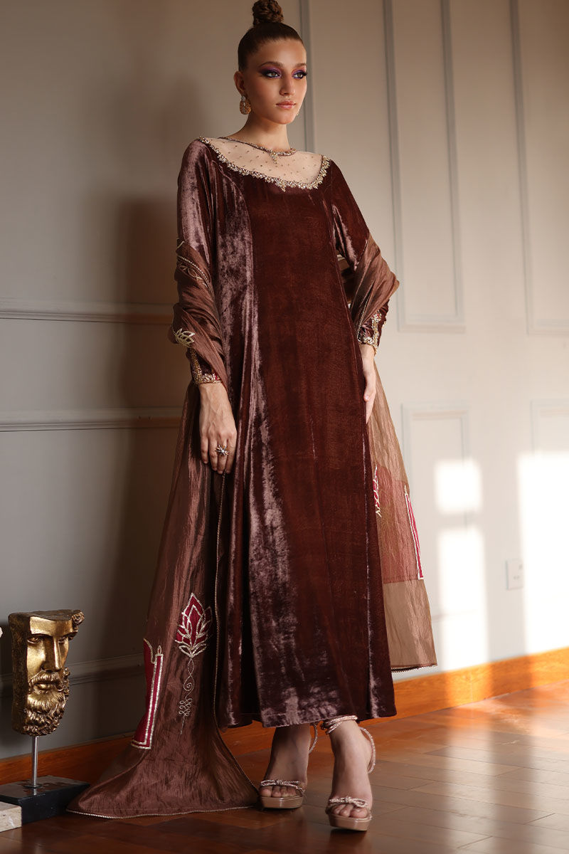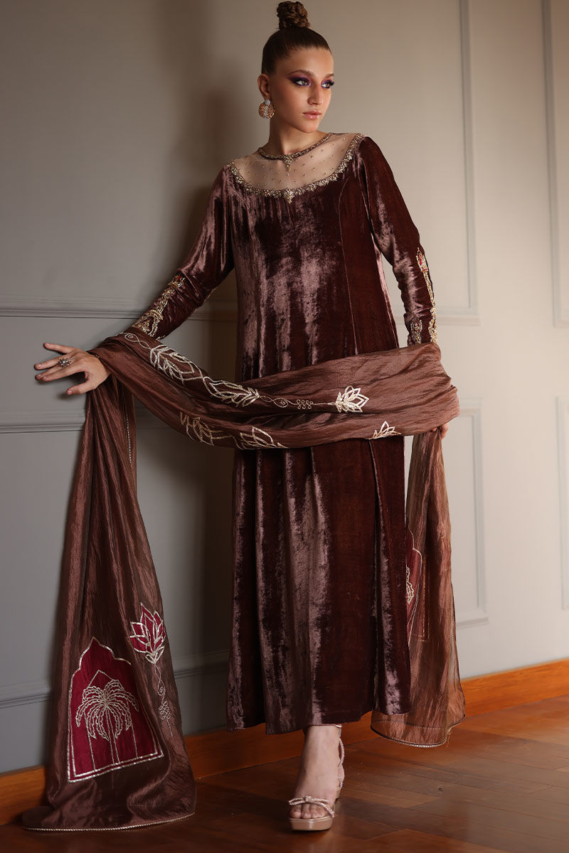 This dress, in a rich tobacco hue, features intricate zardozi work with kora, dabka, naushi, tiki stone, moti, and sequence, and handwork on the sleeves. Paired with pure raw silk pants and a diamond organza silk dupatta adorned with a lotus pattern and gota lace, it's a statement of opulence and grace.