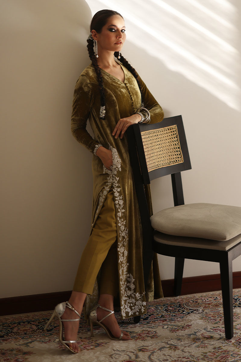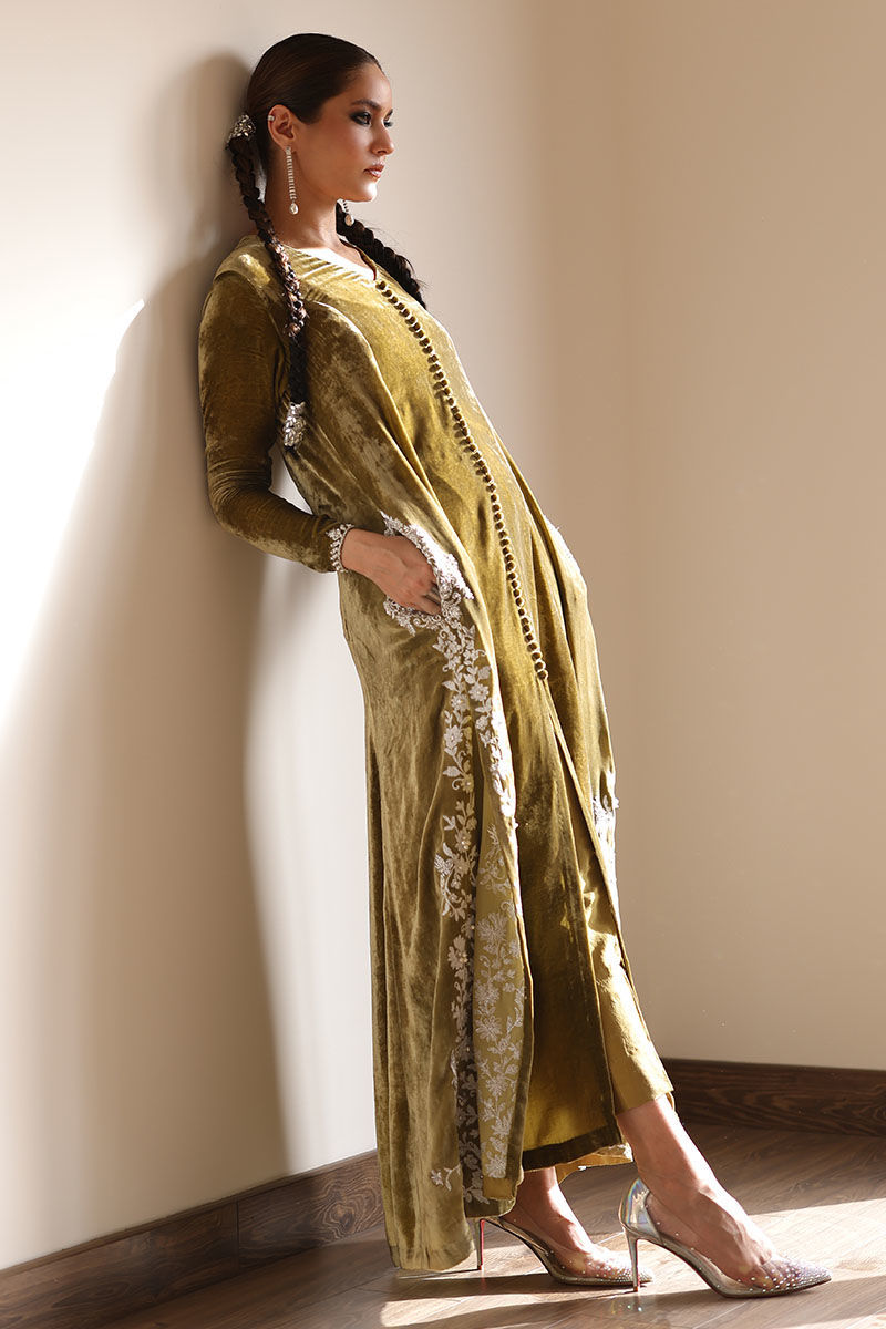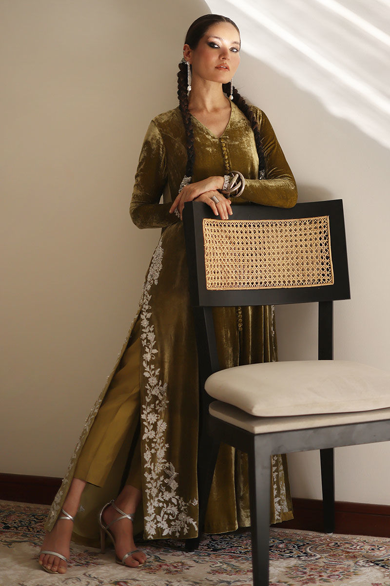 Step into elegance with our sugar cane velvet prince panel shirt ensemble. This sugar cane hue exudes sophistication, and the exquisite ivory resham ari work, hand-touched on all four side slits, adds an artisanal touch. To complete the ensemble, the shirt features pure zardozi handwork of dabka and naqshi on the pockets. To complete your look pure raw silk pants, offer the ideal balance of comfort and style.
