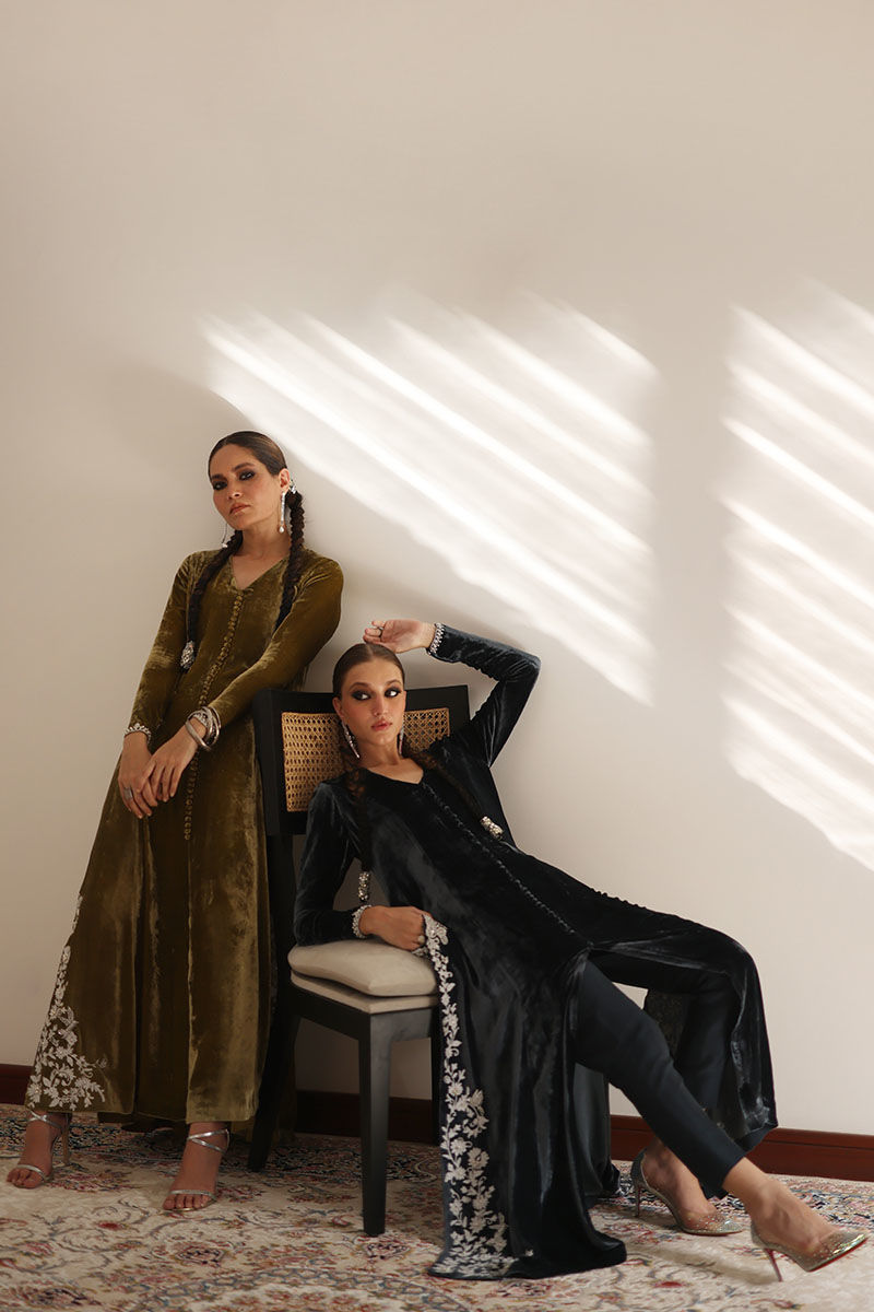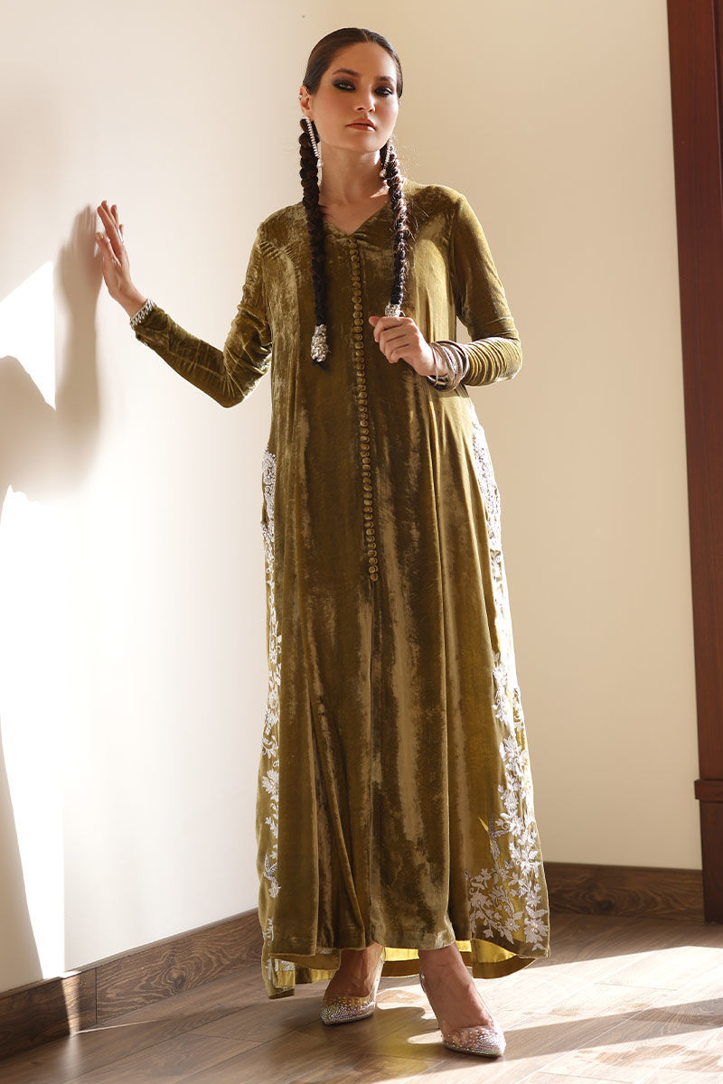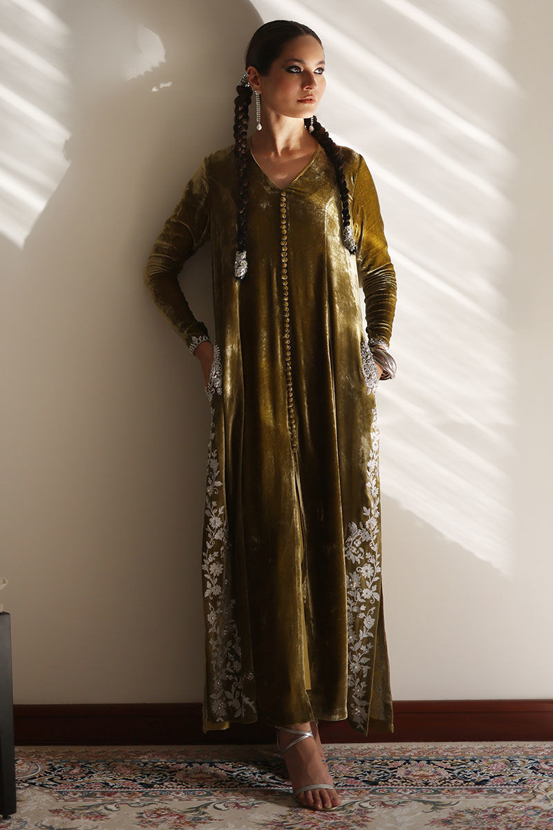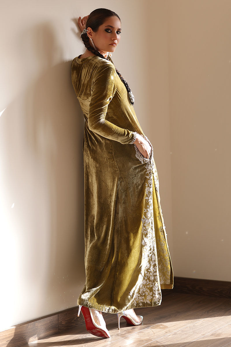 Step into elegance with our sugar cane velvet prince panel shirt ensemble. This sugar cane hue exudes sophistication, and the exquisite ivory resham ari work, hand-touched on all four side slits, adds an artisanal touch. To complete the ensemble, the shirt features pure zardozi handwork of dabka and naqshi on the pockets. To complete your look pure raw silk pants, offer the ideal balance of comfort and style.