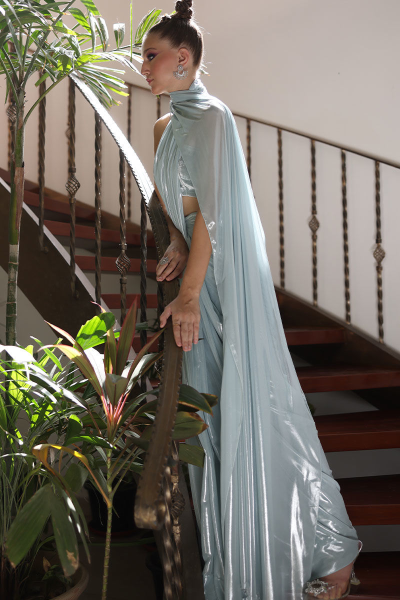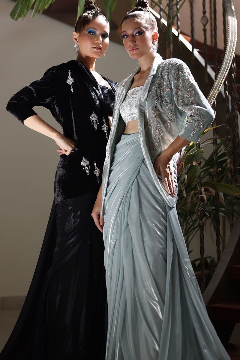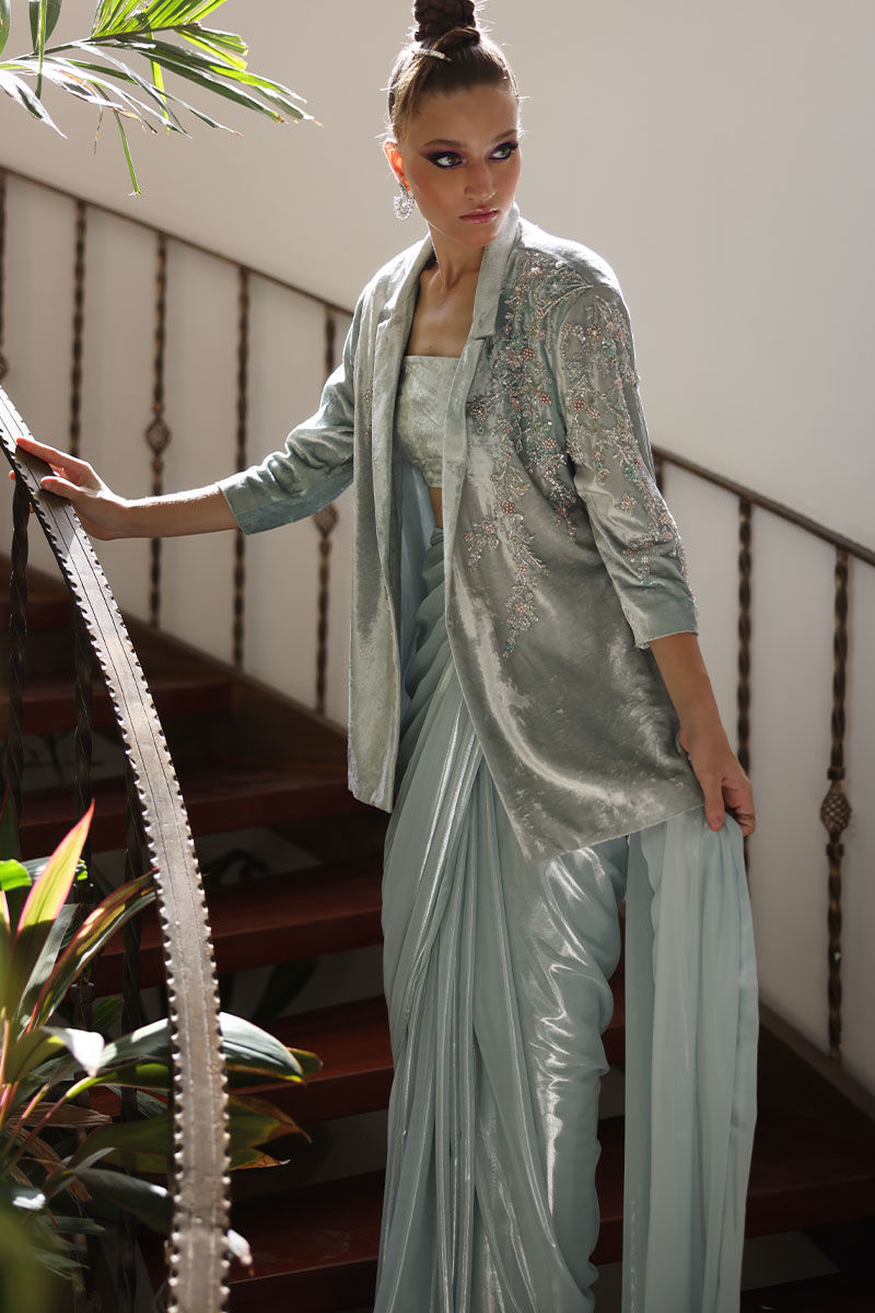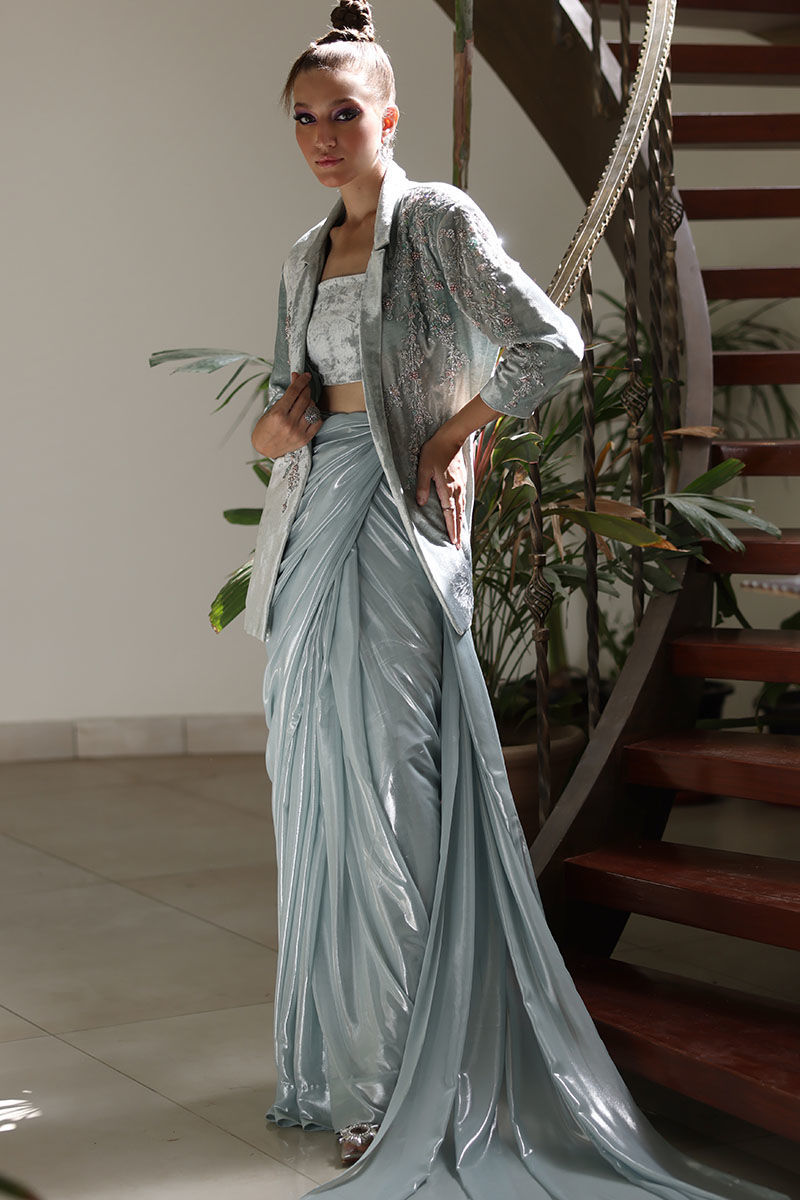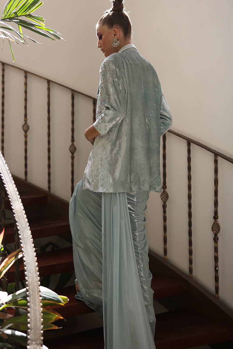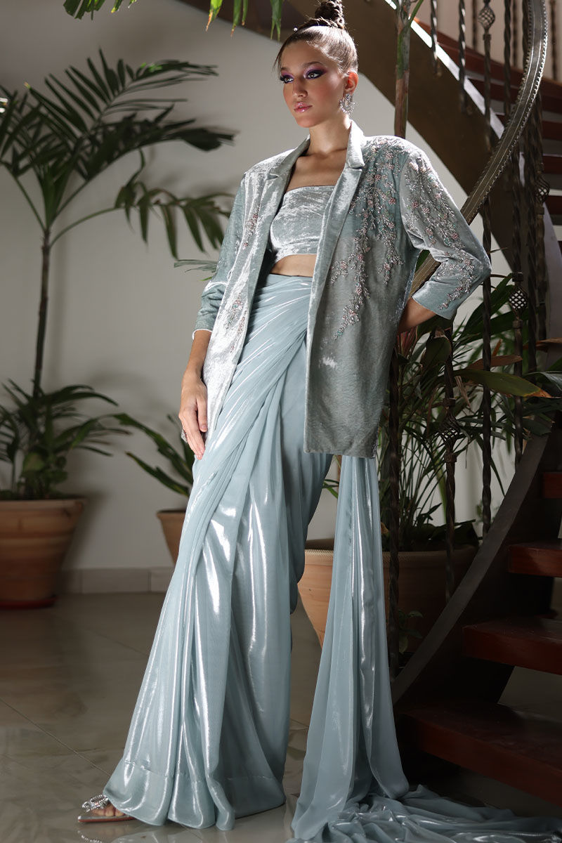 Elevate your style with our winter sky silk velvet blazer and lame chiffon stitched saree ensemble. The pure silk velvet blazer, in a calming winter sky hue, exudes sophistication with its intricate embroidery of crystals, cutdana, tiki stones, and pearls adorning the front and sleeves. Paired with a chiffon lame stitched saree in the same serene color, this ensemble seamlessly combines luxury and convenience. The saree comes with a spaghetti-strapped short blouse, and the length can be tailored to the client's preference. This outfit is a testament to timeless elegance, designed to make a lasting impression at any special event.