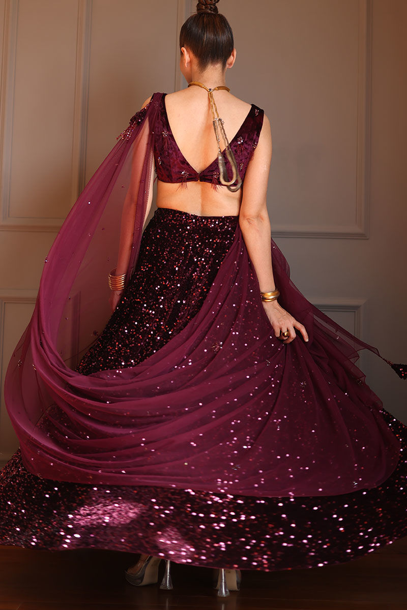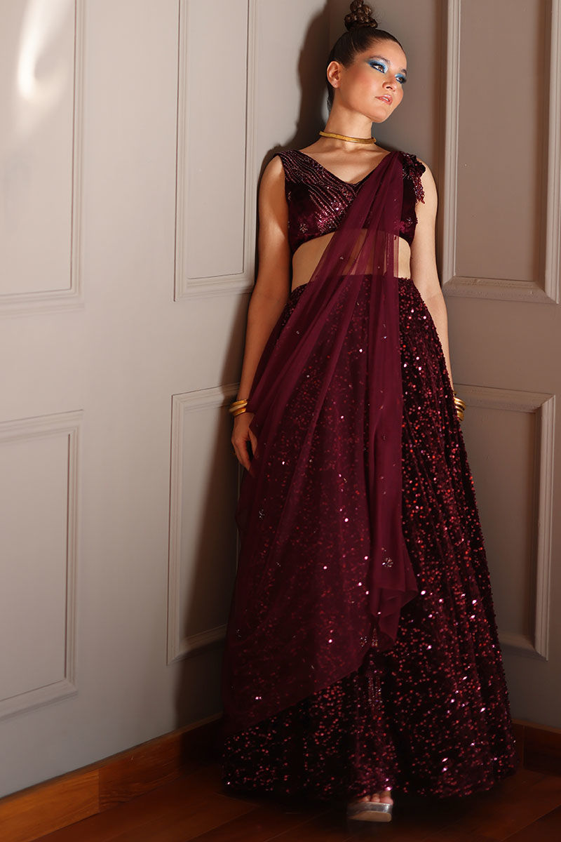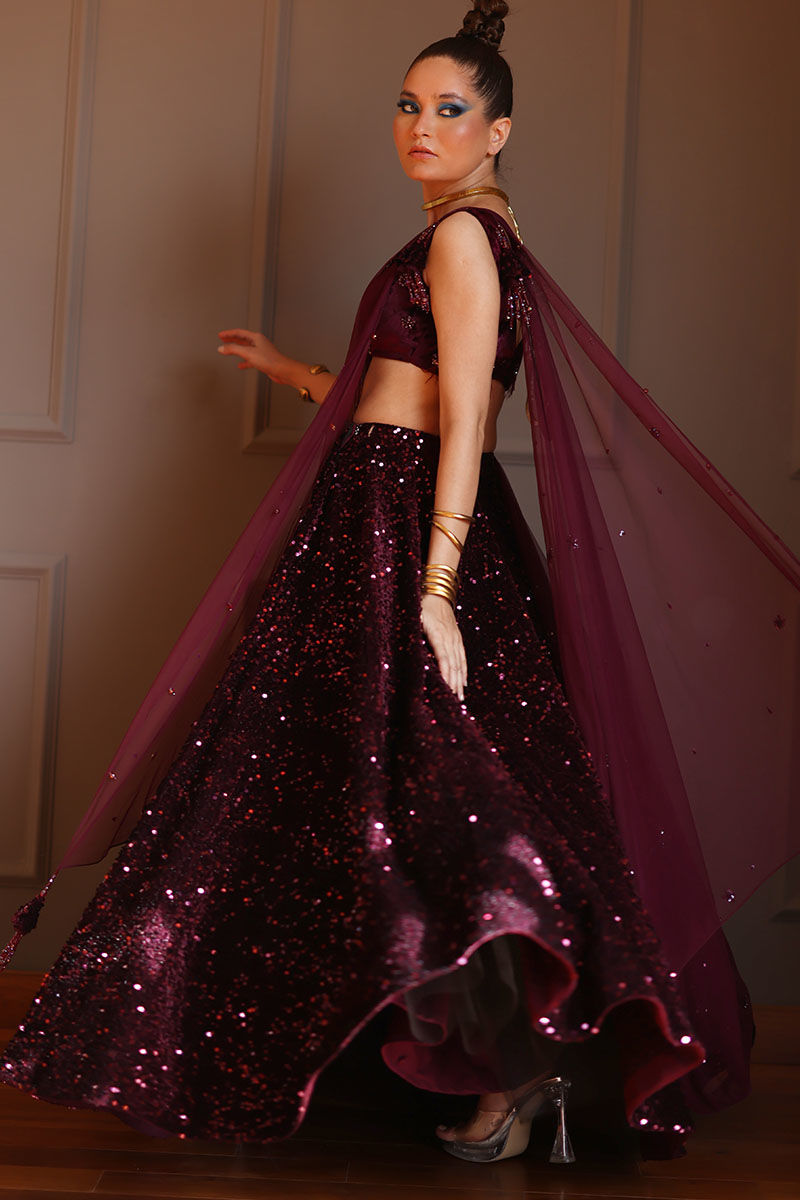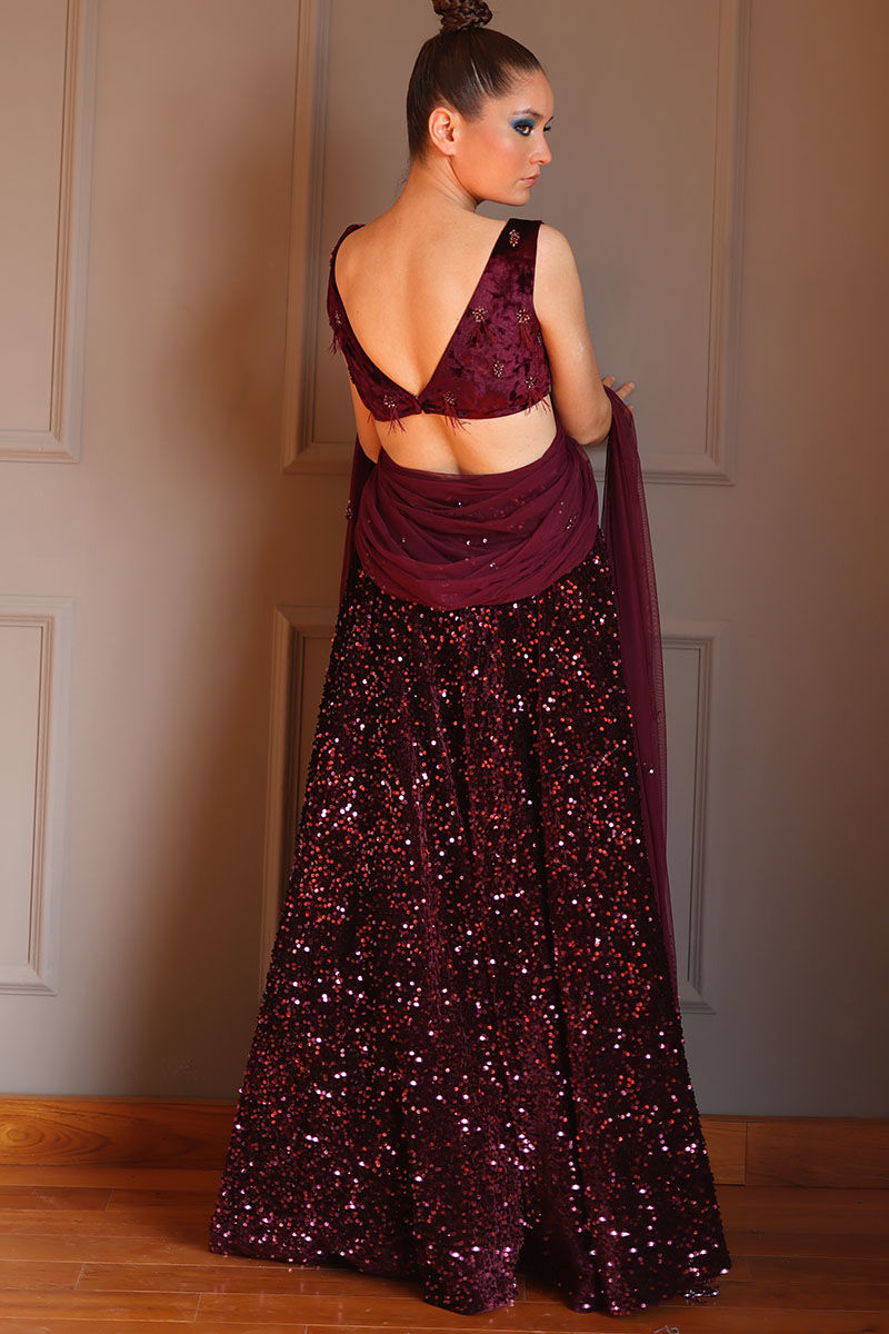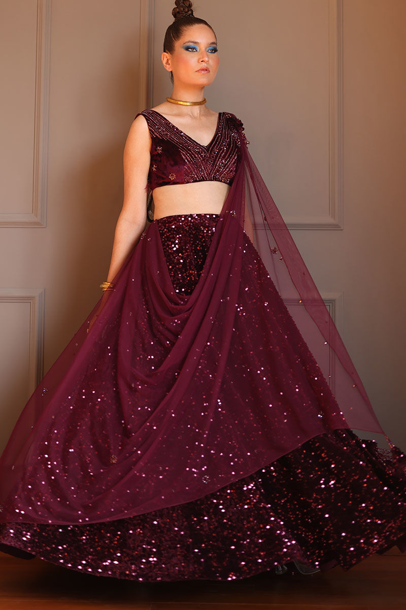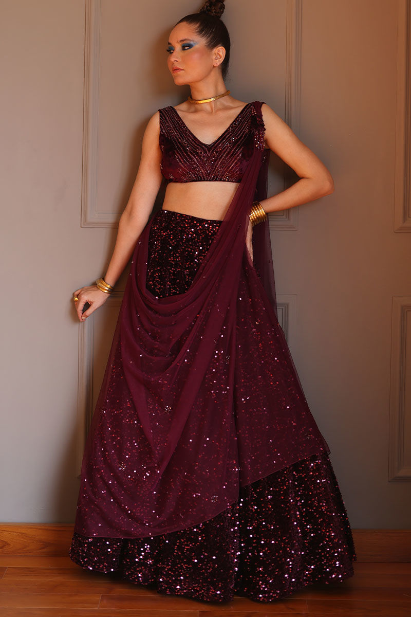 Adorn yourself in timeless elegance with our burgundy lehnga choli ensemble. The blouse, intricately handworked with kora, dabka, naqshi, sequence, moti, cutdana, and crystals, offers flexibility with optional sleeves and adjustable length. The velvet lehnga, embellished with matching sequence work, exudes opulence, while the handmade tessal-adorned dupatta adds a final touch of sophistication. This ensemble is a perfect fusion of tradition and modernity, curated for those seeking a refined and regal look for special occasions.