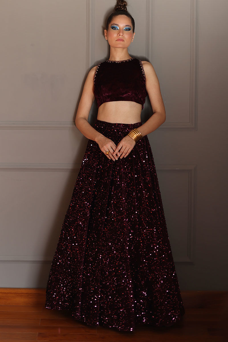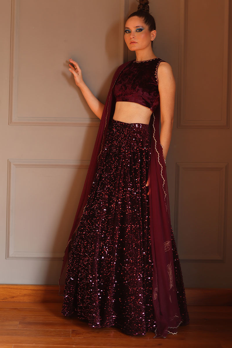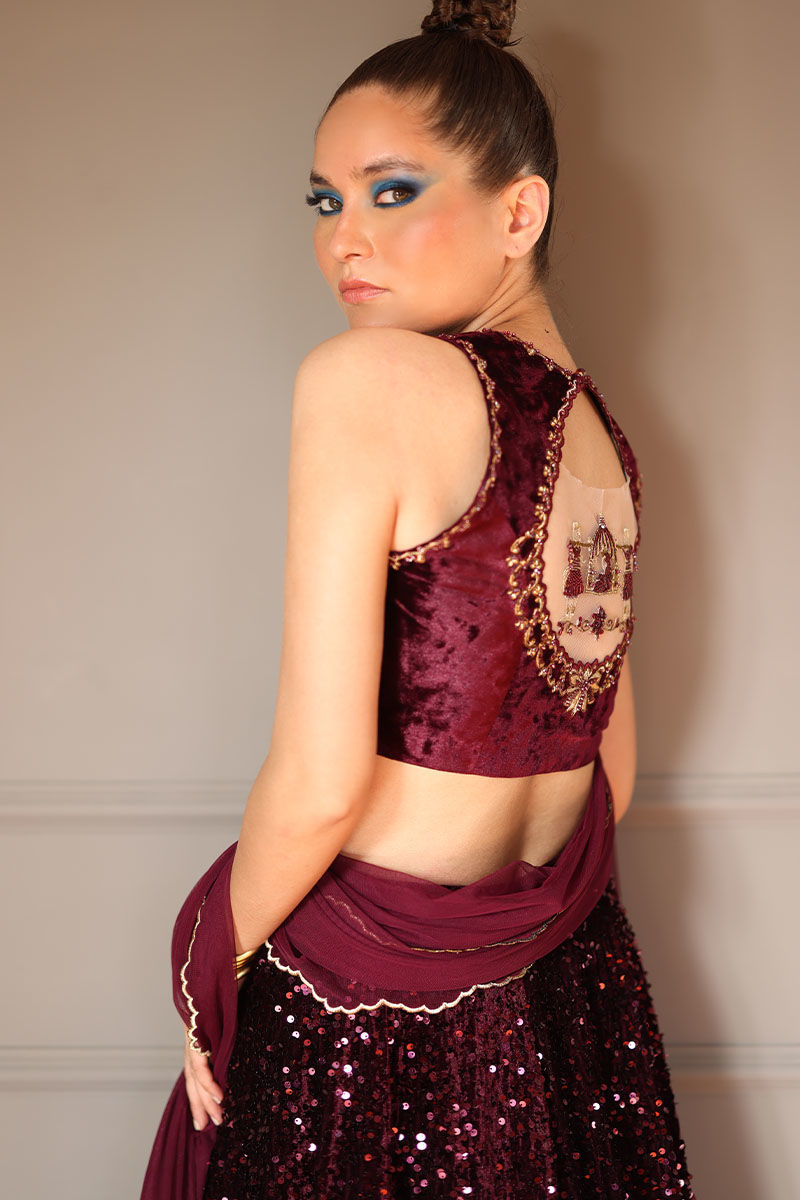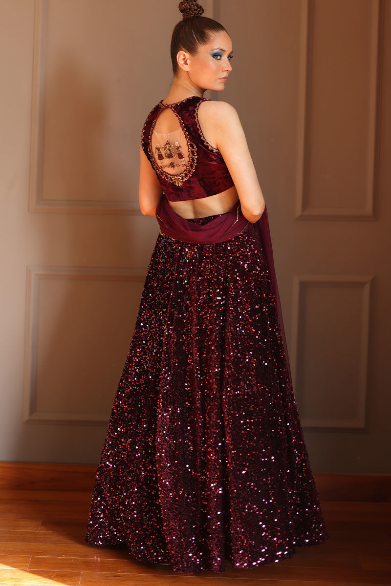 Elevate your grace with our Burgundy Lehnga Choli Ensemble. The zari and zardozi embellished blouse, with optional sleeves, exudes regal charm. The velvet lehnga, adorned with matching sequence work, strikes the perfect balance of luxury. Completing the look is a dupatta with scallop’s embroidery and motifs, adding a touch of elegance. This ensemble is a fusion of tradition and modern sophistication, ensuring you stand out with timeless beauty at any event.