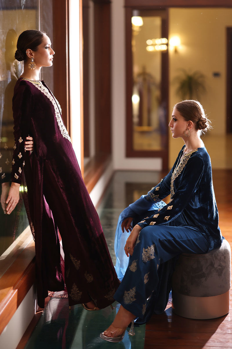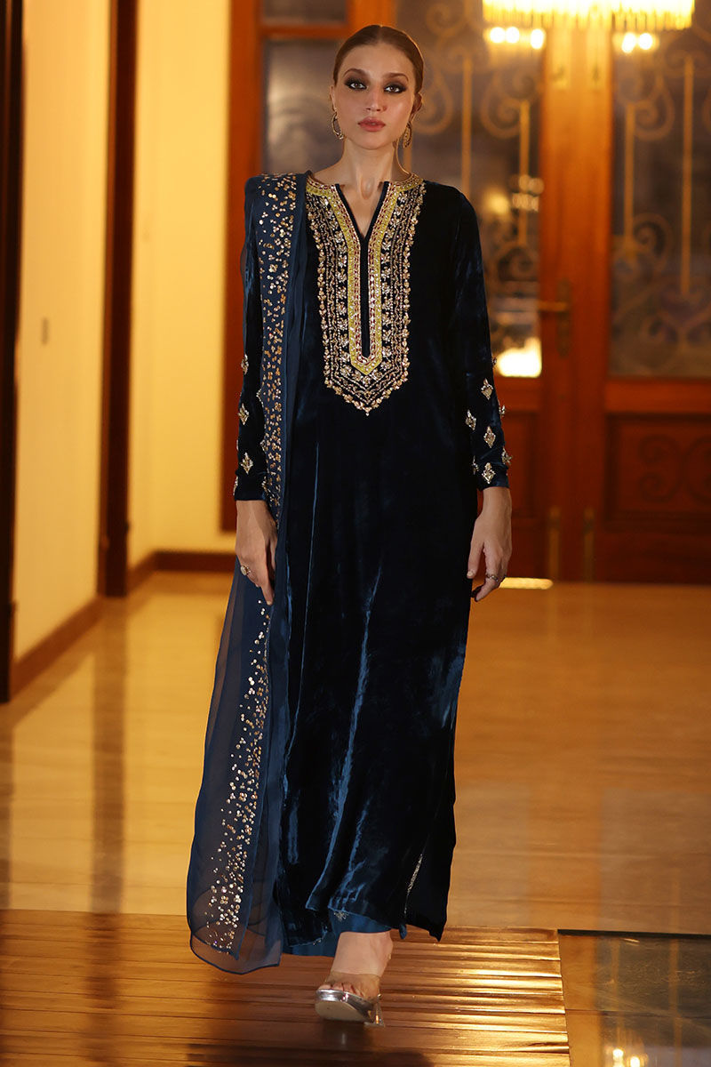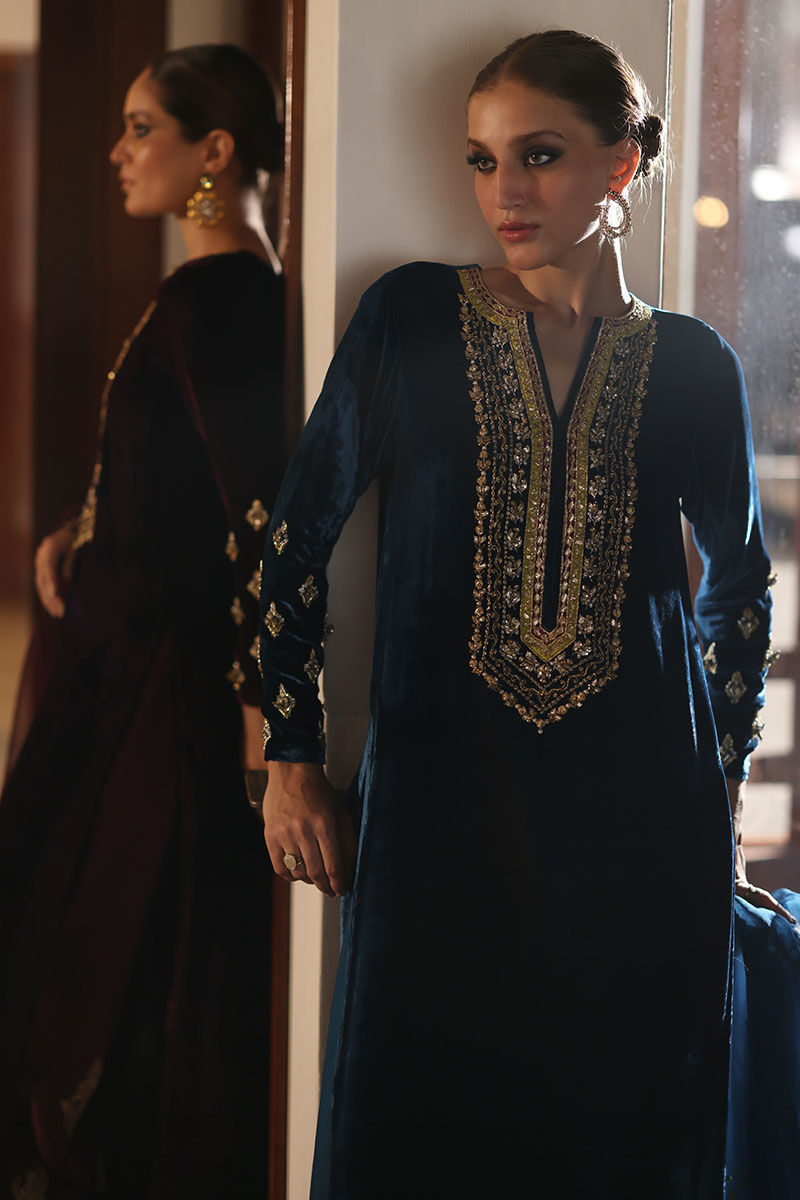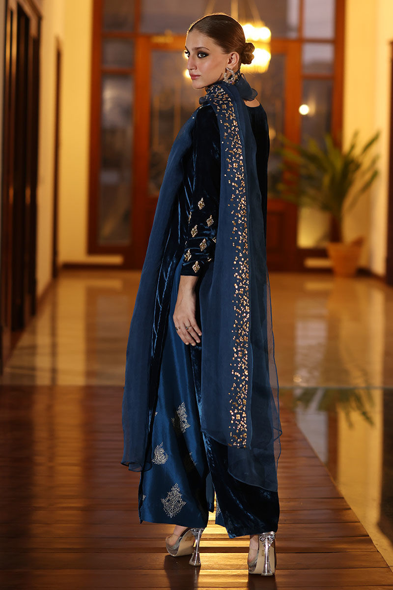 Step into sophistication with our deep teal velvet ensemble. The pure silk velvet shirt, in a mesmerizing deep teal hue, features intricate zardozi work with kora, dabka, naqshi, tiki stone, gota, and sequins. Complemented by pure raw silk culottes adorned with resham motifs and a pure organza dupatta with sequence work on one side border, this ensemble is a perfect blend of regality and modern elegance. Make a statement of grace at any special occasion with this exquisite ensemble.
