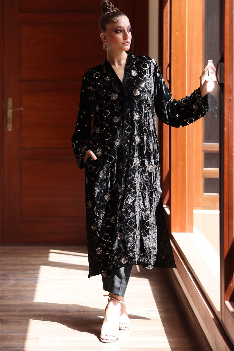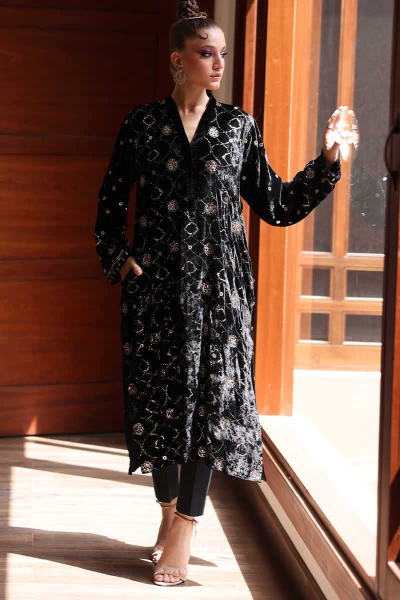 Wrap yourself in elegance with our black velvet kamdani kurta Ensemble. The pure silk velvet kurta, in timeless black, features exquisite handwork kamdani by Indian artisans in varied patterns. Pockets on both sides add a practical touch. Paired with pure raw silk 80 gms pants, this ensemble is a perfect blend of comfort and sophistication. Make a stylish statement at any event with this classic black ensemble.