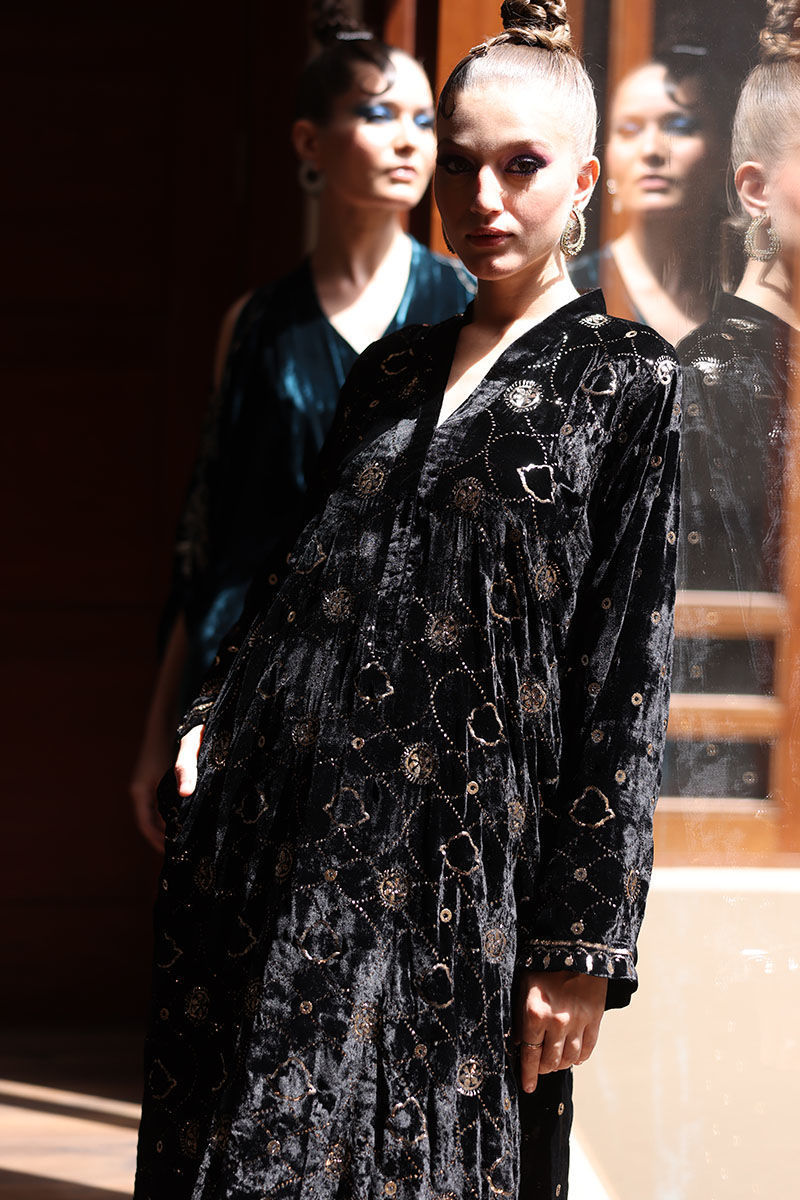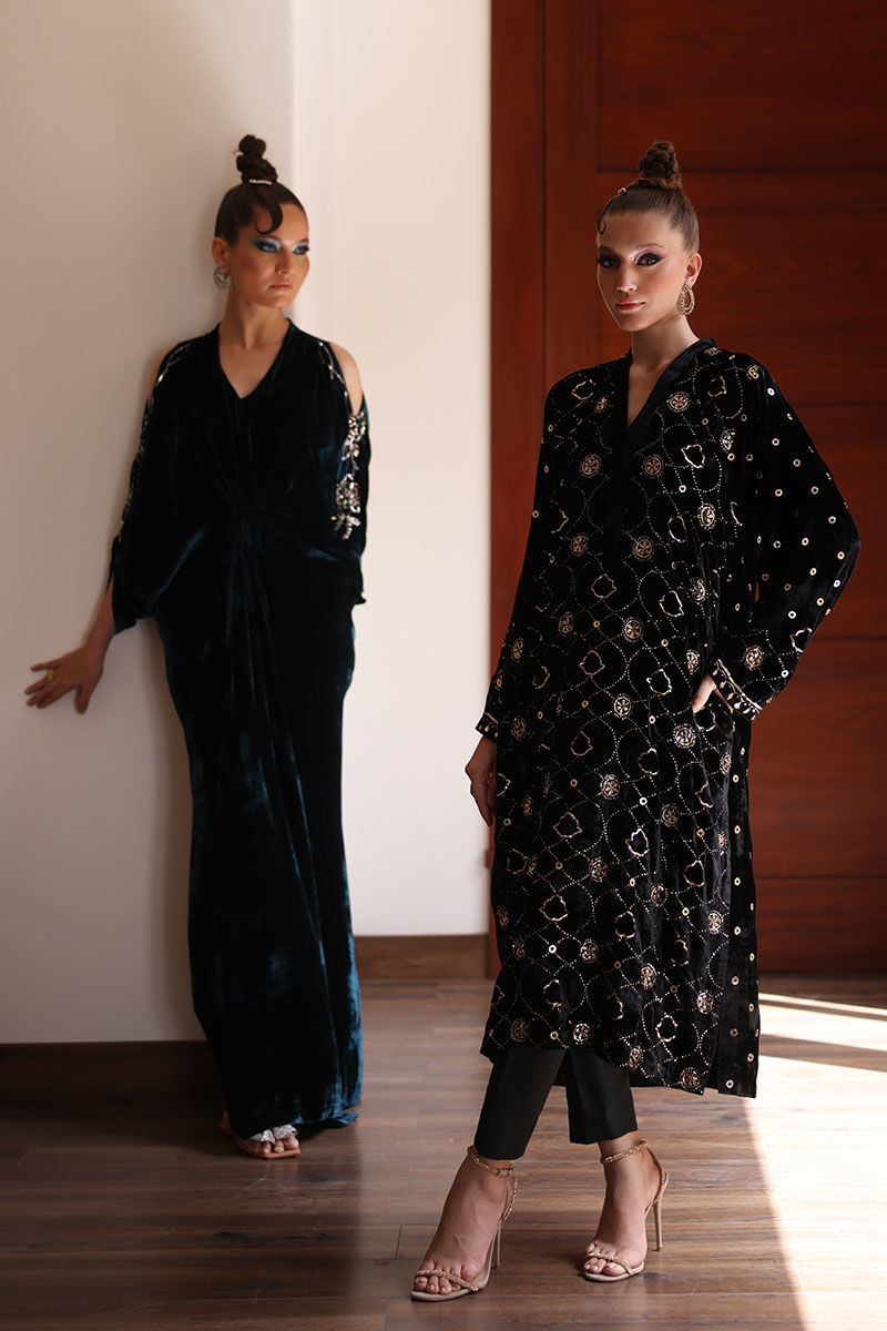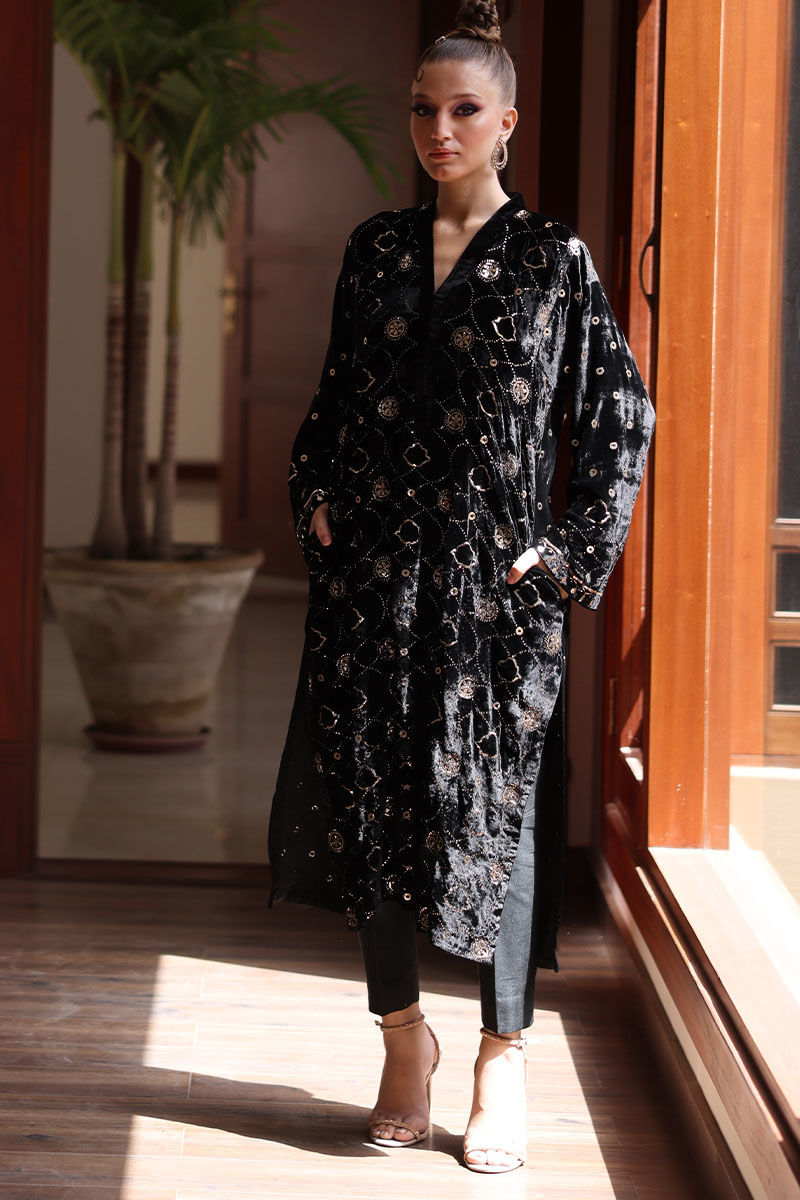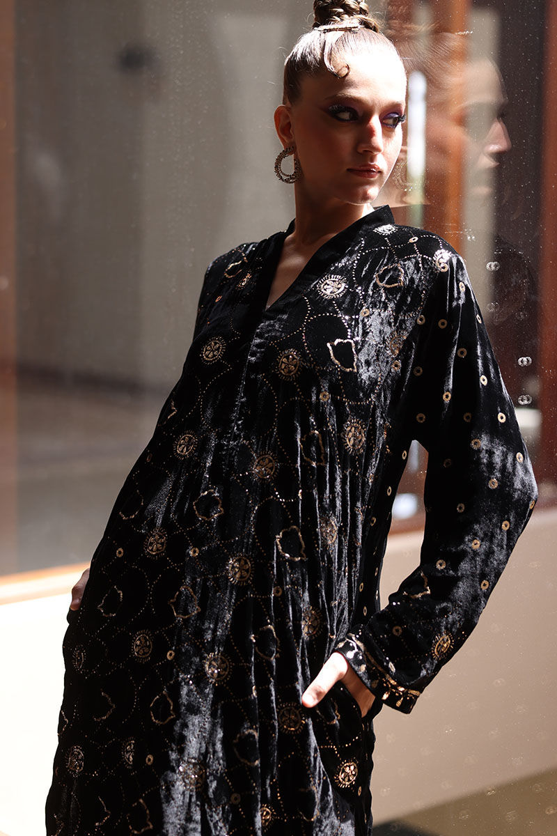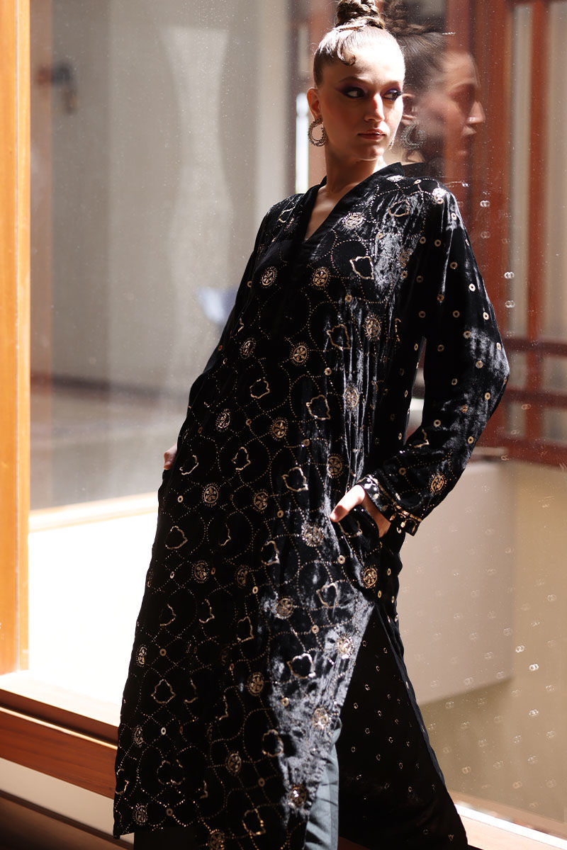 Wrap yourself in elegance with our black velvet kamdani kurta Ensemble. The pure silk velvet kurta, in timeless black, features exquisite handwork kamdani by Indian artisans in varied patterns. Pockets on both sides add a practical touch. Paired with pure raw silk 80 gms pants, this ensemble is a perfect blend of comfort and sophistication. Make a stylish statement at any event with this classic black ensemble.