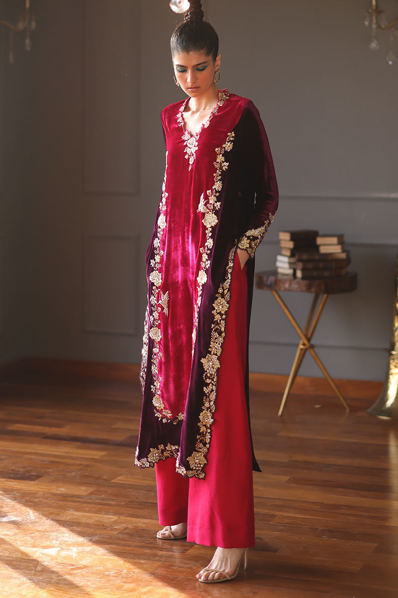 Drape yourself in sophistication with our shadow plum velvet ensemble. The pure silk velvet shirt, in a captivating shadow plum color block, features intricate zari, kora, dabka, naqshi, tiki stone, and sequence work on sleeves and neckline. Paired with pure rawsilk cullottes and a diamond organza silk dupatta with Sequence Chan detailing, this ensemble is the epitome of elegance. Make a statement of refined style at any event with this exquisite ensemble.