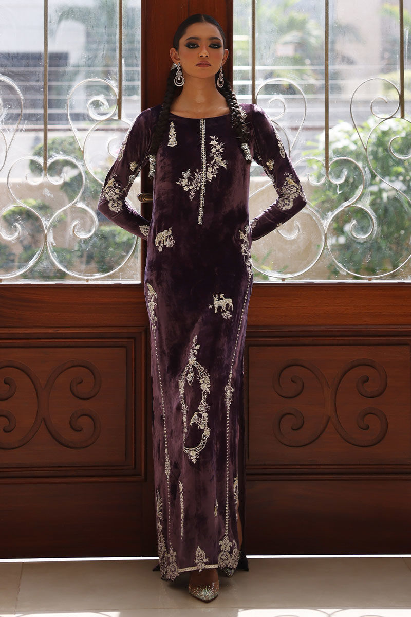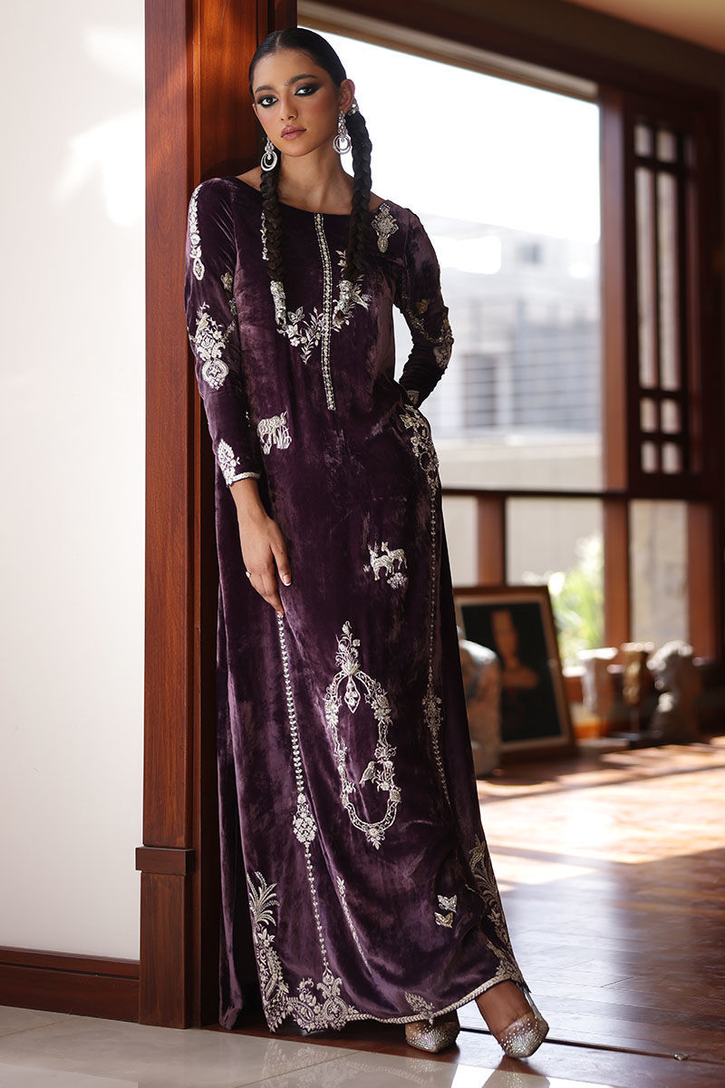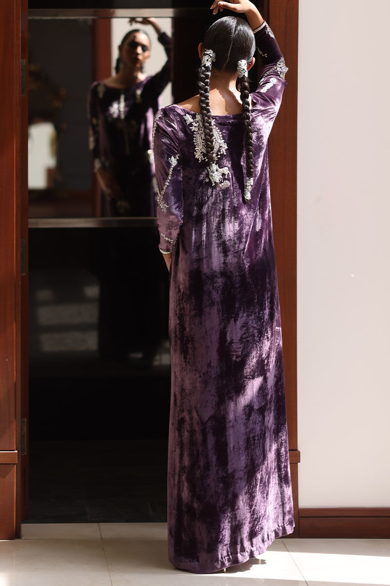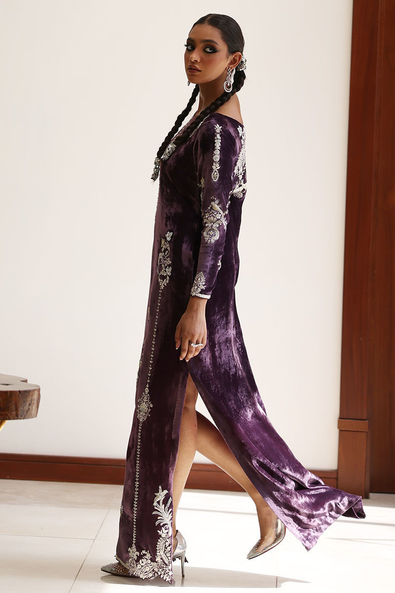Elevate your style with our lavender aura silk velvet kaftan. This kaftan, in a soothing lavender hue, is meticulously embroidered with resham, kora, dabka, naqshi, cutdana, sequence, pearls, and stones on the front, back, and sleeves. It's the epitome of opulence and grace.