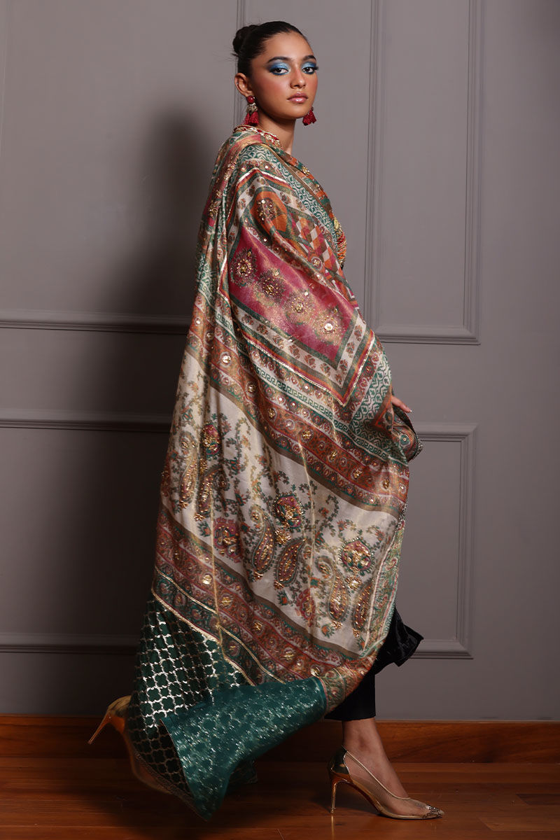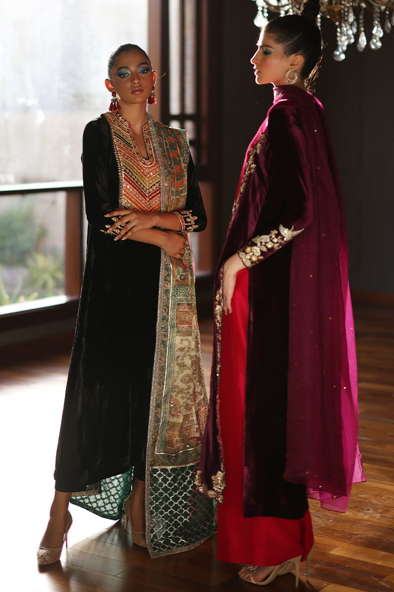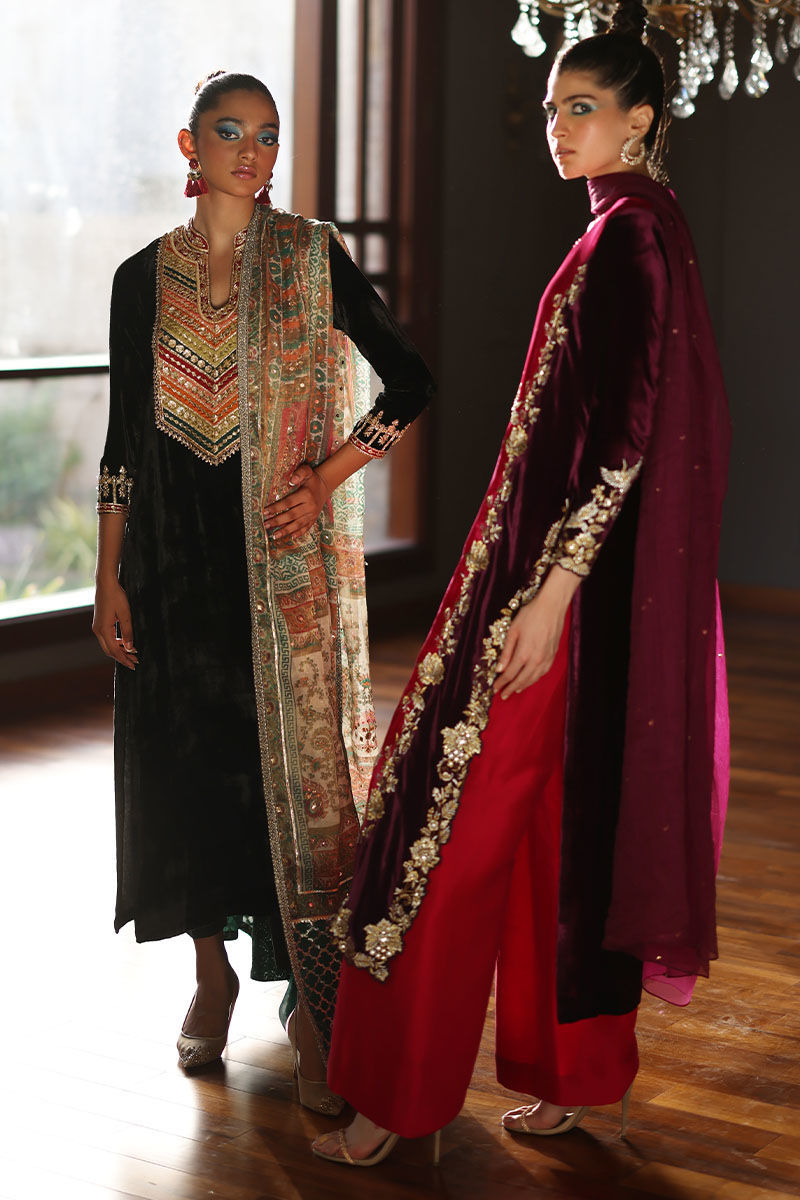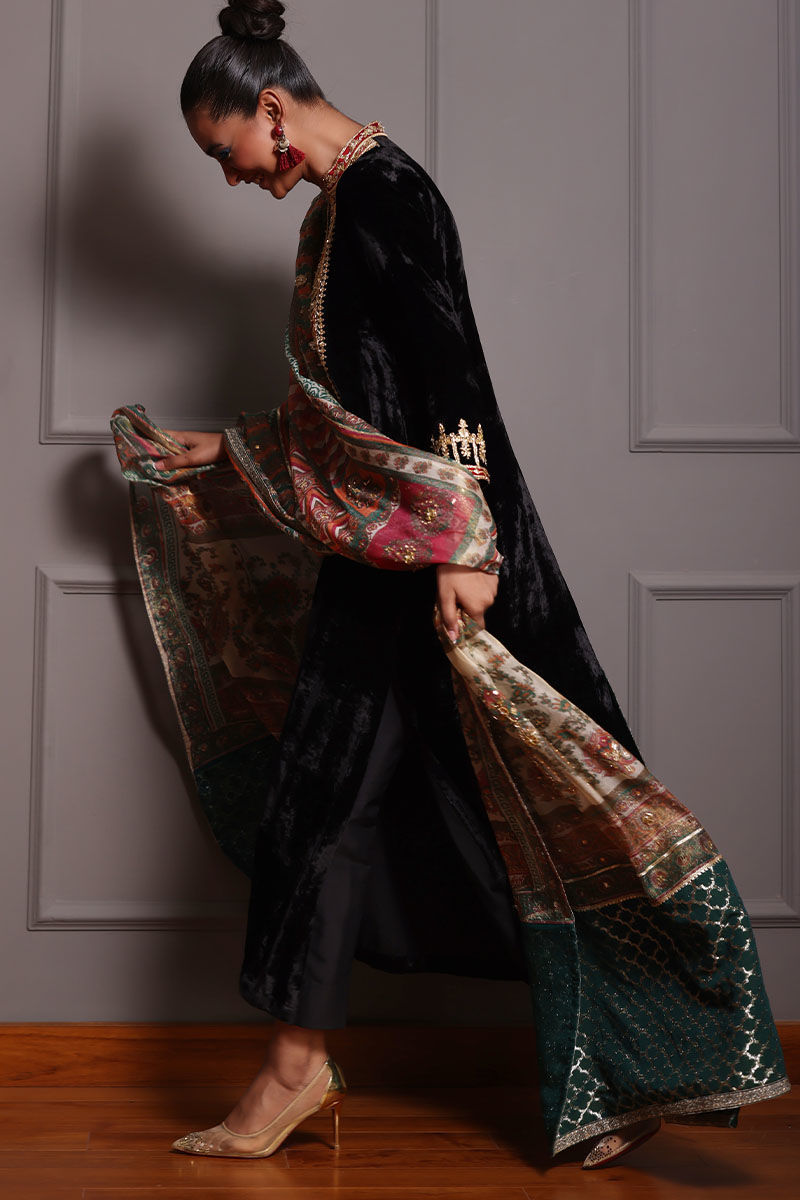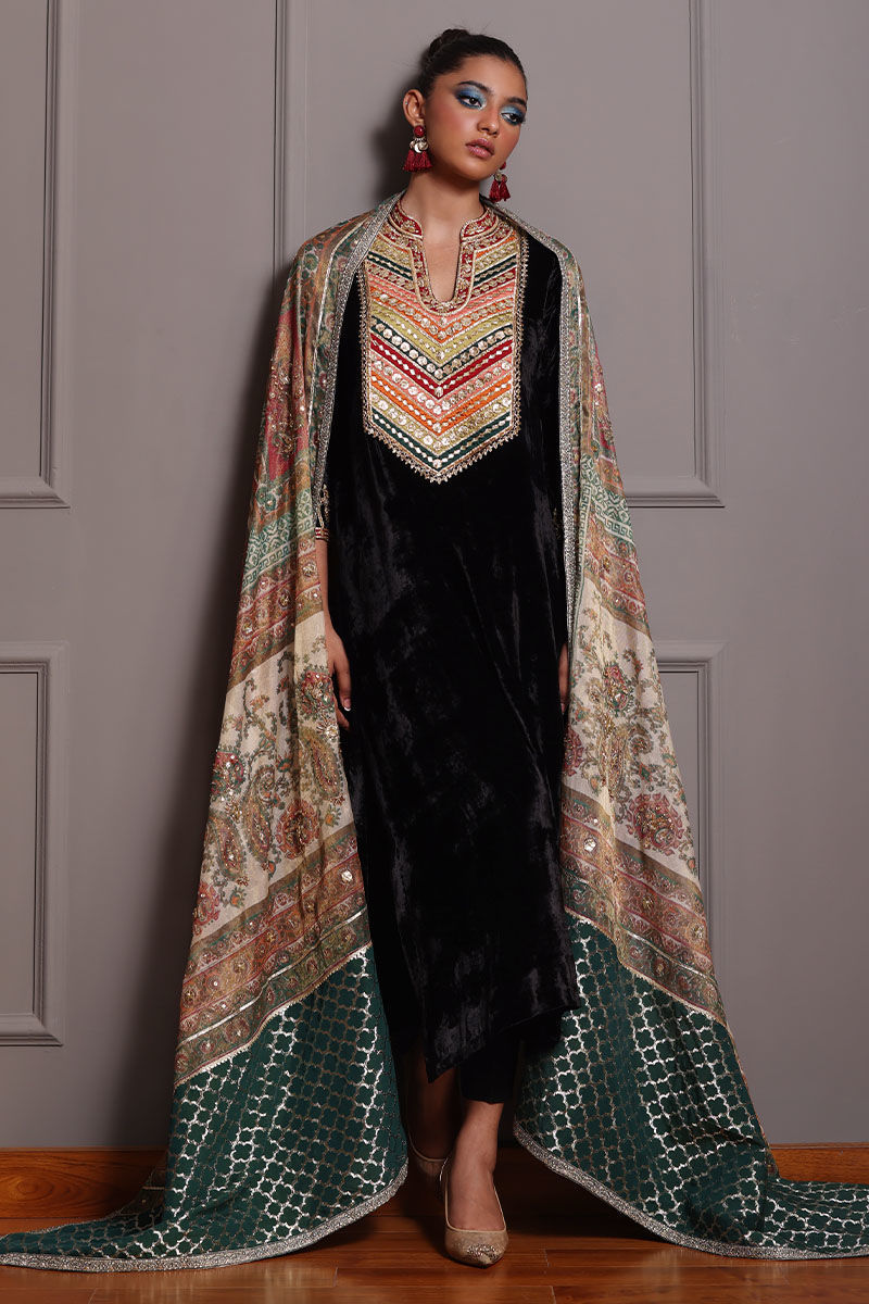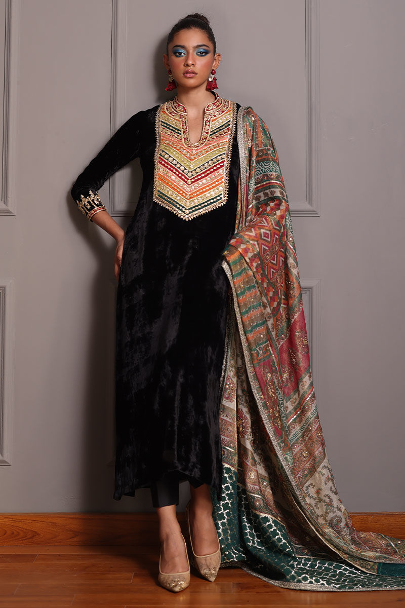 Elevate your style with our black A-line velvet ensemble. The pure silk velvet A-line shirt, in timeless black, features colorful appliques on the neckline and intricate zardozi work on sleeves and neckline. Paired with pure rawsilk 80 gms pants, and a screen-printed dupatta with zardozi work and sequence detailing, this ensemble strikes the perfect balance between sophistication and playfulness. Make a memorable entrance at any event with this exquisite ensemble.