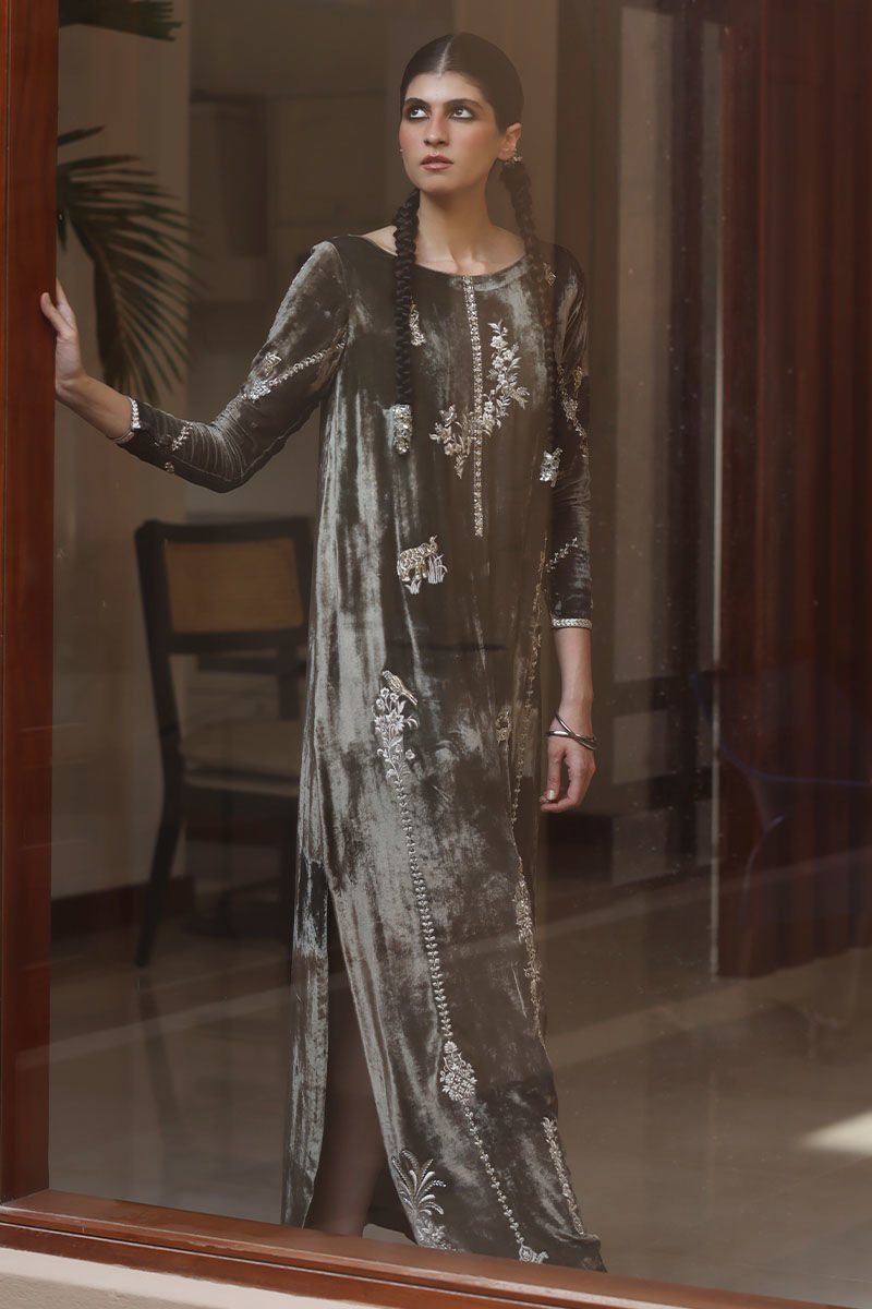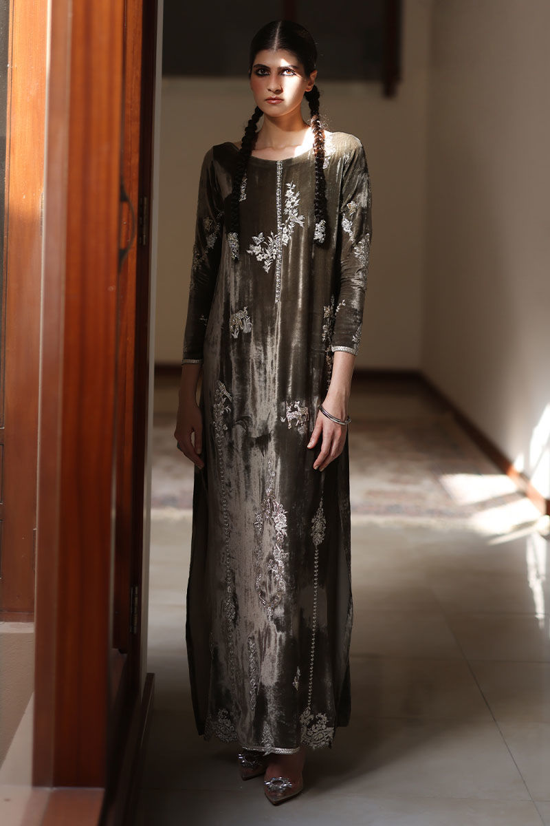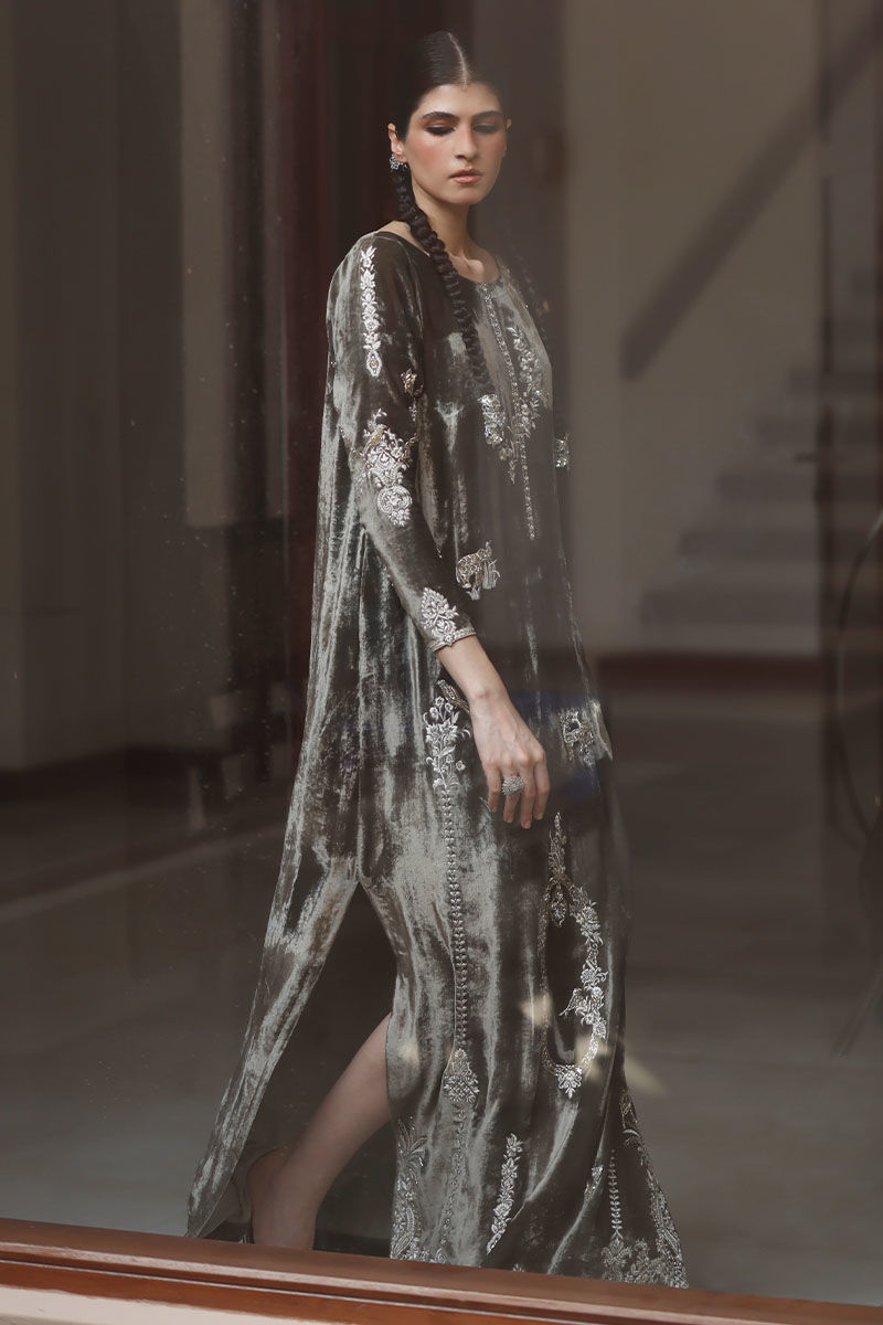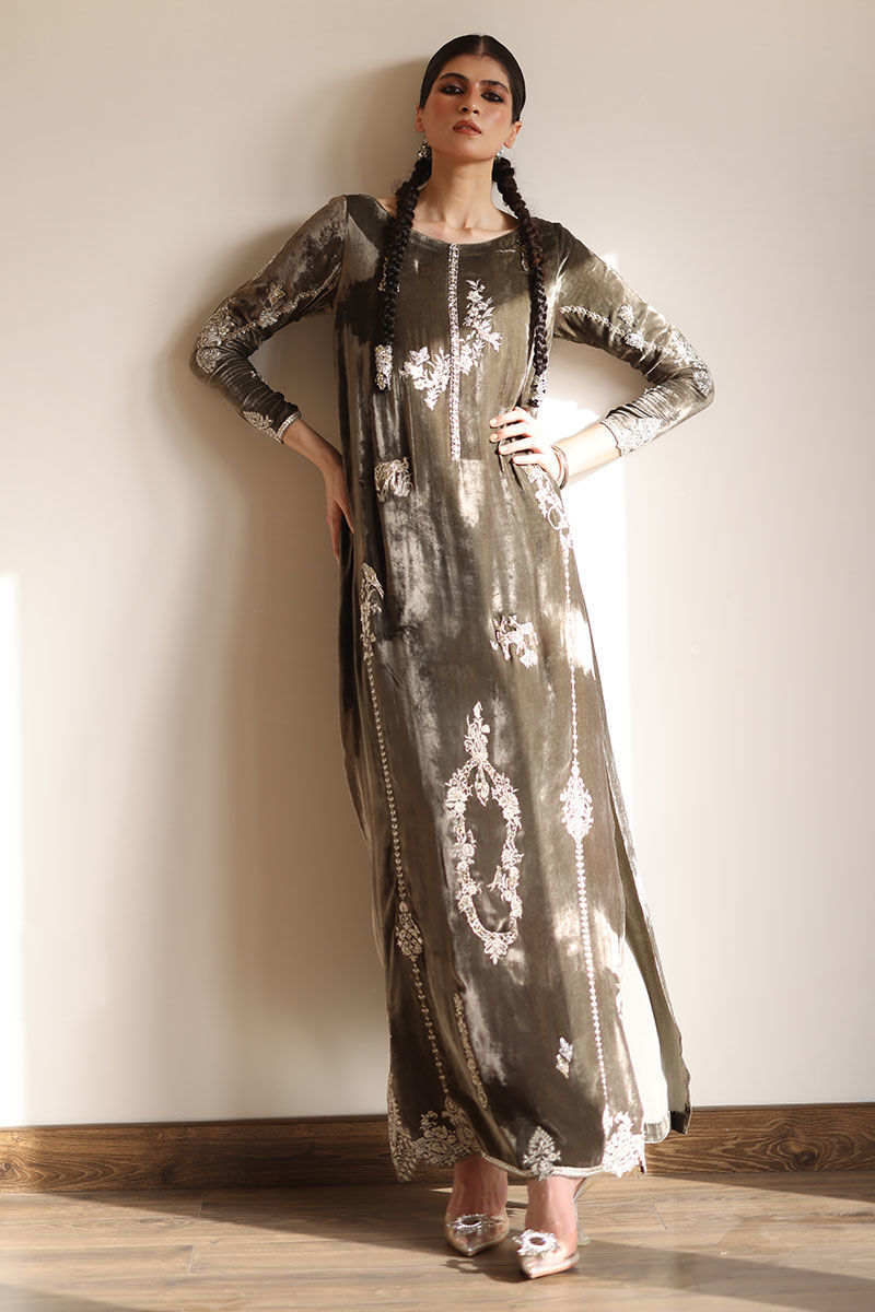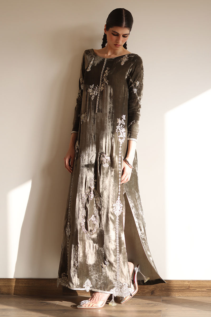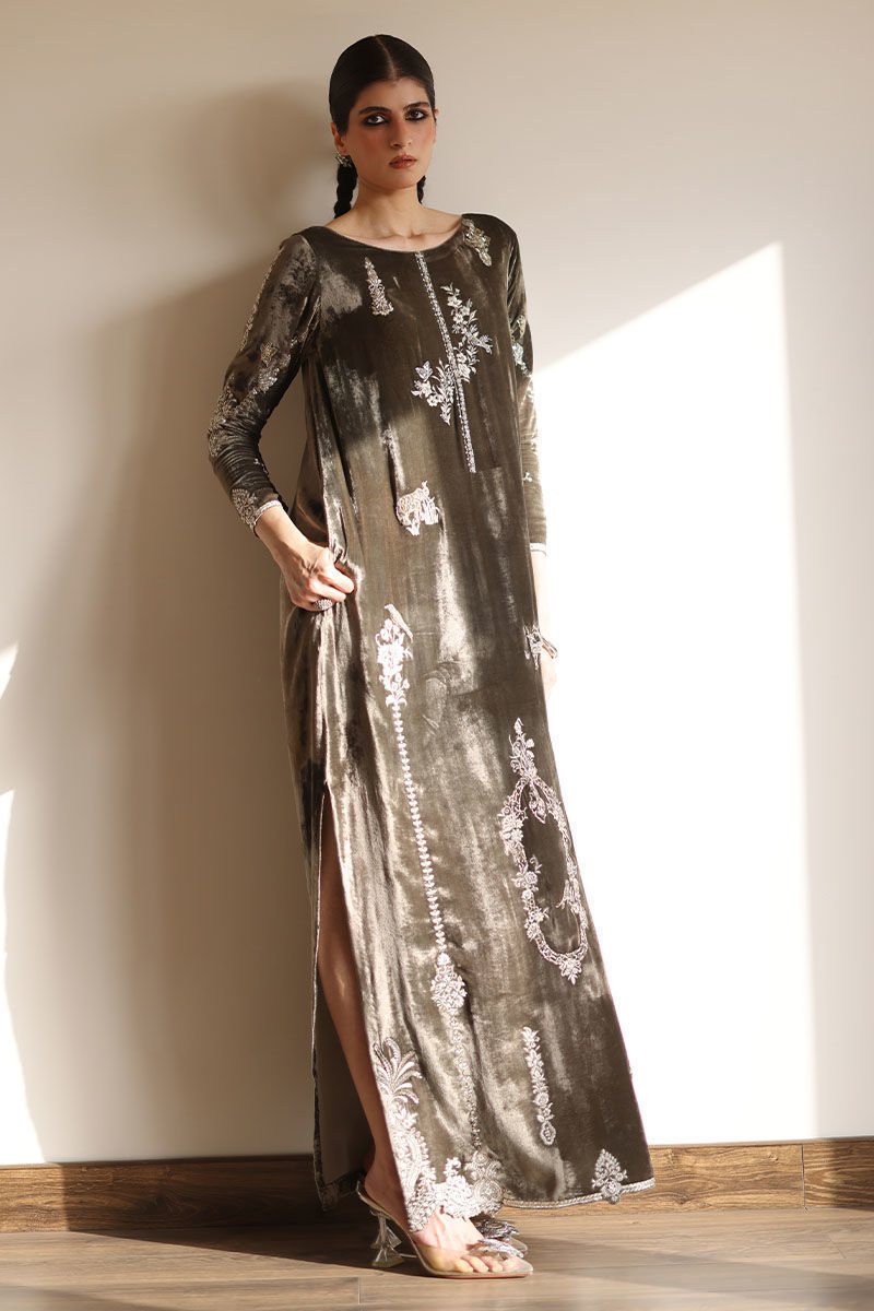 Elevate your style with our dark olive silk velvet kaftan. This kaftan, in a soothing olive hue, is meticulously embroidered with resham, kora, dabka, naqshi, cutdana, sequence, pearls, and stones on the front, back, and sleeves. It's the epitome of opulence and grace.