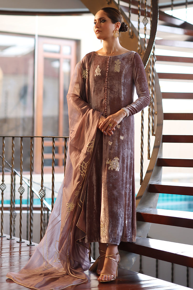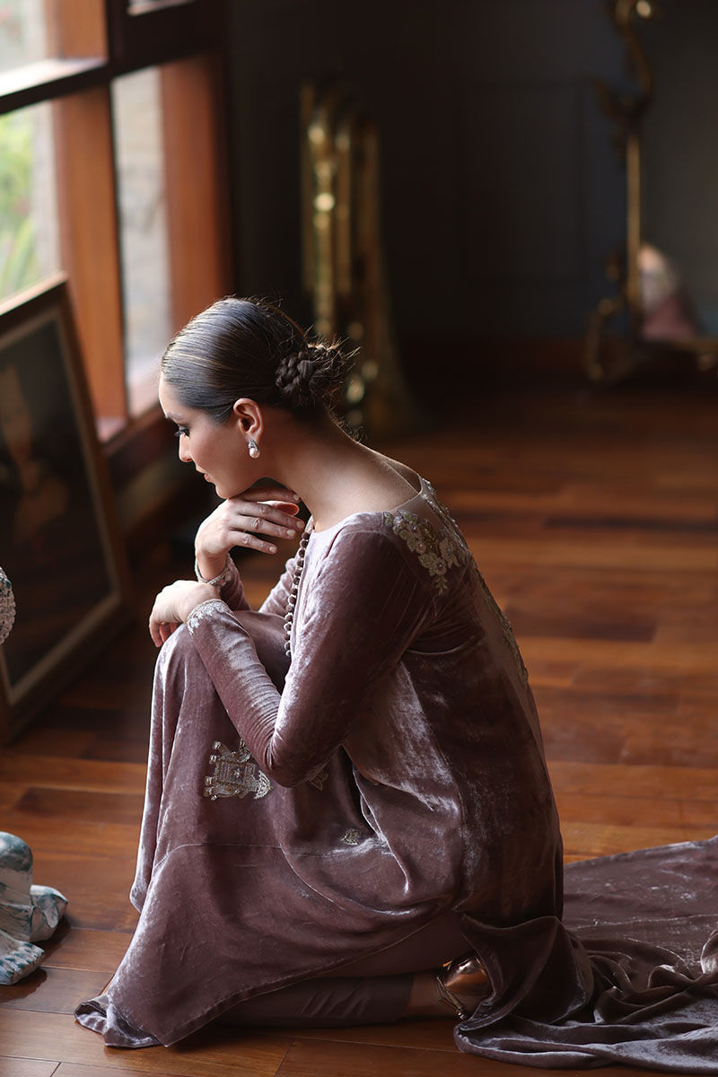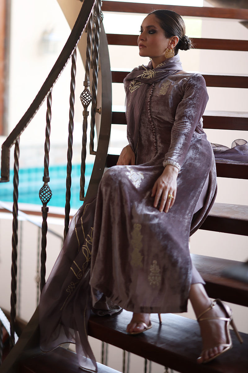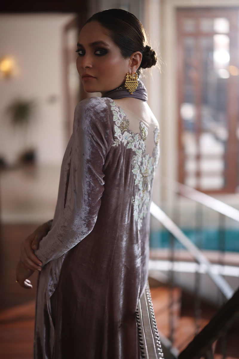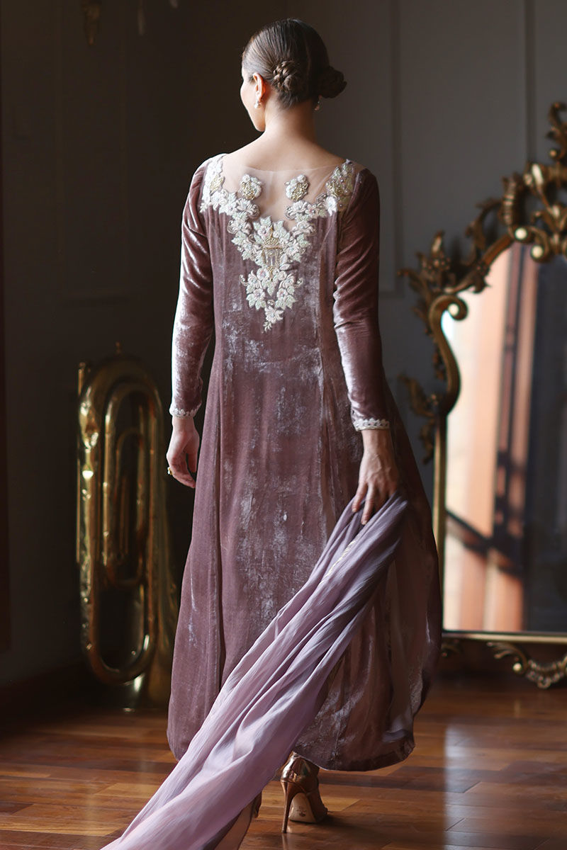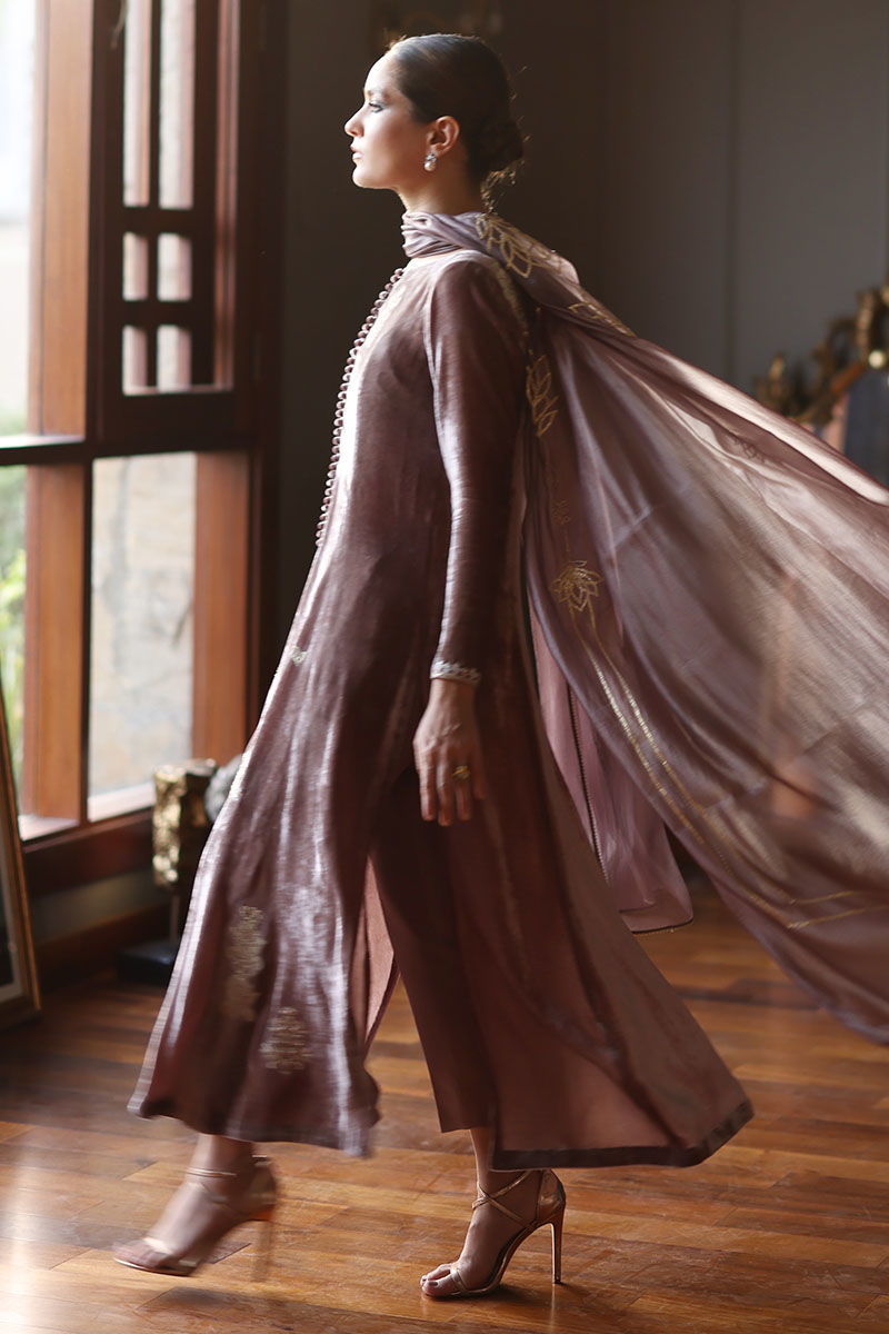 This quail color silk velvet prince panel ensemble is designed to make a statement at any event. The Mughal theme embroidery on the shirt is a work of art, boasting resham, zari, cutdana, tiki stones, naqshi, and pearls, creating a regal and captivating design. To complete this ensemble with pure raw silk pants and diamond organza silk dupatta, adorned with an all-over floral pattern embroidery, accentuated with exquisite gota dhanak work. It's finished with a four-sided edging graced with gota lace.