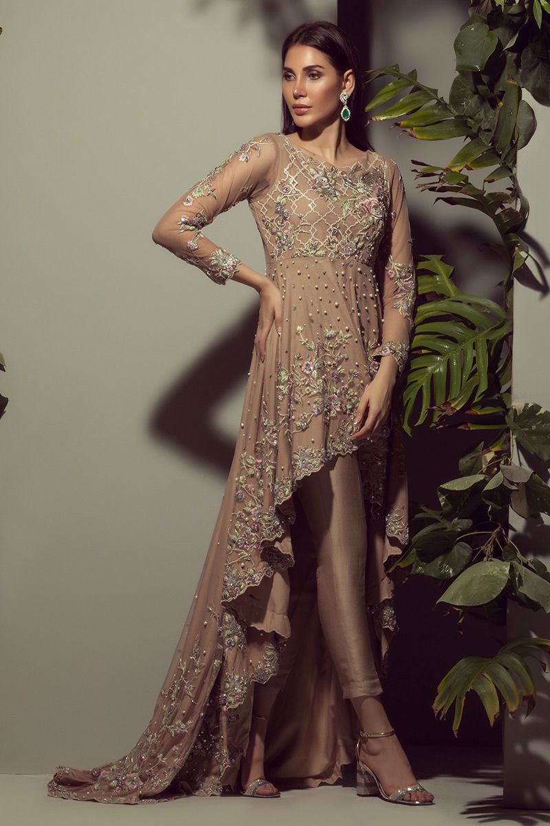 Net high and low gown gorgeously hand worked with extraordinary detailing of zardozi, naqshi, dabka, sequins, crystals, pearls, diamontes, resham, tila and motis. Pure raw silk is used to make pencil pants.