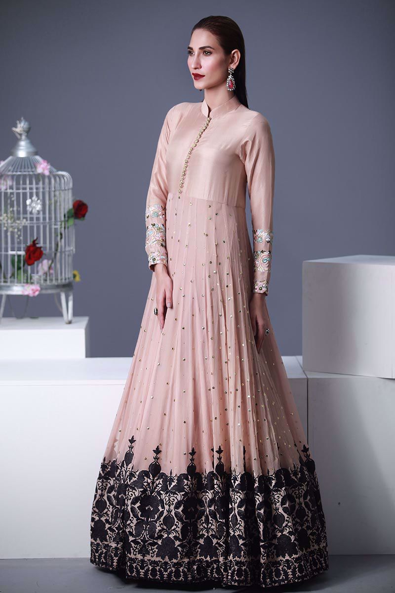 Nude kamdani flared top with black embroidery applique and eacute; on border. Pure raw silk bodice with gold Zari buttons and gold and antique embroidered borders on sleeves. Plain net yoke on back with stones and crystals embellishments.