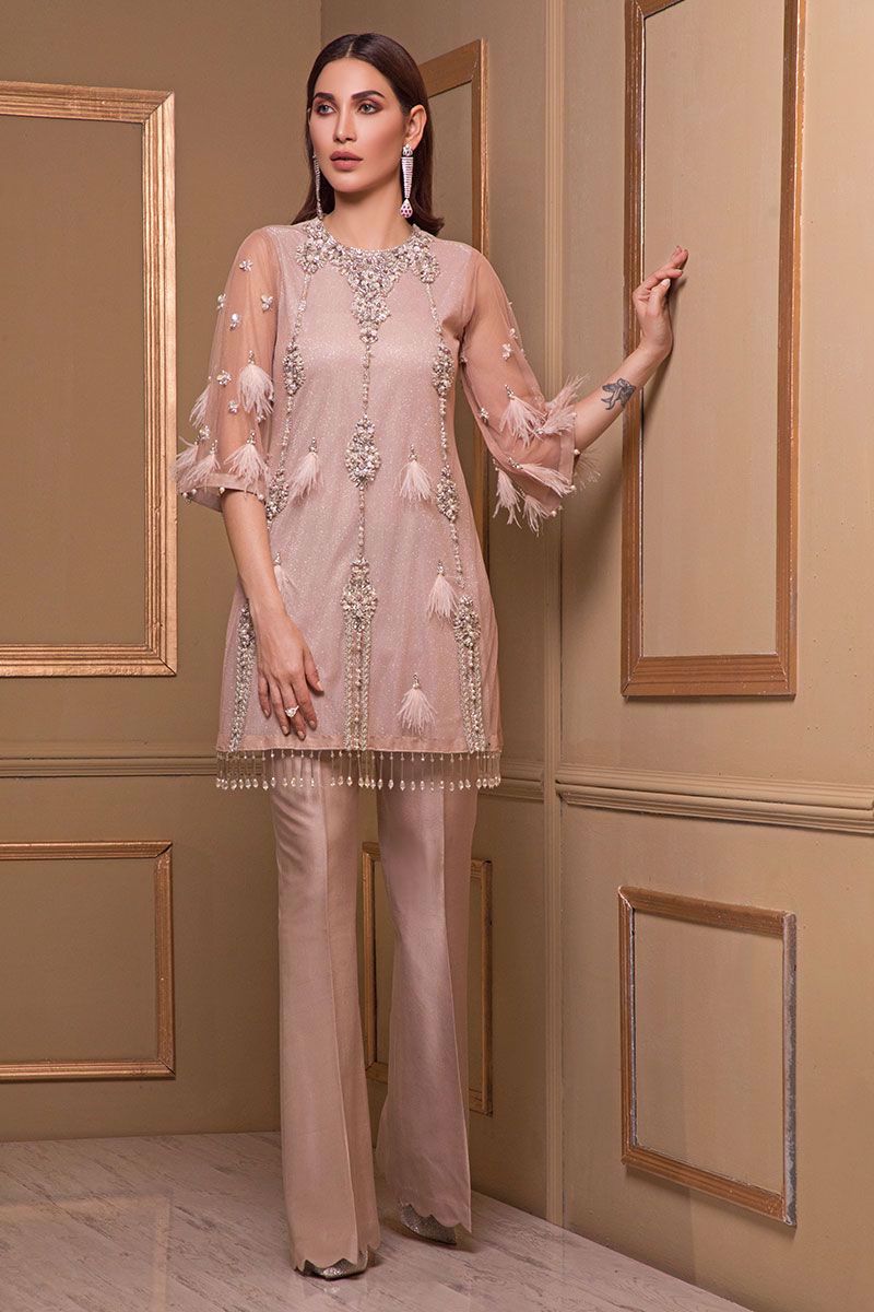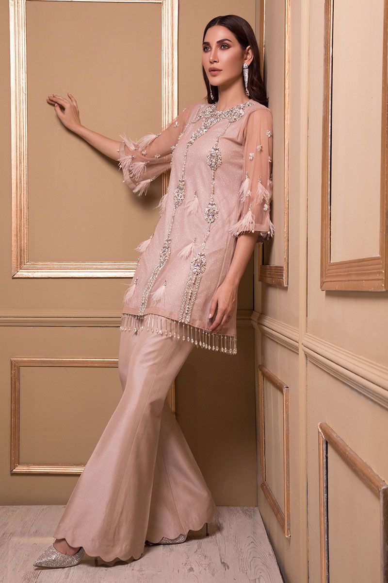 An effortless style statement soft nude colored net short shirt with glitter lining detailed with heavy jeweled neck with stones, pearls, dabka work, tikki stones, sequins and feathers. Same colored pure raw silk bootlegs will be provided with this top.
