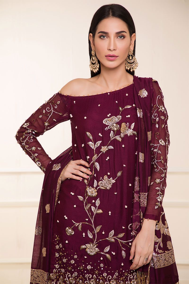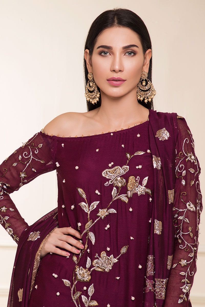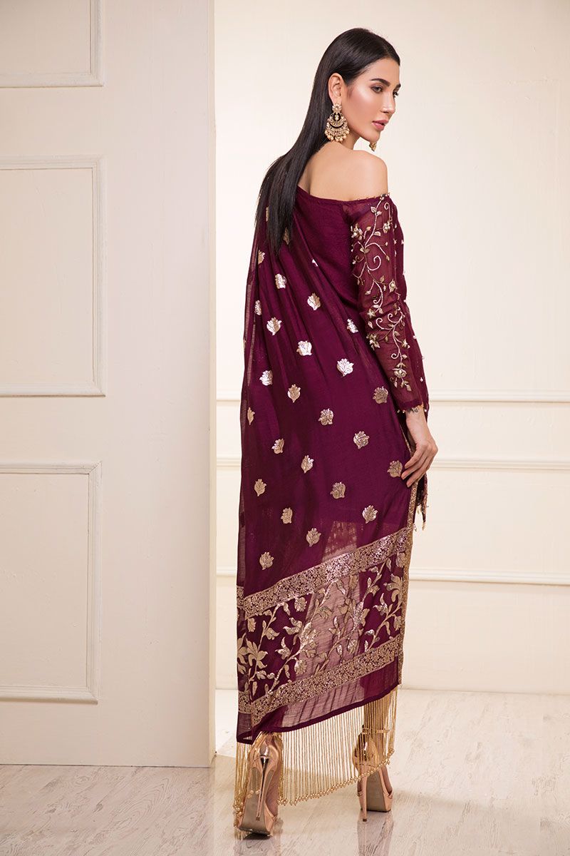Plum colored khaadi net heavily embroidered Shirt with gold and antique zari, stones, pearls and zardozi work along with plum and gold Dupatta and jamawar Pants.