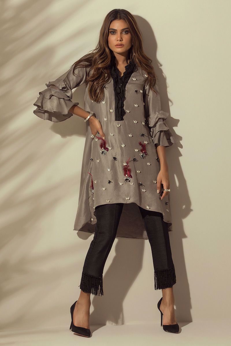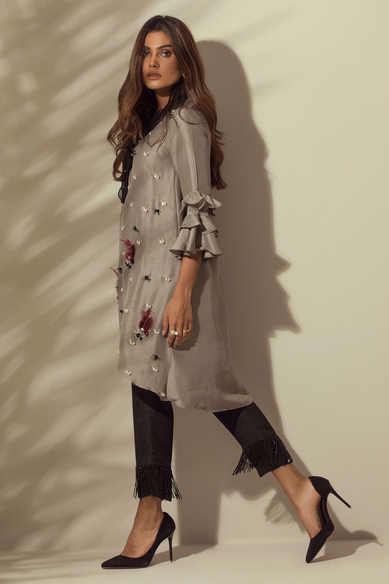 Trendy handwork of beads, pearls, crystals, stones, cut dana and feather done beautifully on this Grey pure raw silk Top with lovely detailing of organza and lace on the neckline.
