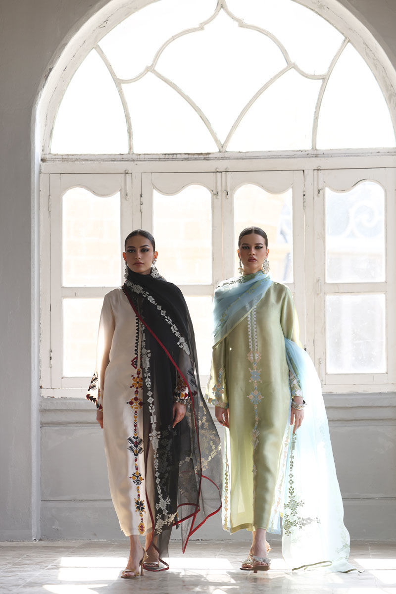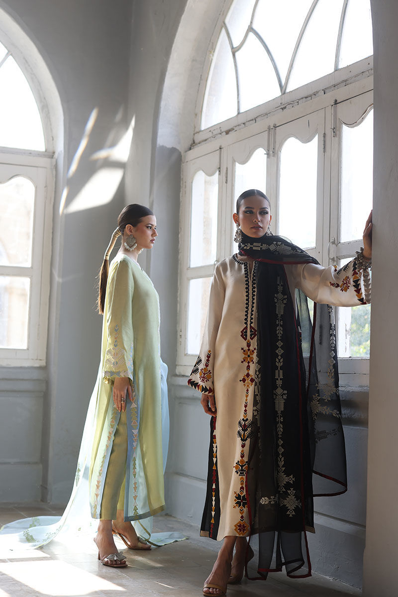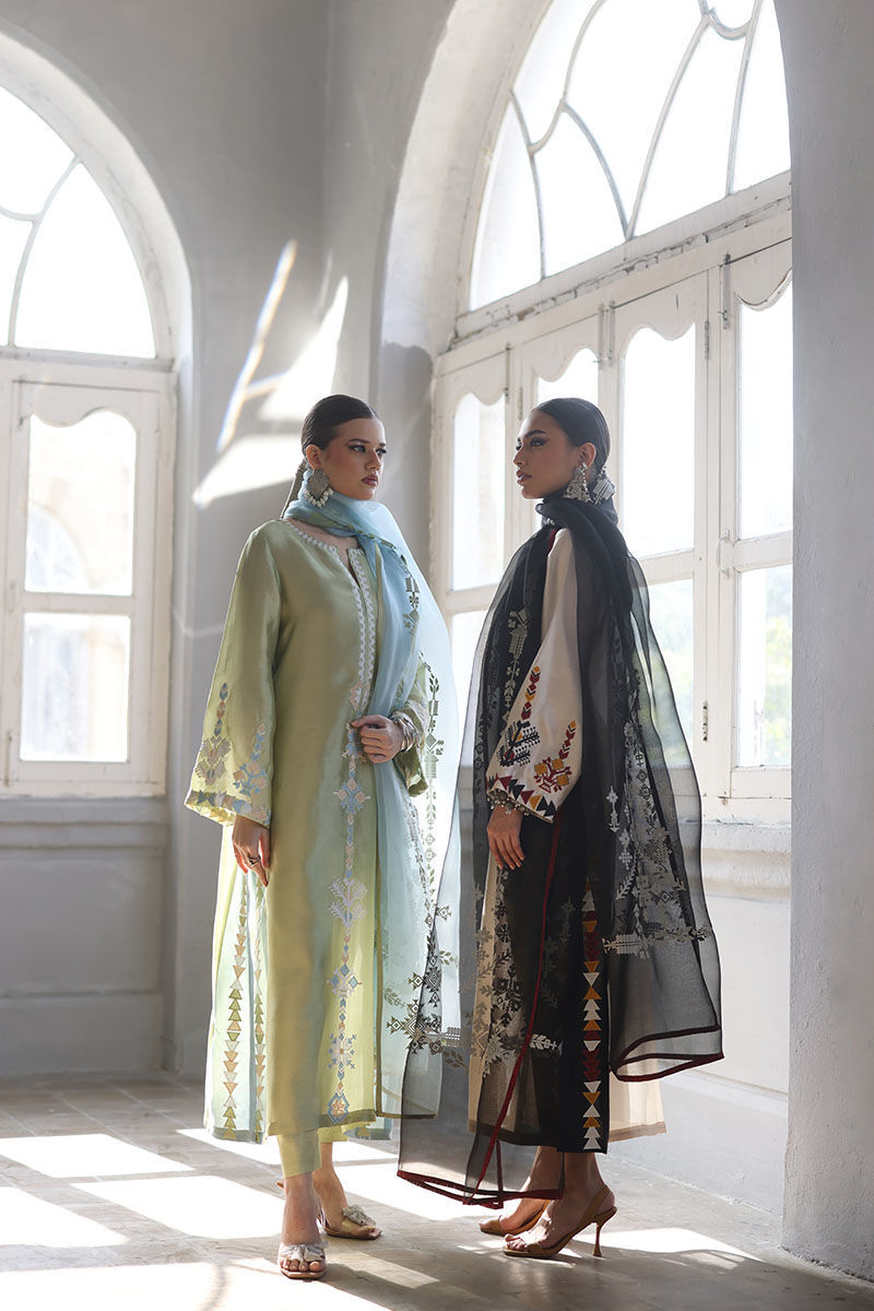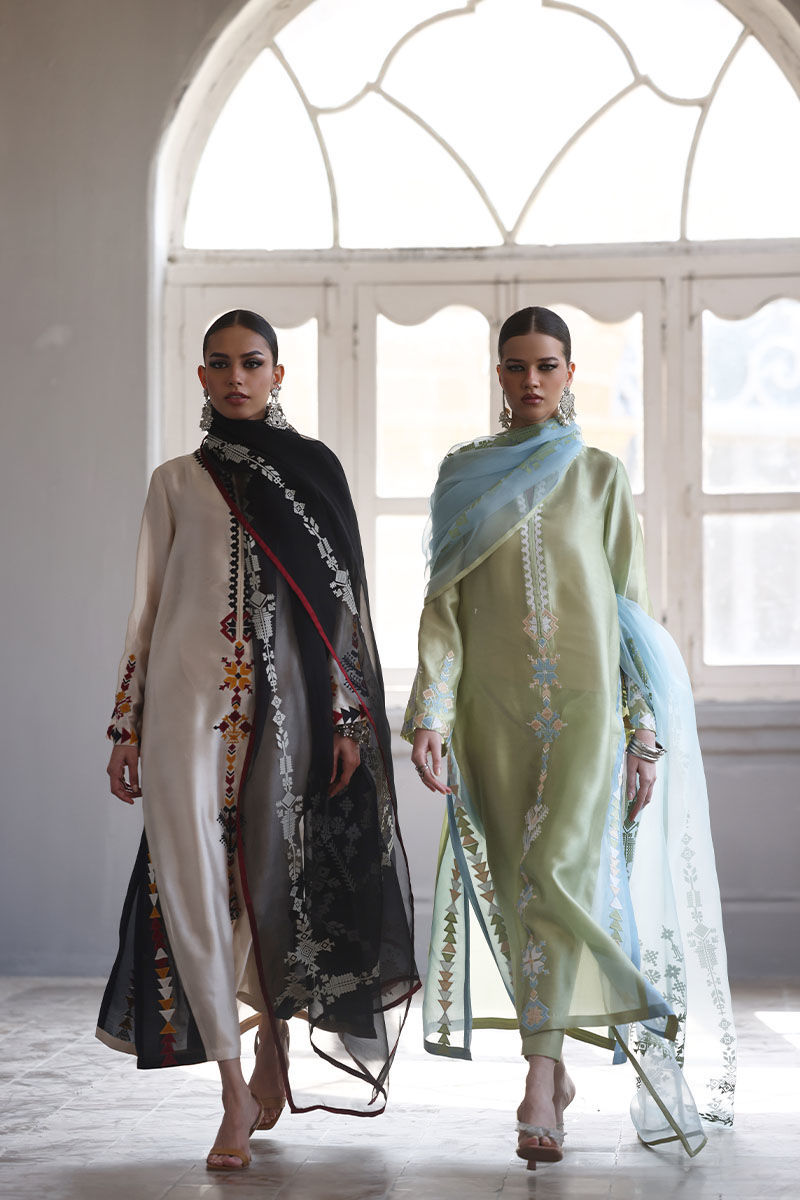 This elegant ensemble includes a Panel Shirt, paired with a Straight Pant and a beautifully draped Dupatta. The shirt is crafted from luxurious Pure Shisha Silk, showcasing exquisite Colored Embroidery and Applique Work that add depth and vibrancy to the design. The Straight Pant is made from Pure Cotton Silk, offering both comfort and a sleek, modern silhouette. The Dupatta is made of Pure Organza, with an all-over Screen Print design that enhances the outfit’s overall aesthetic. Perfect for those who appreciate intricate craftsmanship and timeless elegance, this set is ideal for a special occasion or a festive celebration.
