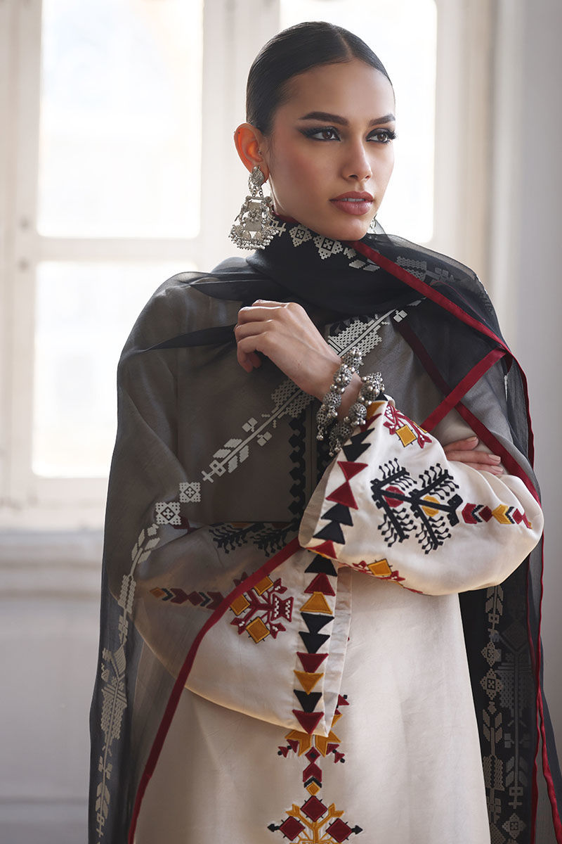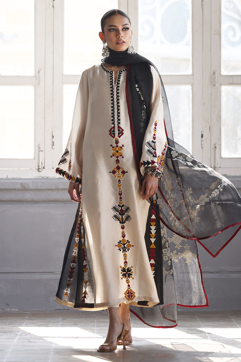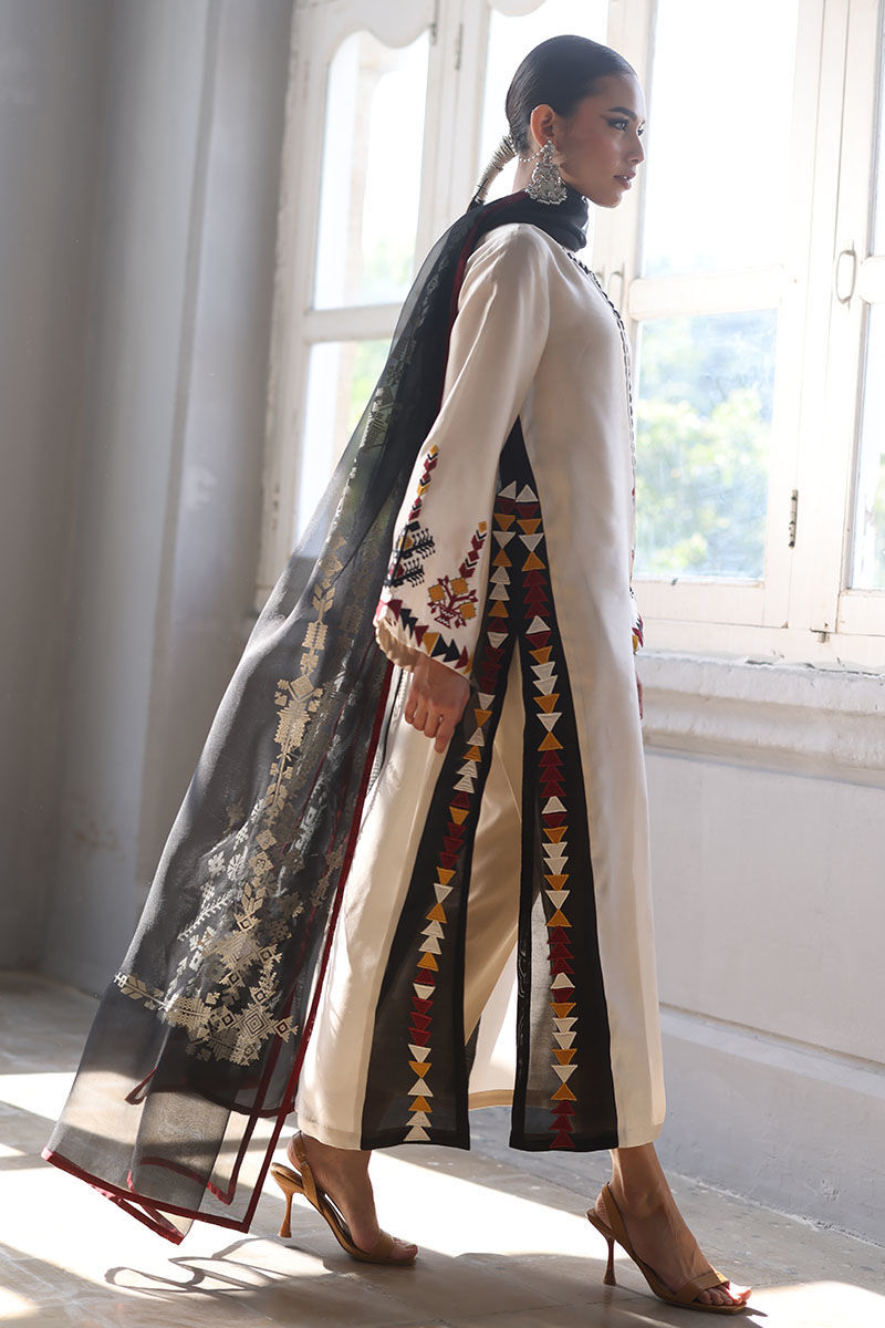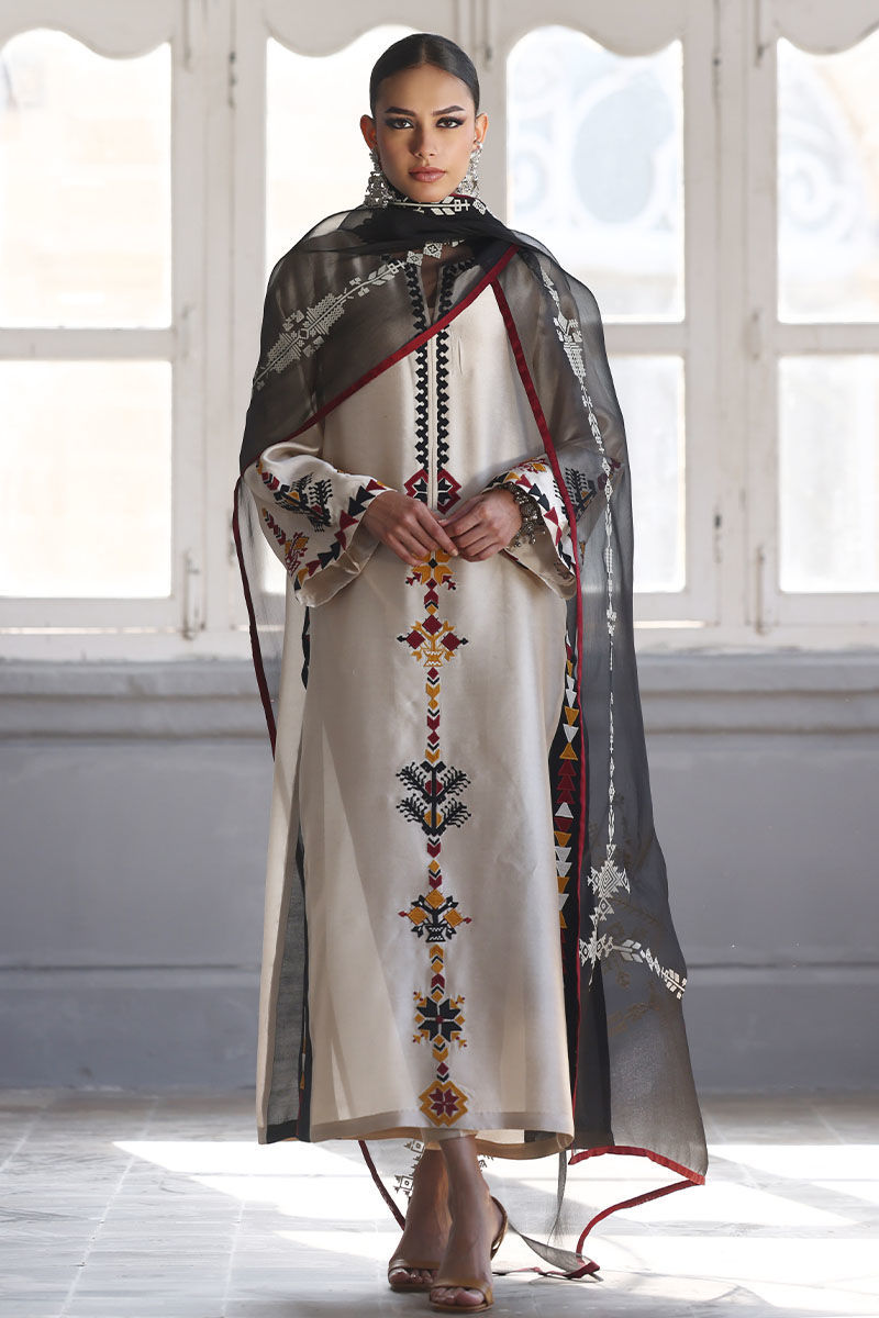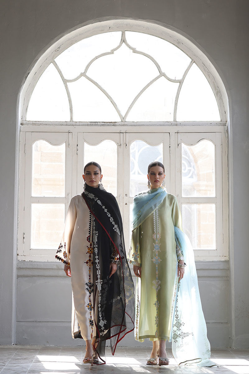 This elegant ensemble includes a Panel Shirt, paired with a Straight Pant and a beautifully draped Dupatta. The shirt is crafted from luxurious Pure Shisha Silk, showcasing exquisite Colored Embroidery and Applique Work that add depth and vibrancy to the design. The Straight Pant is made from Pure Cotton Silk, offering both comfort and a sleek, modern silhouette. The Dupatta is made of Pure Organza, with an all-over Screen Print design that enhances the outfit’s overall aesthetic. Perfect for those who appreciate intricate craftsmanship and timeless elegance, this set is ideal for a special occasion or a festive celebration.