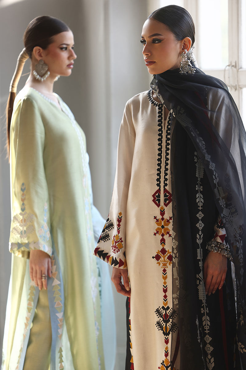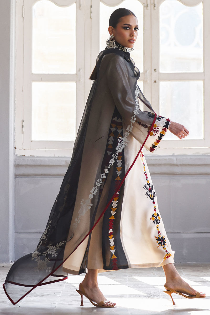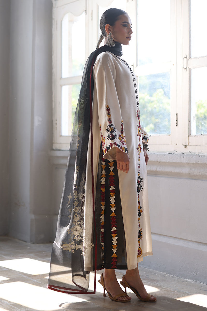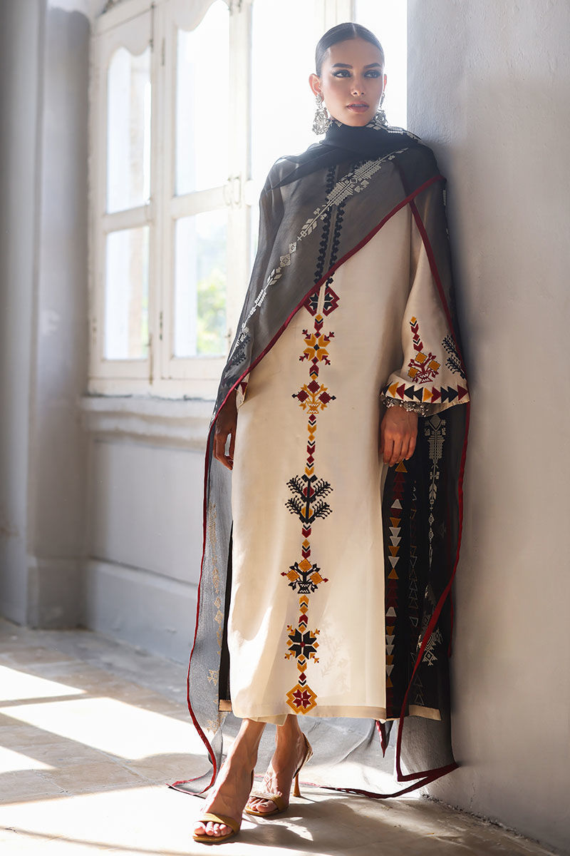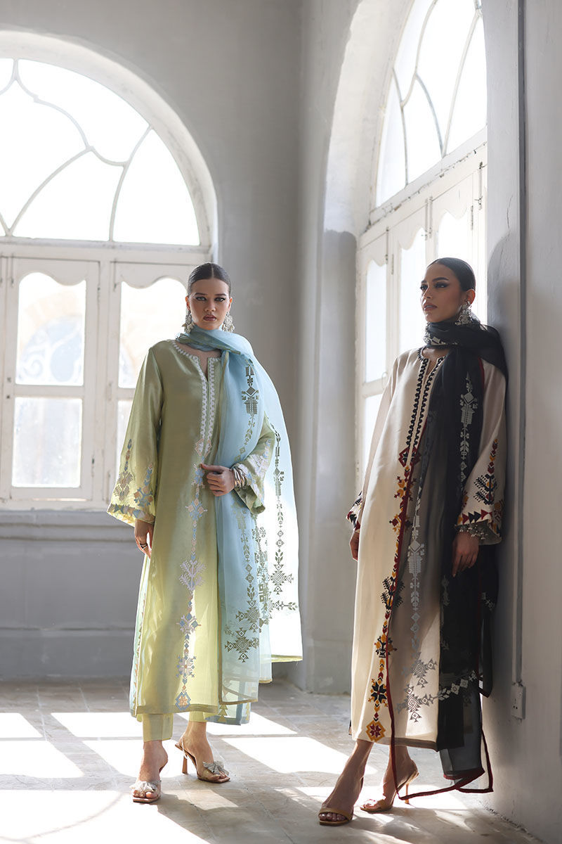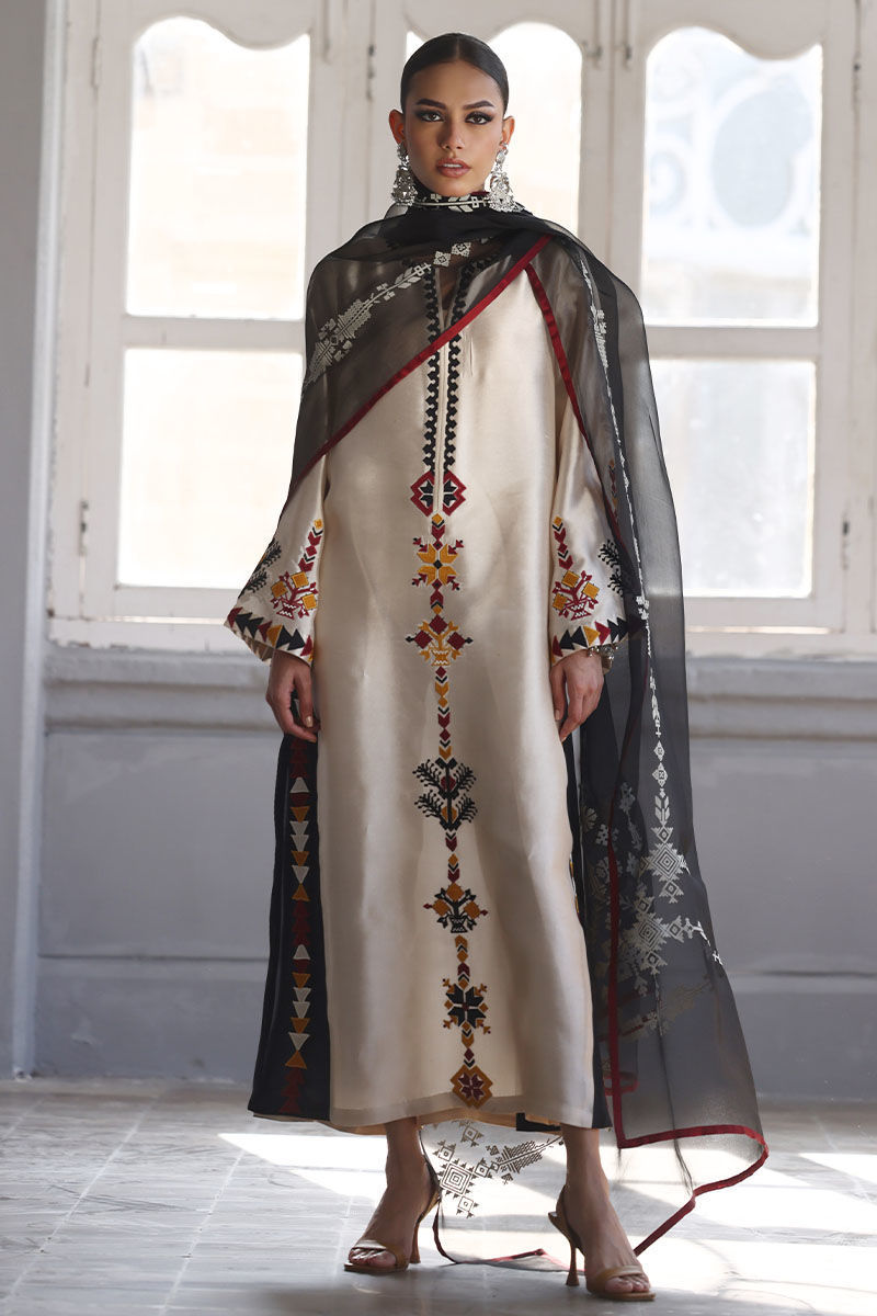 This elegant ensemble includes a panel shirt, paired with straight pants and a beautifully draped dupatta. The shirt is crafted from luxurious Pure Shisha Silk, showcasing exquisite colored embroidery and appliqué work that add depth and vibrancy to the design. The Straight Pant is made from pure cotton silk, offering both comfort and a sleek, modern silhouette. The dupatta is made of pure organza, with an all-over screen print design that enhances the outfit’s overall aesthetic. Perfect for those who appreciate intricate craftsmanship and timeless elegance, this set is ideal for a special occasion or a festive celebration.
