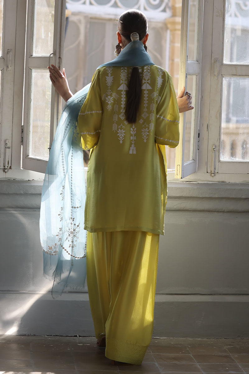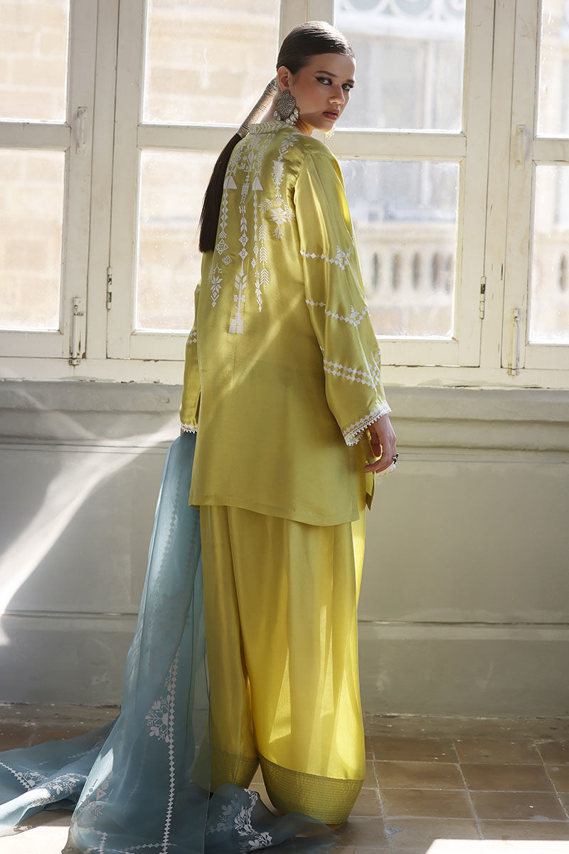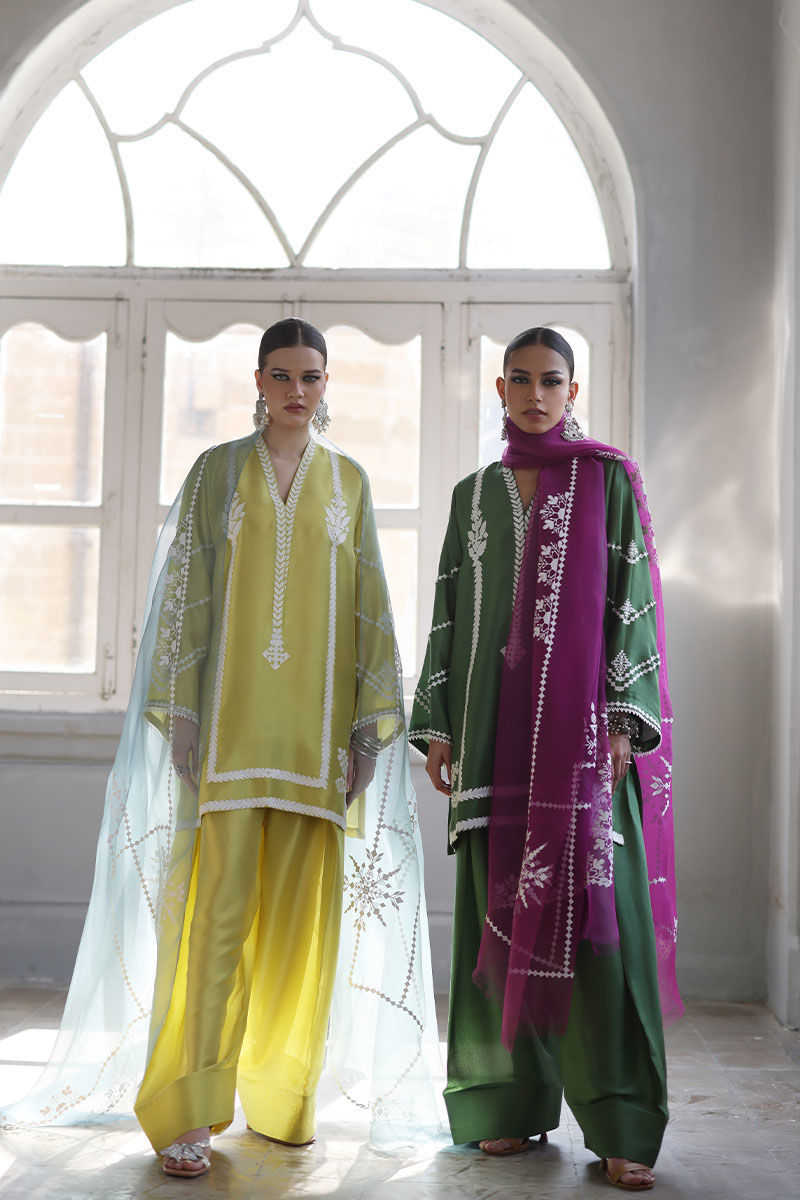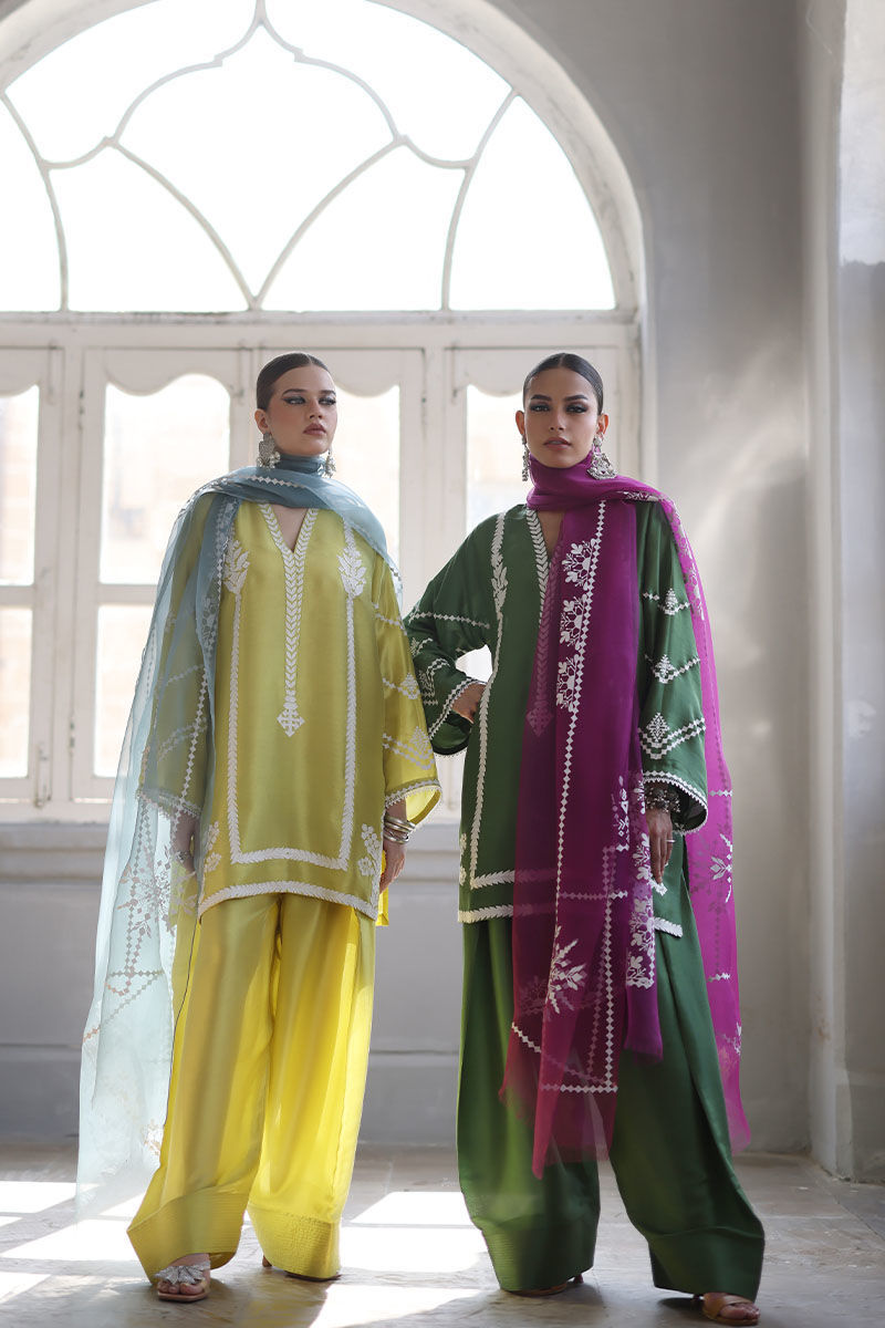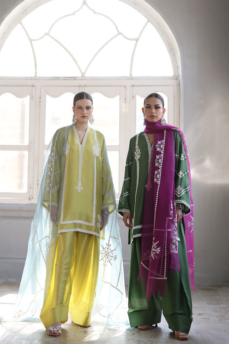 This elegant Short Kurta set is crafted from luxurious Pure Shisha Silk, offering both style and comfort. The shirt features exquisite Embroidery and Applique Work, adding a refined, artistic touch to the design. The sleeves and back are adorned with delicate Screen Print, giving the kurta a unique and contemporary flair. Paired with the shirt is a Pure Shisha Silk Shalwar, complementing the kurta perfectly for a balanced, sophisticated look. The ensemble is completed with a Pure Organza Dupatta, featuring an all-over Screen Print, adding a soft and graceful finish to the outfit. This beautiful set is perfect for formal occasions or festive celebrations, blending traditional craftsmanship with modern elegance.