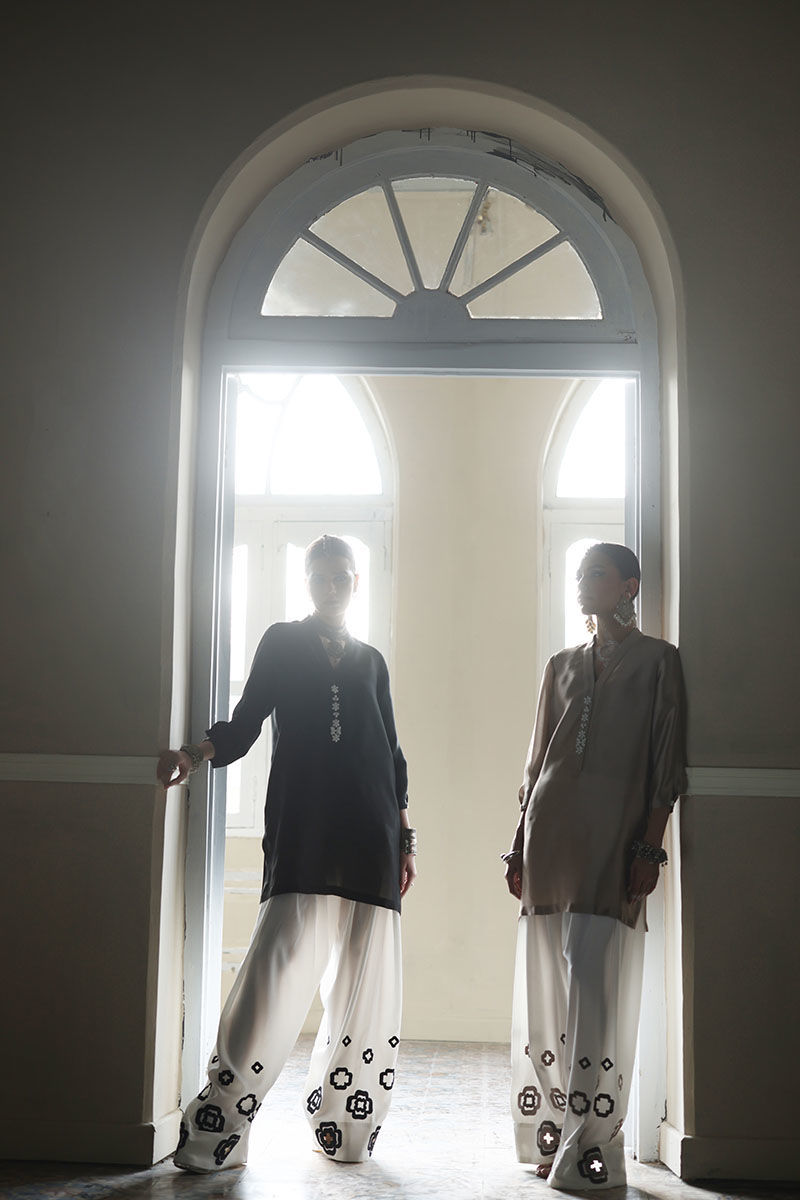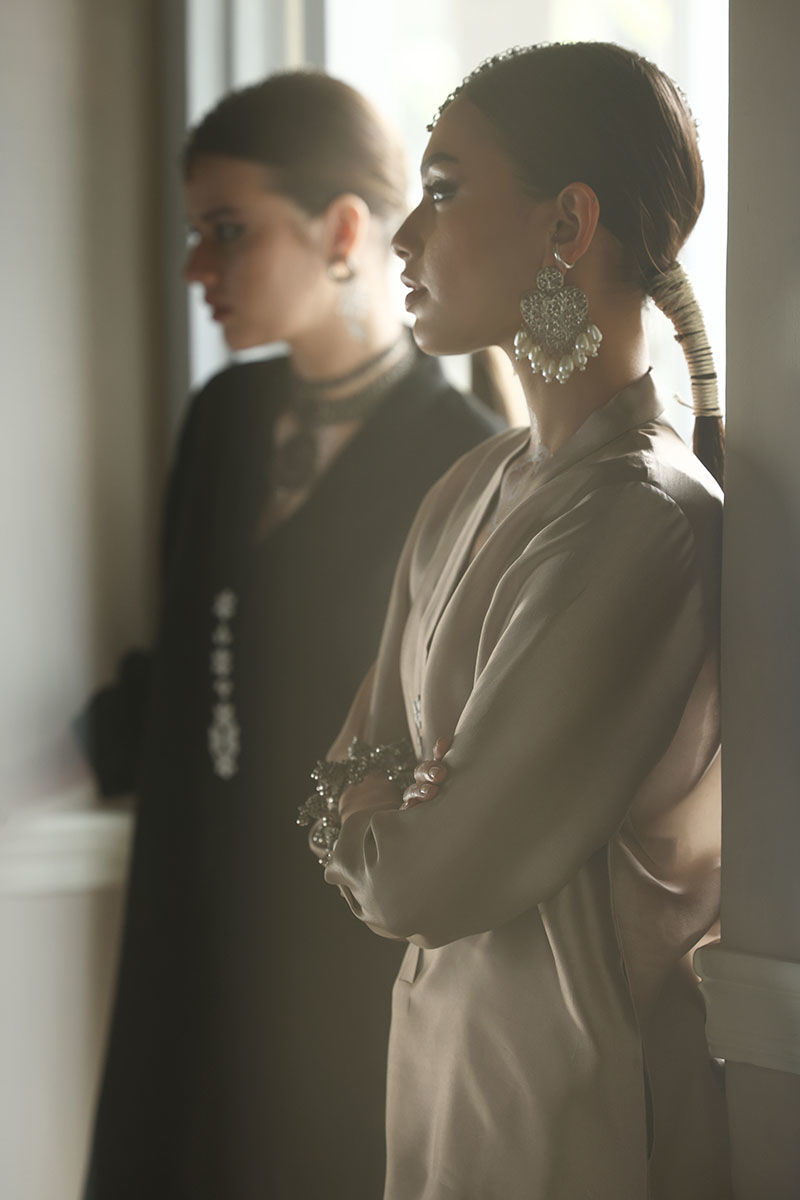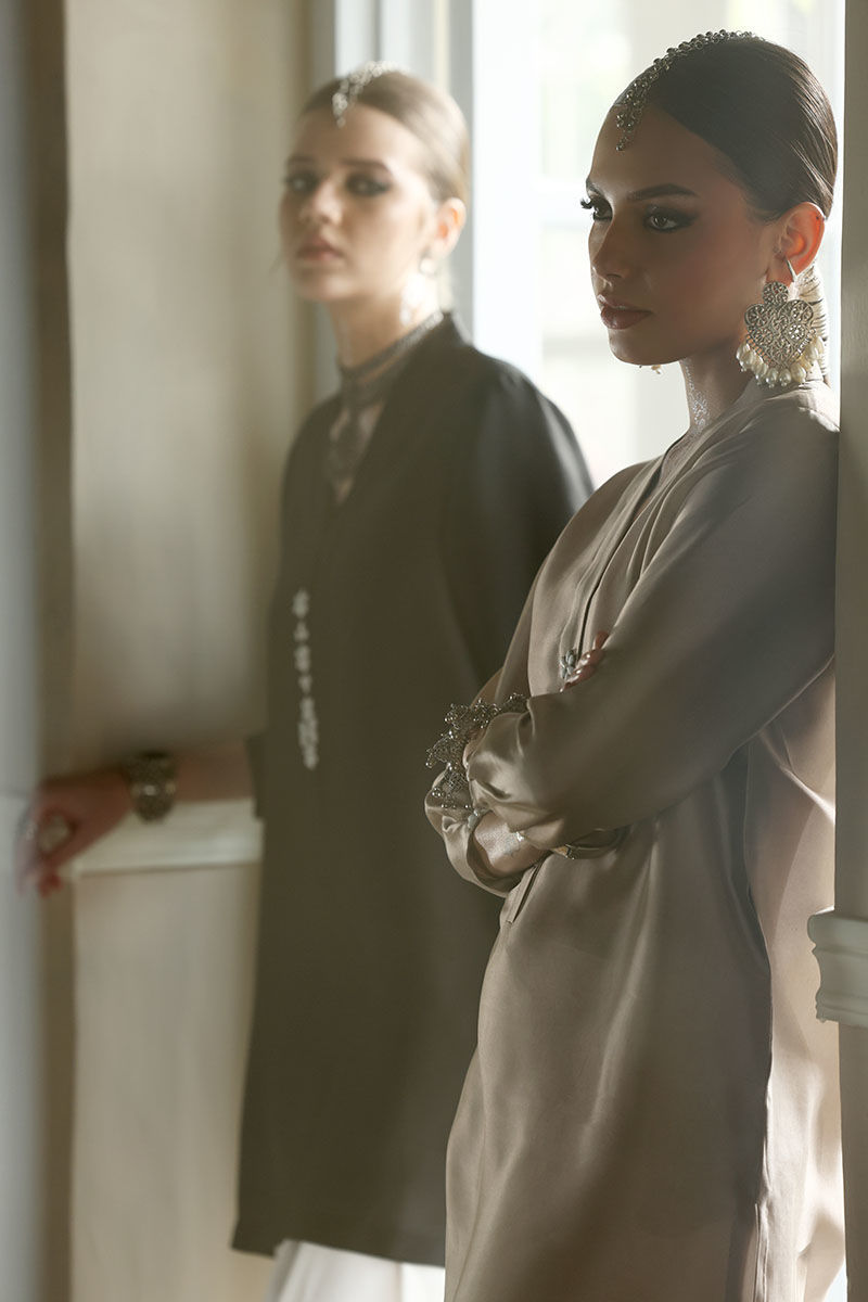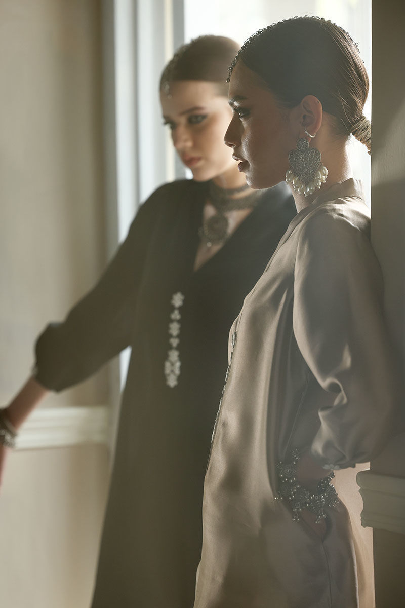 This elegant ensemble features a shirt made from luxurious Pure Shisha Silk, paired with a Crepe Silk Shalwar that combines comfort and style. The shirt is beautifully enhanced with intricate Handmade Patti Work on the neckline and sleeves, adding a touch of delicate craftsmanship. The Shalwar showcases detailed Embroidery and Applique Work with exquisite Cut Work on the bottom, creating a refined and elegant finish. Completing the look is a Pure Organza Dupatta, adorned with Handmade Tassels hanging gracefully from the edges, adding a traditional yet modern flair.