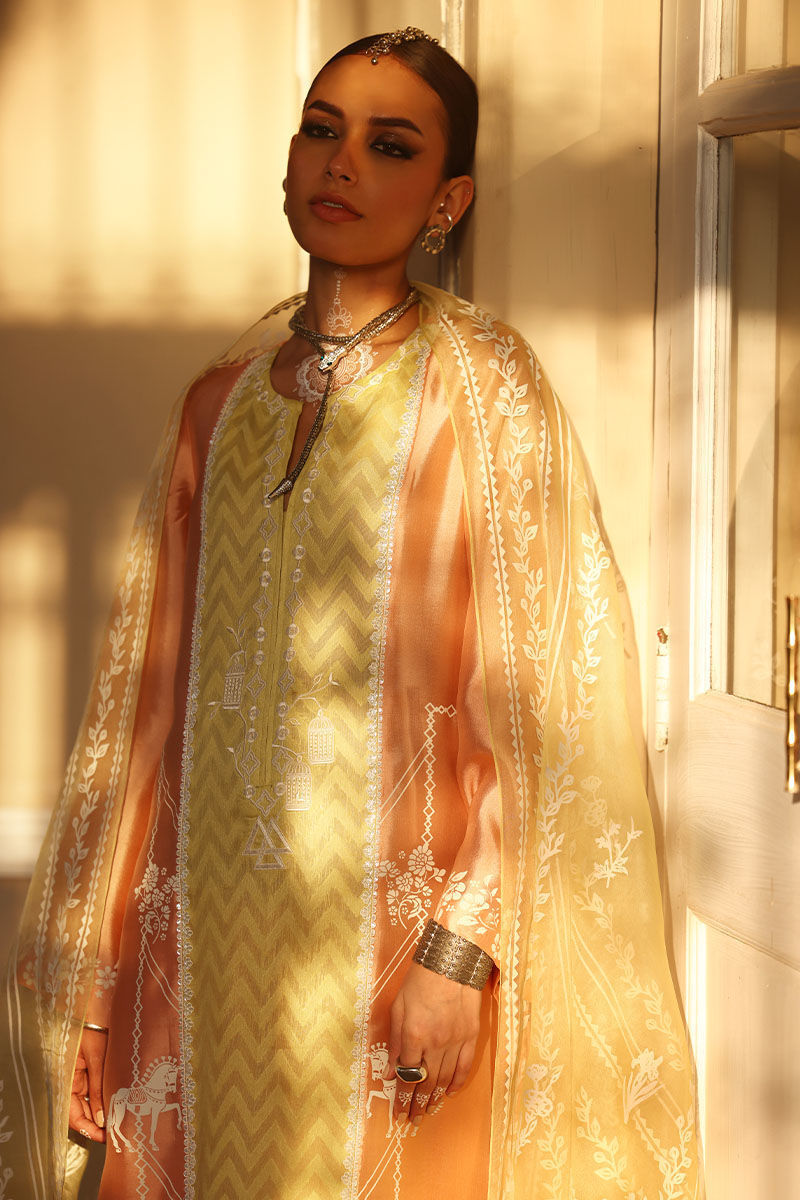 This stunning outfit features a loose-cut shirt made from pure Shisha silk, beautifully adorned with intricate screen printing and embroidery on the front and sleeves. It is paired with culottes made from pure cotton silk, offering both comfort and elegance. The look is completed with a pure organza dupatta, which showcases an all-over screen print design and is finished with handmade tassels hanging from the edges, adding a delicate touch. Combining contemporary style with traditional craftsmanship, this ensemble is perfect for a formal or festive occasion.