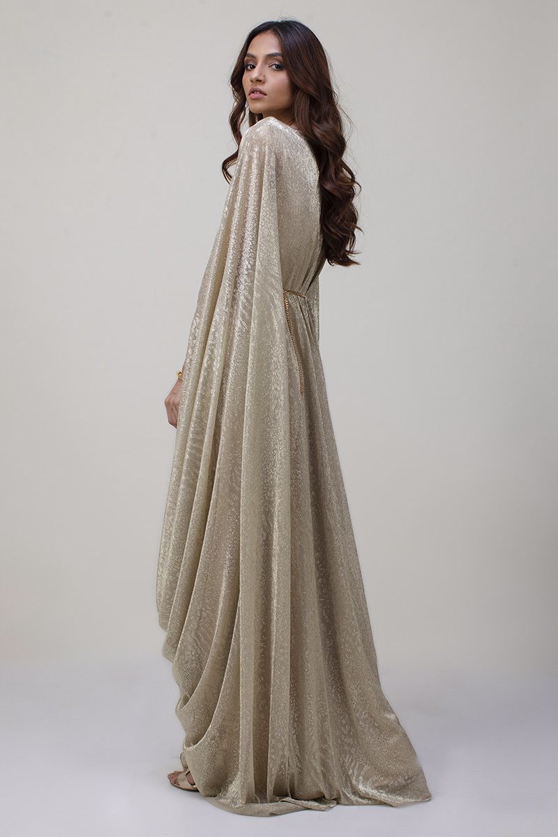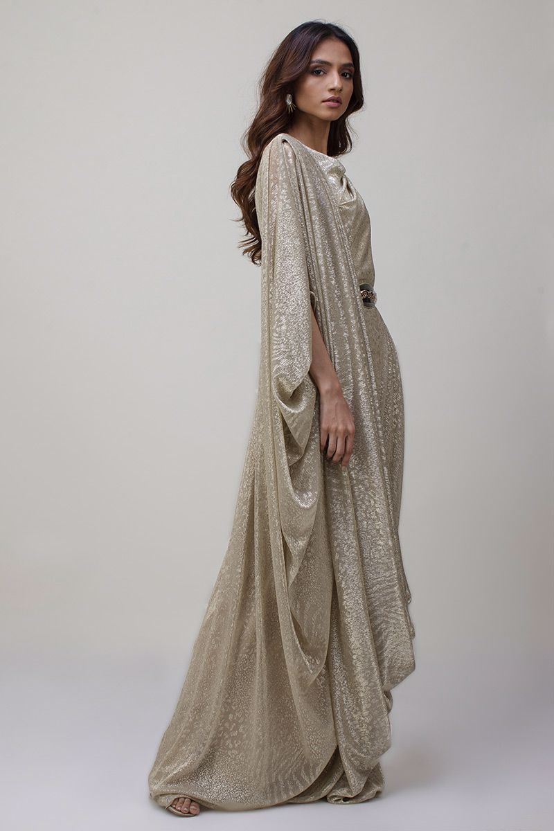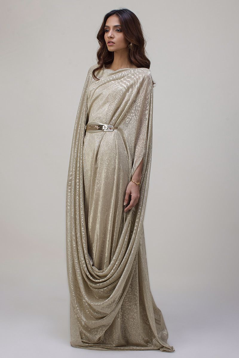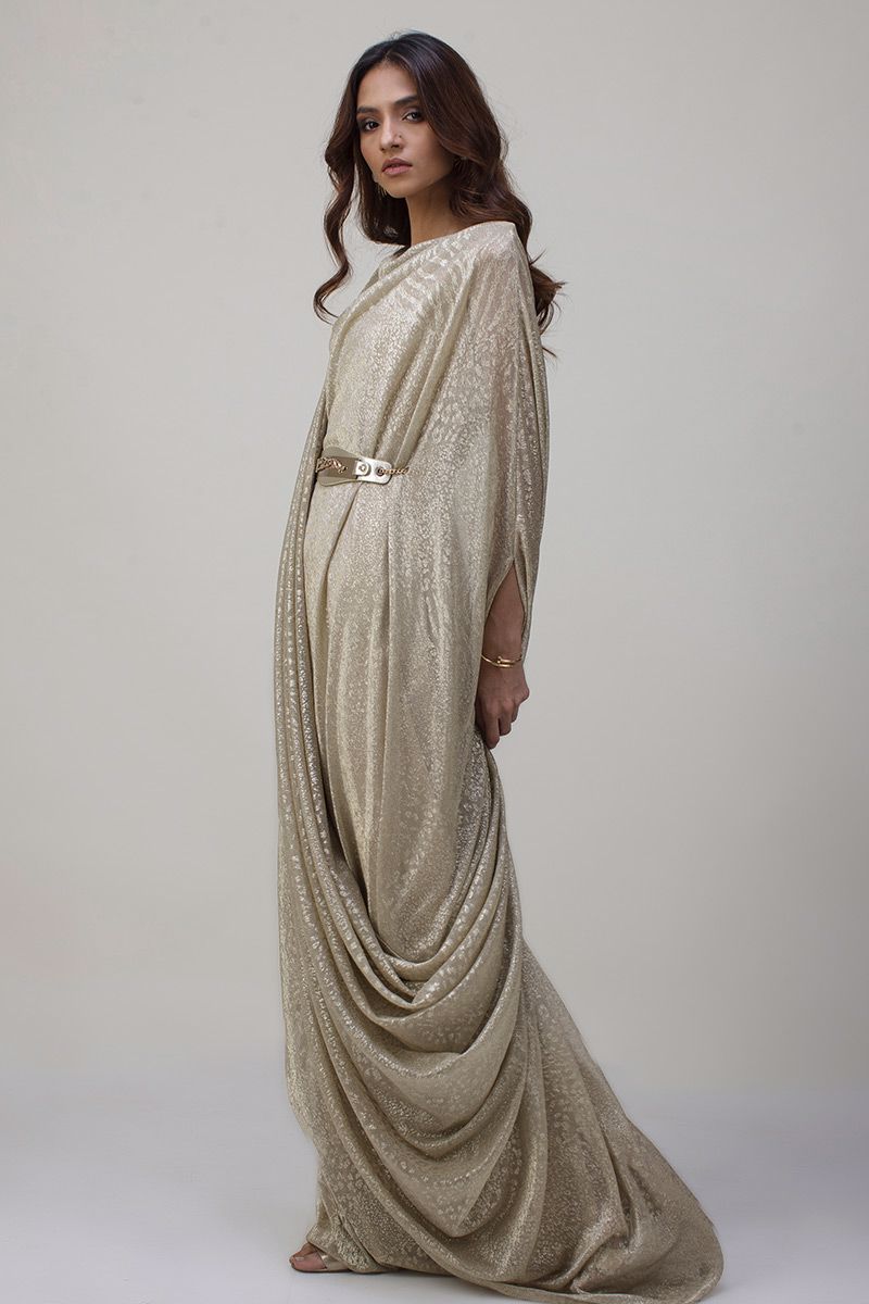 A pictographic resemblance of greek goddess is seen in glitter jersey net pleated kaftan. The cawls are draped towards the hem creating a soothing eye movement. The look of the outfit is enhanced with a metallic interlaced belt.