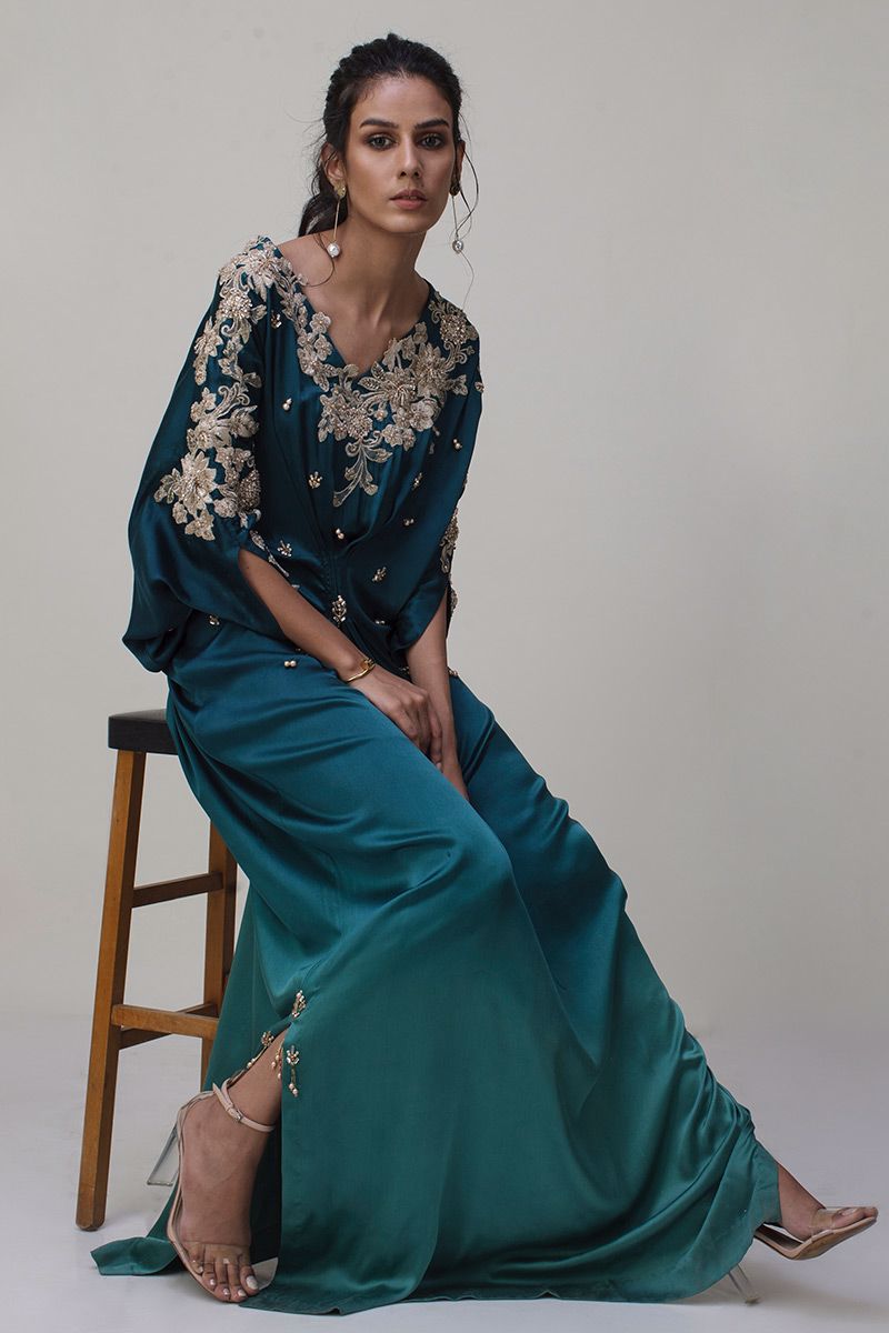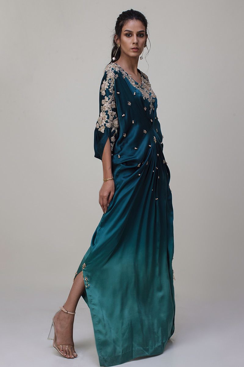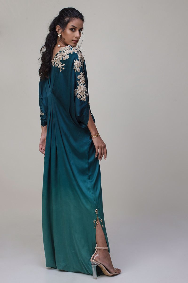A beautious pure charmause kaftan in ombre style teal shines in the crowd. The exquisite embellishments around the neckline comprises of 3D resham florals, pearls, cutdana along with chunky crystals scattered over the torso.