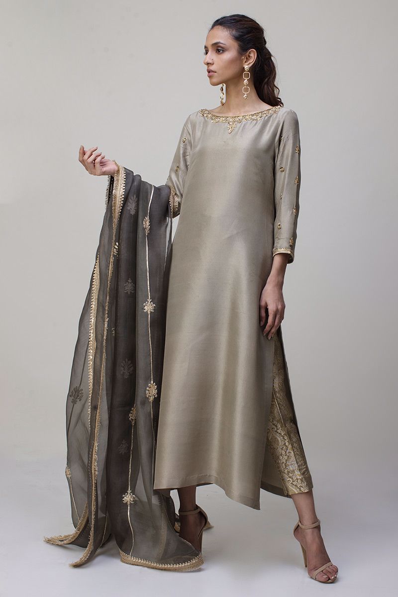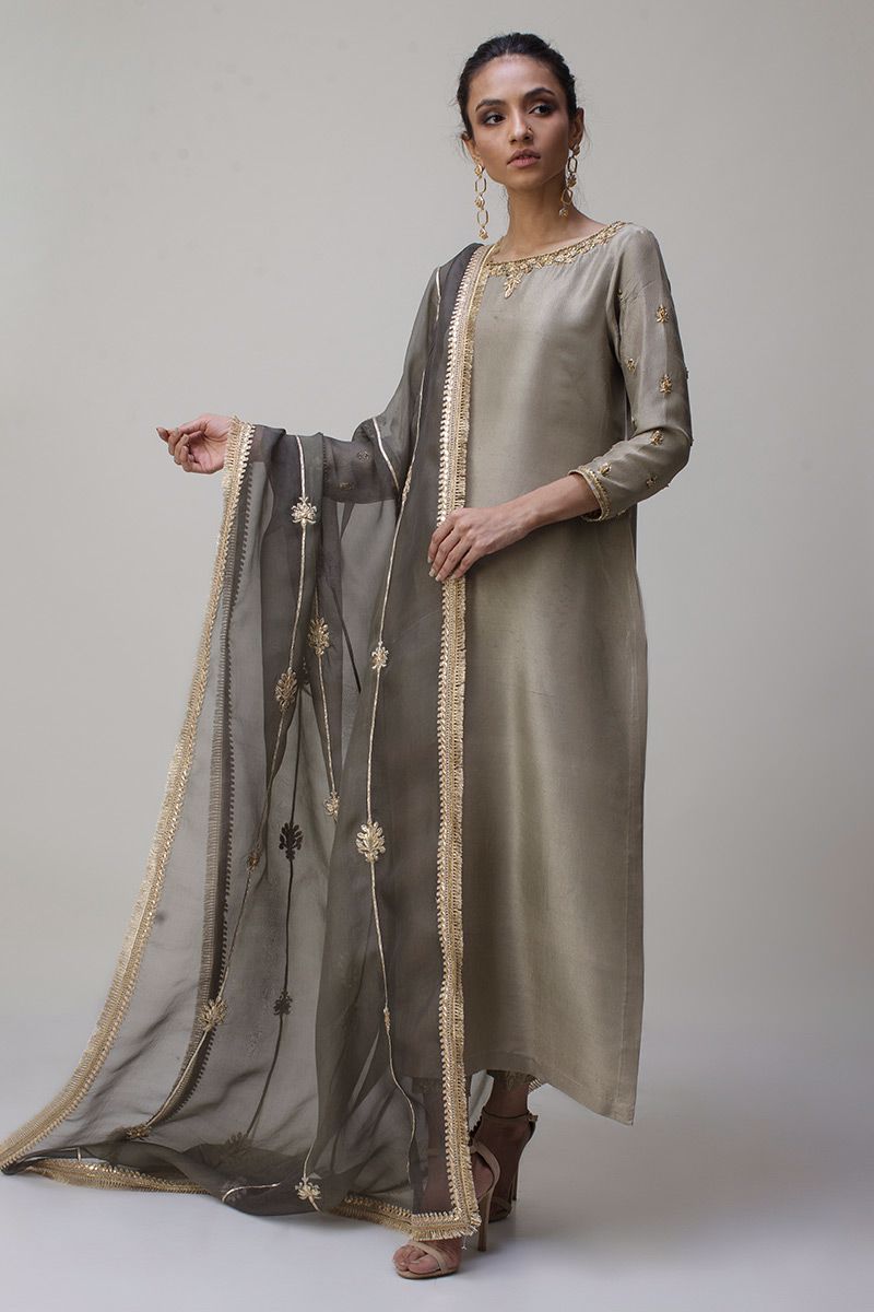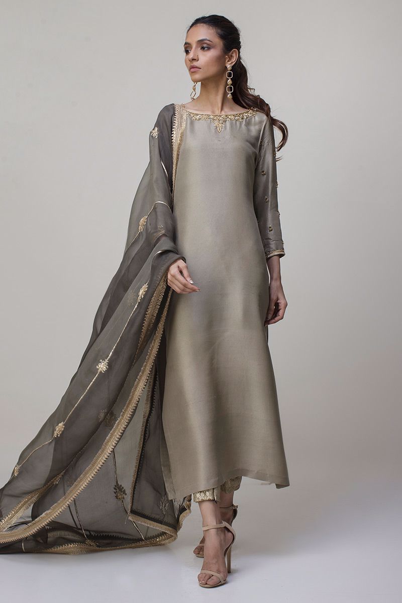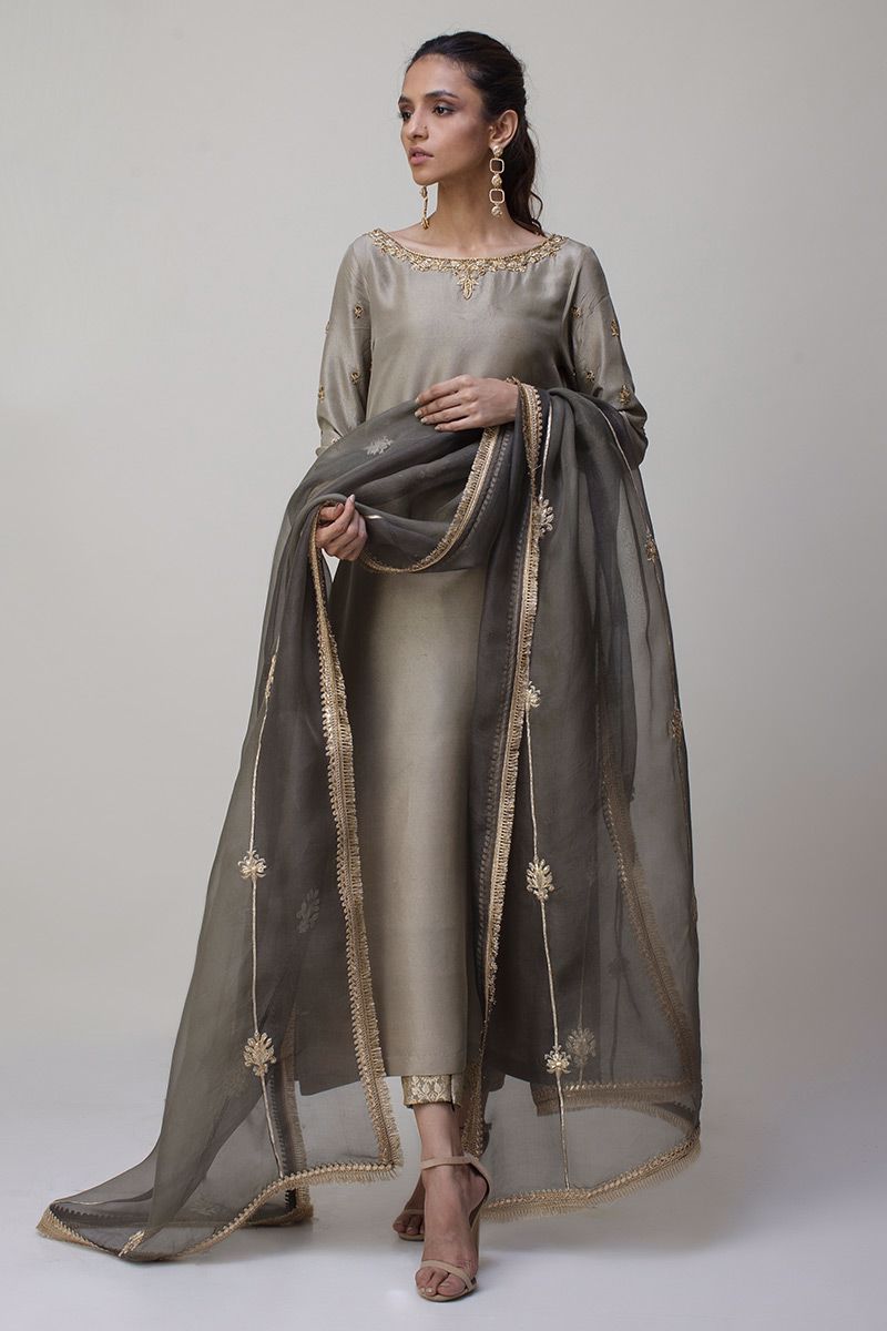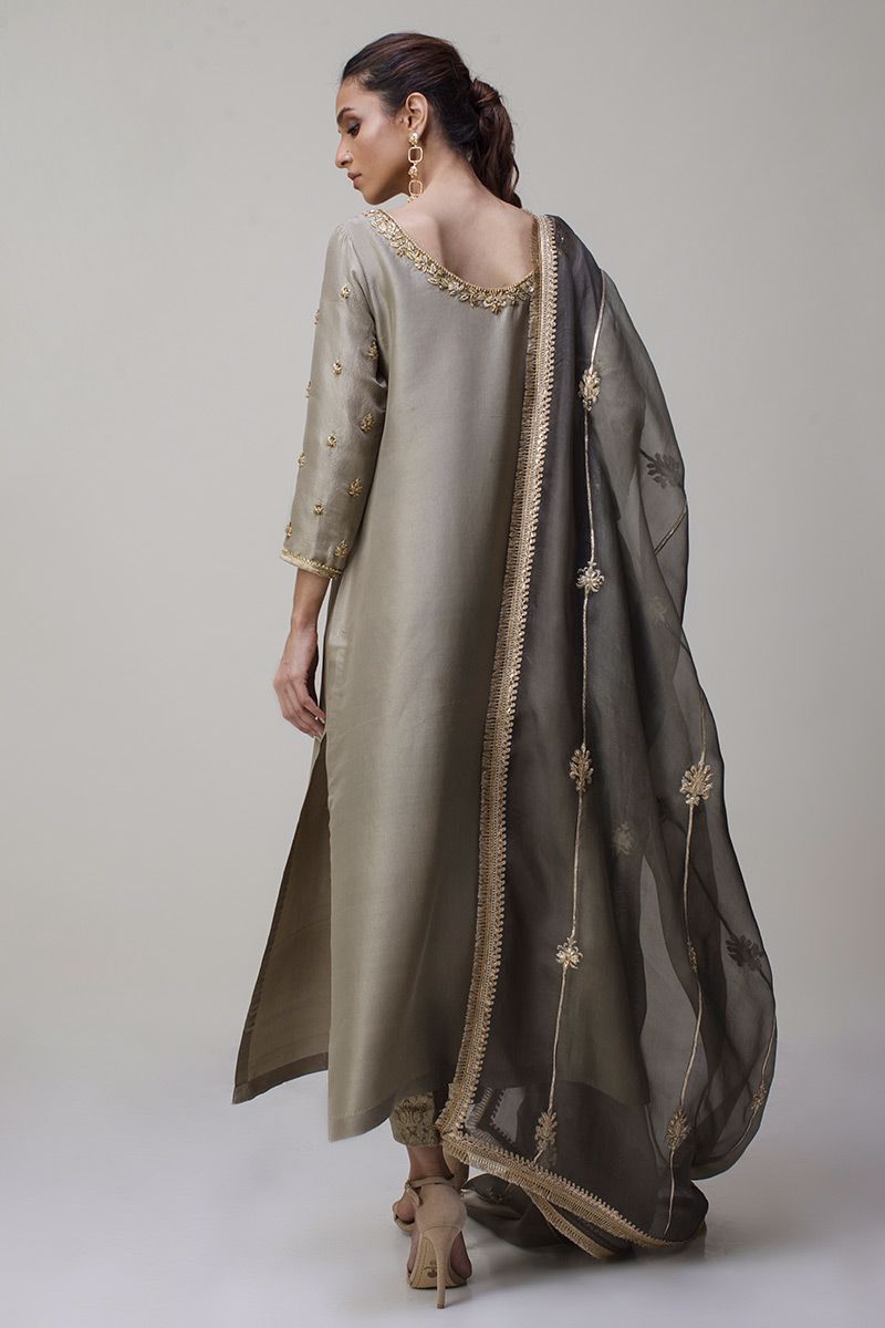 Portrayal of elegance seen in the grey green pure rawsilk shirt. Antique zardozi work is well positioned with nakshi, kora, dabka and sequin detailing around the neckline along with the sleeves. Same color banarsi pants and two tone pure organza dupatta is paired, to be purchased separately.