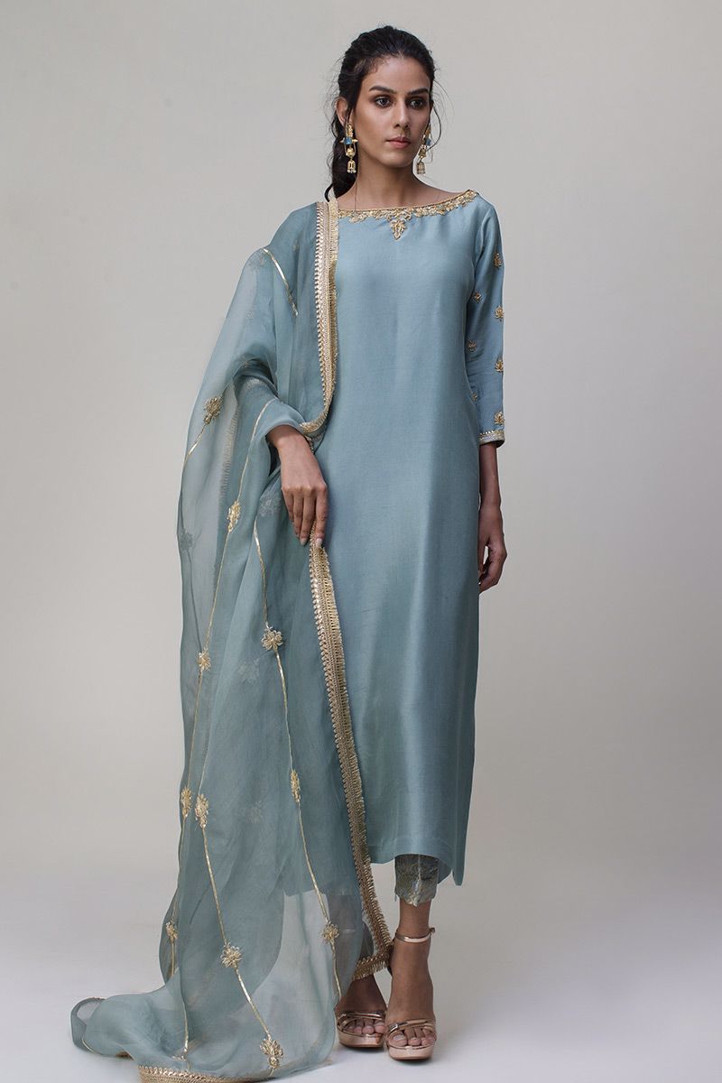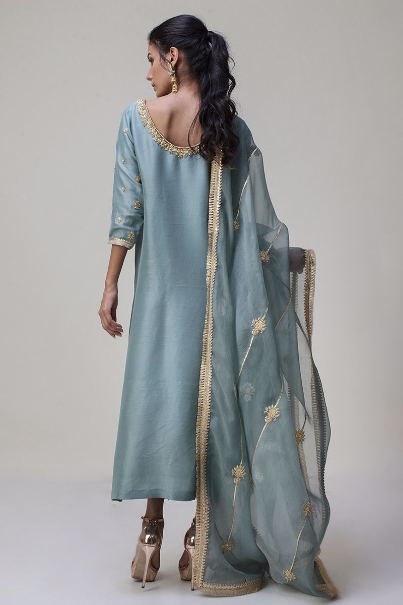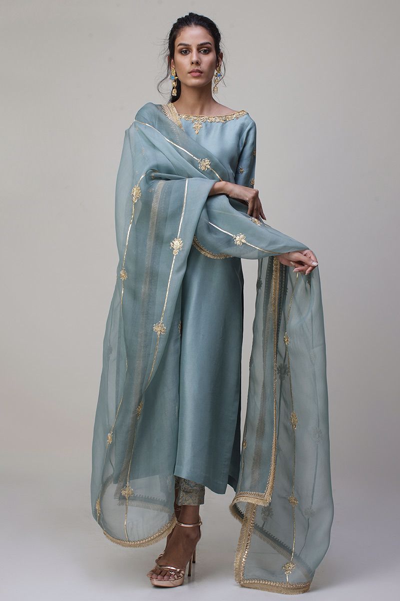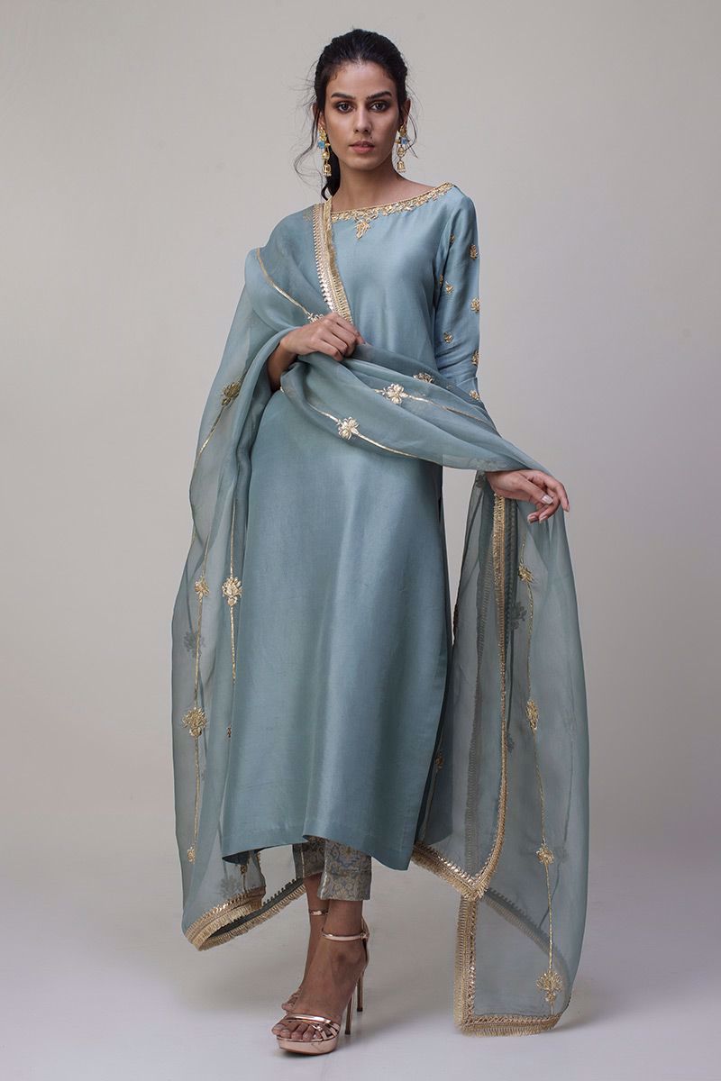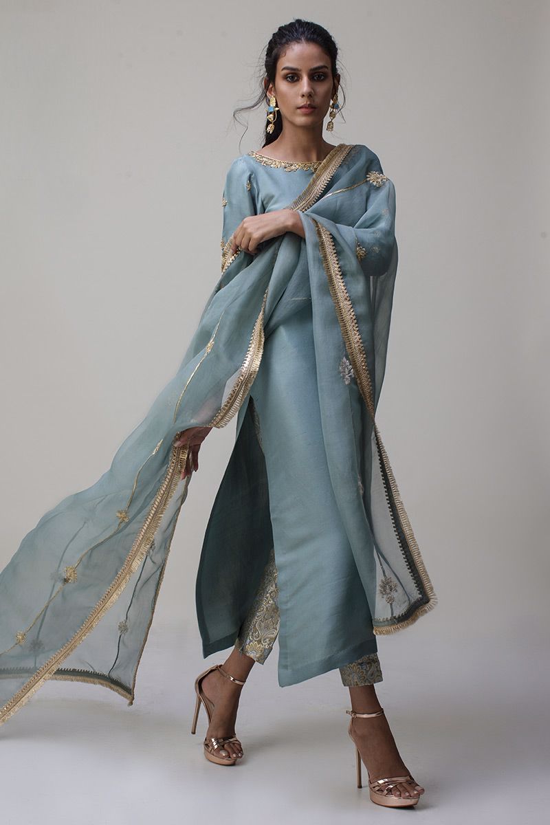 Portrayal of elegance seen in the grey mist pure rawsilk shirt. Antique zardozi work is well positioned with nakshi, kora, dabka and sequin detailing around the neckline along with the sleeves. Same color banarsi pants and two tone pure organza dupatta is paired, to be purchased separately.