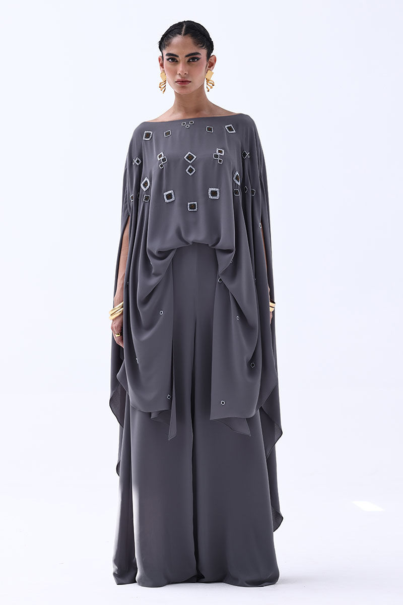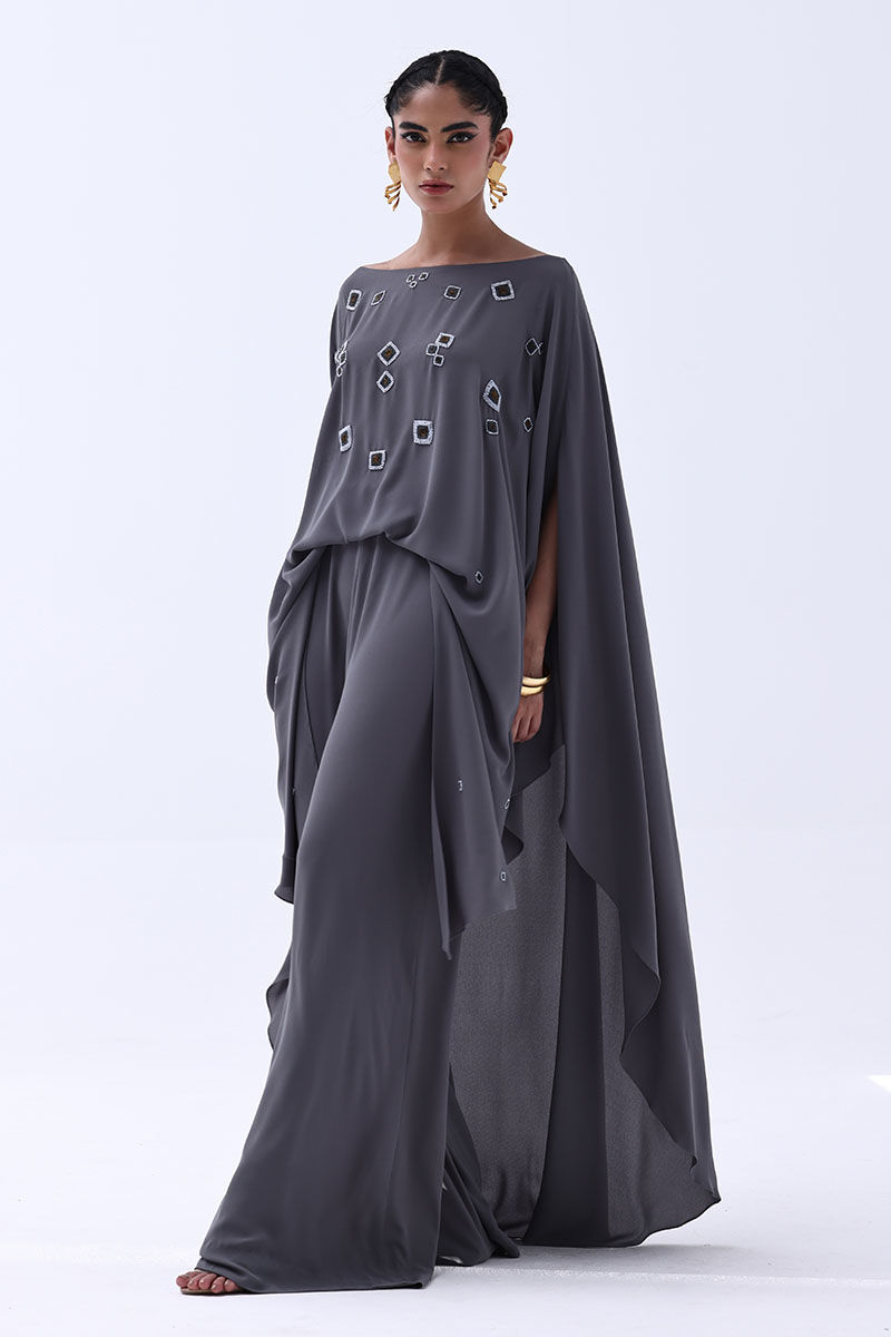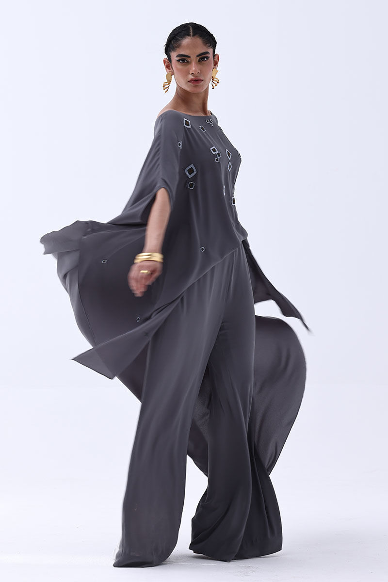 Turn heads with this sophisticated charcoal grey outfit, crafted from soft, flowy georgette fabric. The top features delicate handwork boti embroidery enhanced with subtle matte moti (pearl) embellishments, offering a refined touch of glamour. Paired with stylish culottes, this ensemble blends tradition and modern flair perfect for festive occasions, semi-formal gatherings, or evening wear.