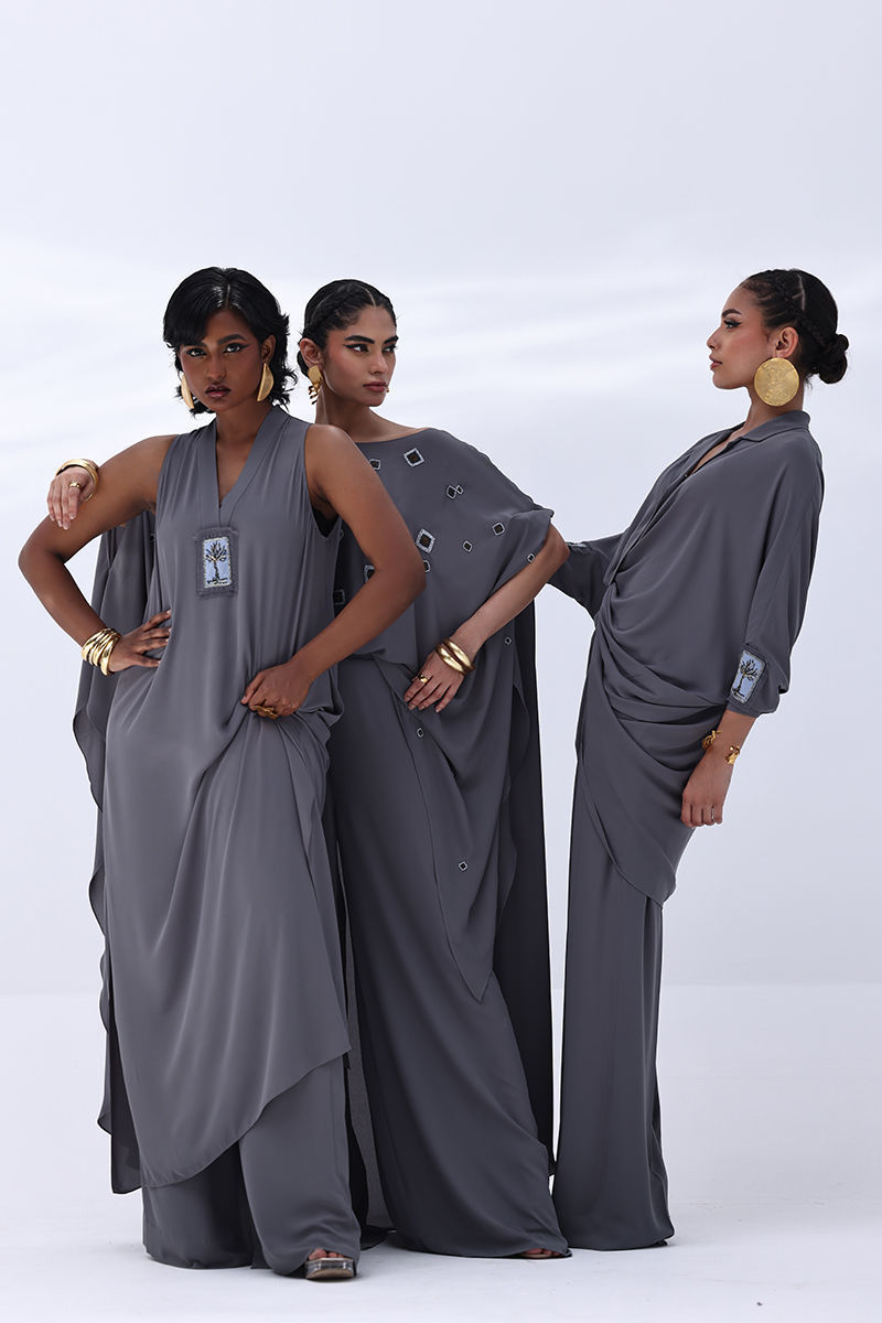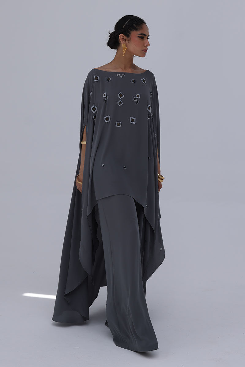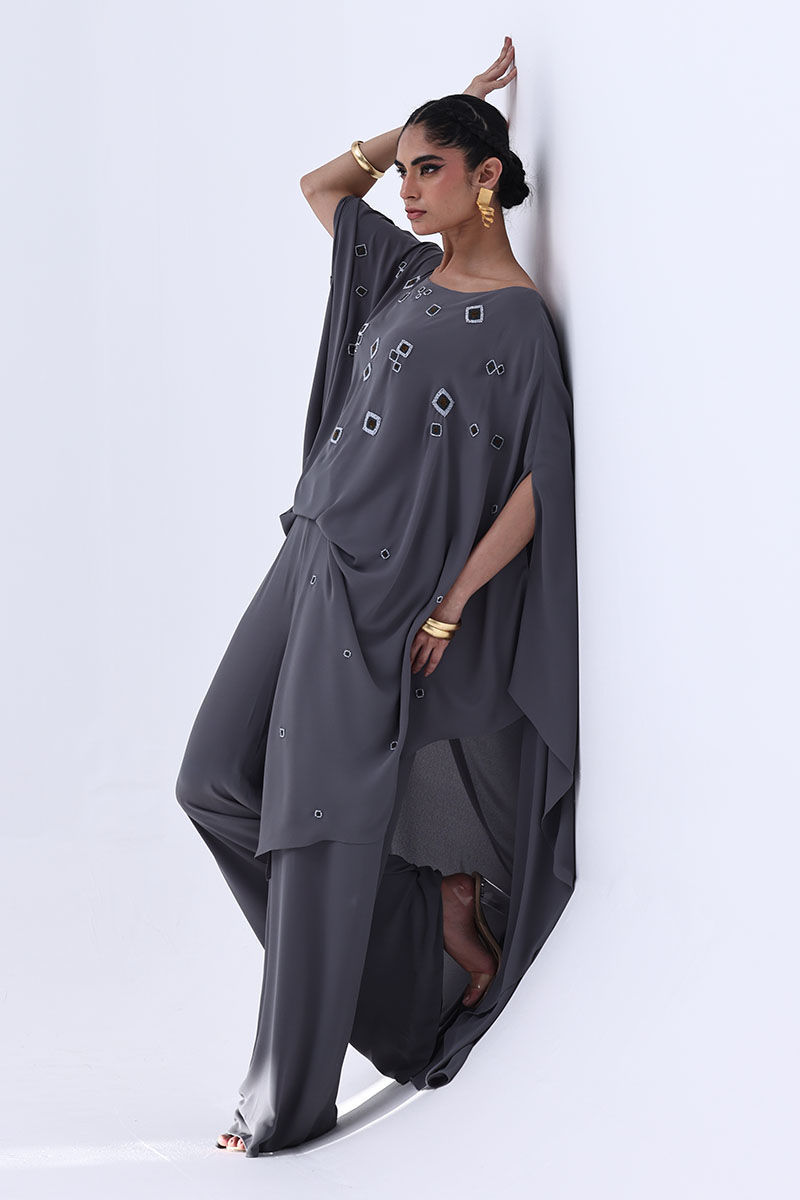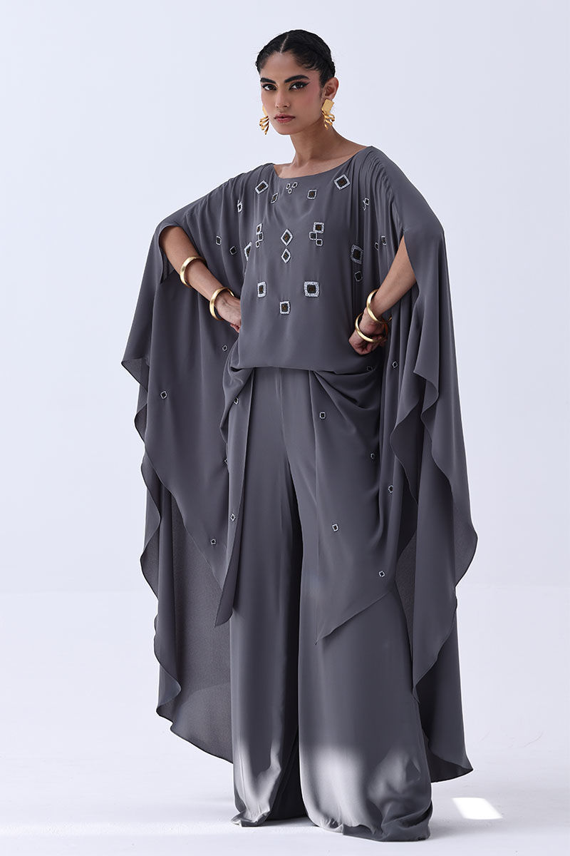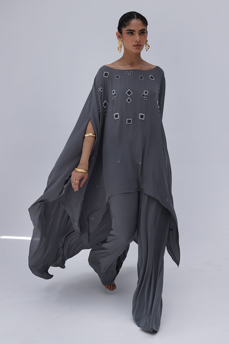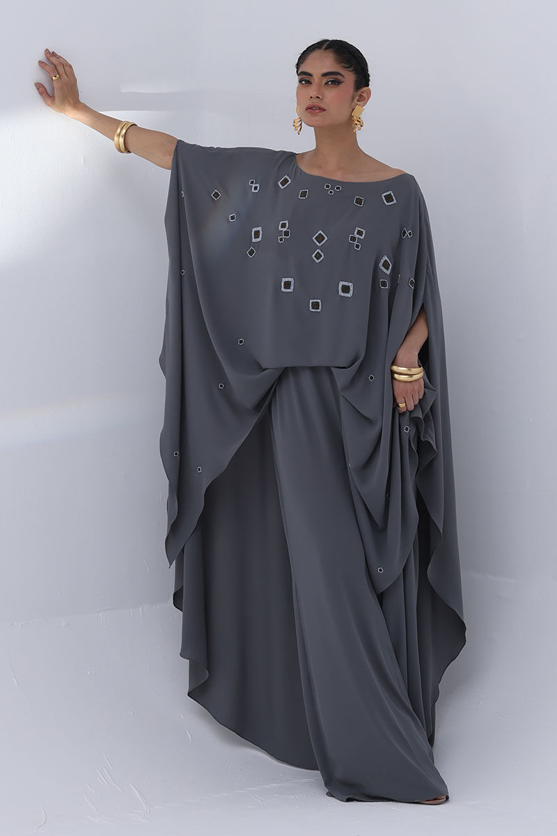 Turn heads with this sophisticated charcoal grey outfit, crafted from soft, flowy georgette fabric. The top features delicate handwork boti embroidery enhanced with subtle matte moti (pearl) embellishments, offering a refined touch of glamour. Paired with stylish culottes, this ensemble blends tradition and modern flair, perfect for festive occasions, semi-formal gatherings, or evening wear.