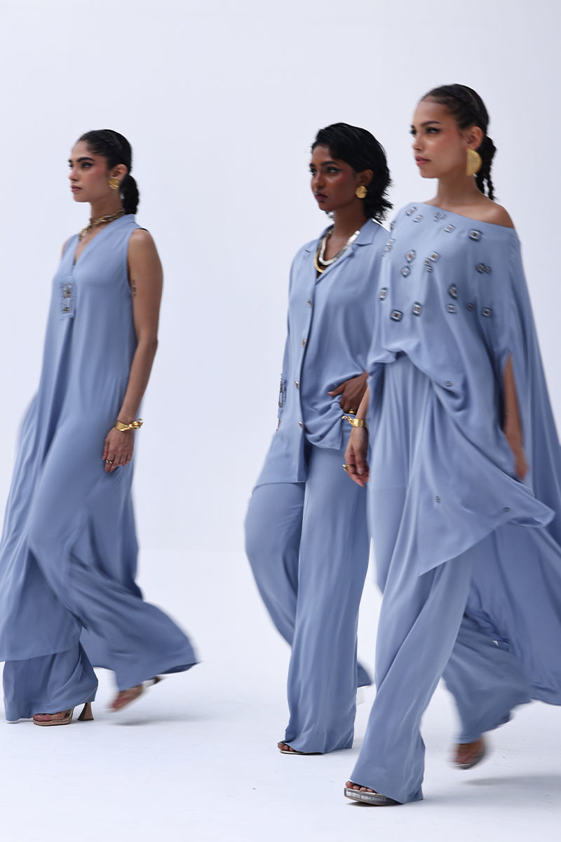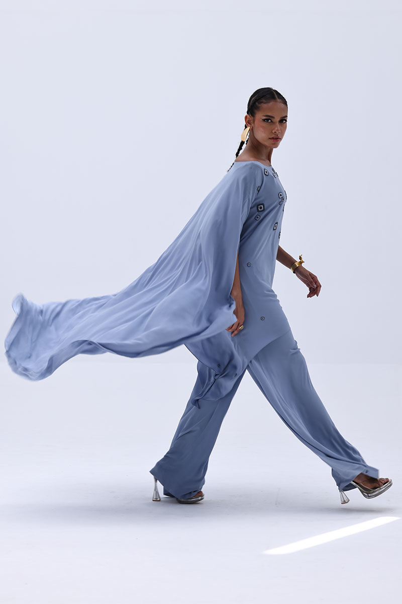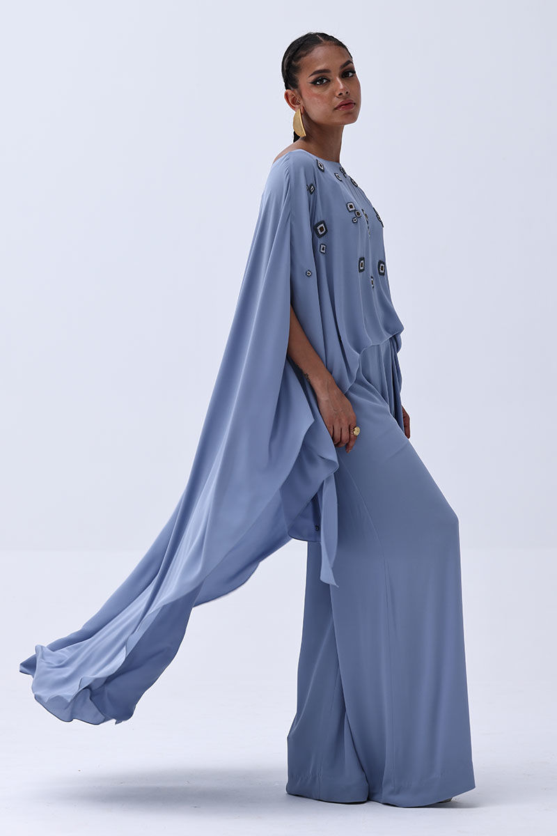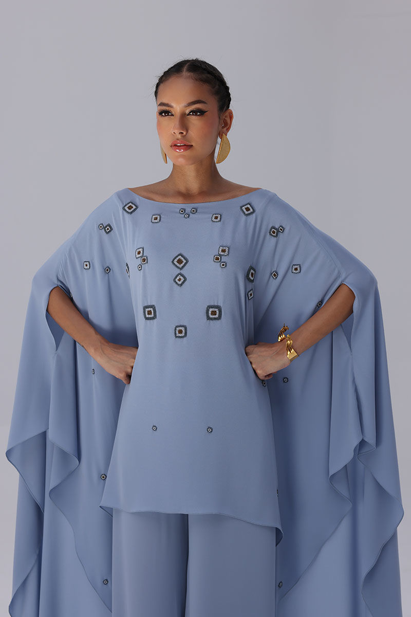 Step into elegance with this dreamy Blue Fog-colored outfit made from lightweight georgette. The top is adorned with intricate handwork boti detailing, beautifully complemented by matte moti (pearl) embellishments that add a soft shimmer. Paired with modern culottes, this ensemble strikes the perfect balance between traditional charm and contemporary style.