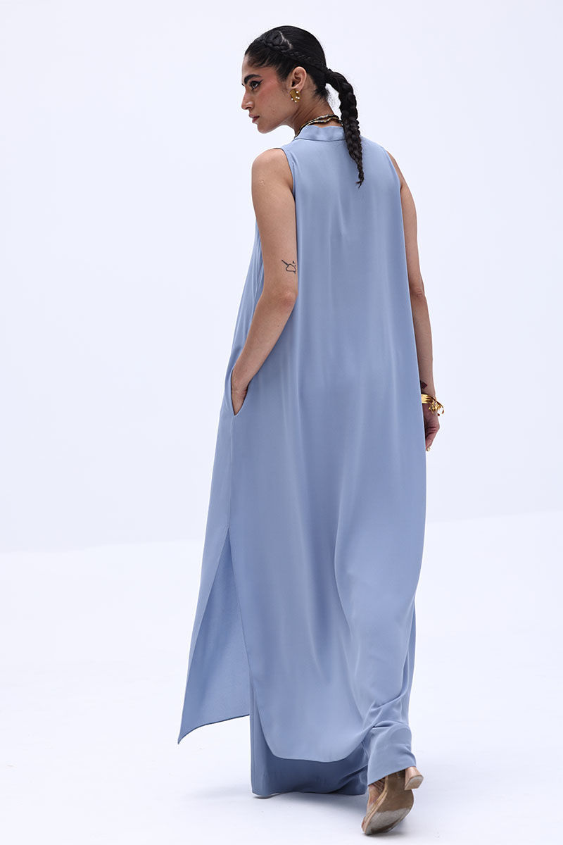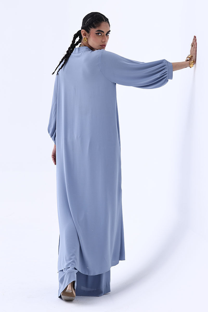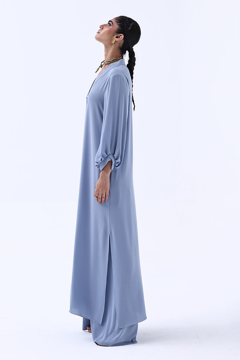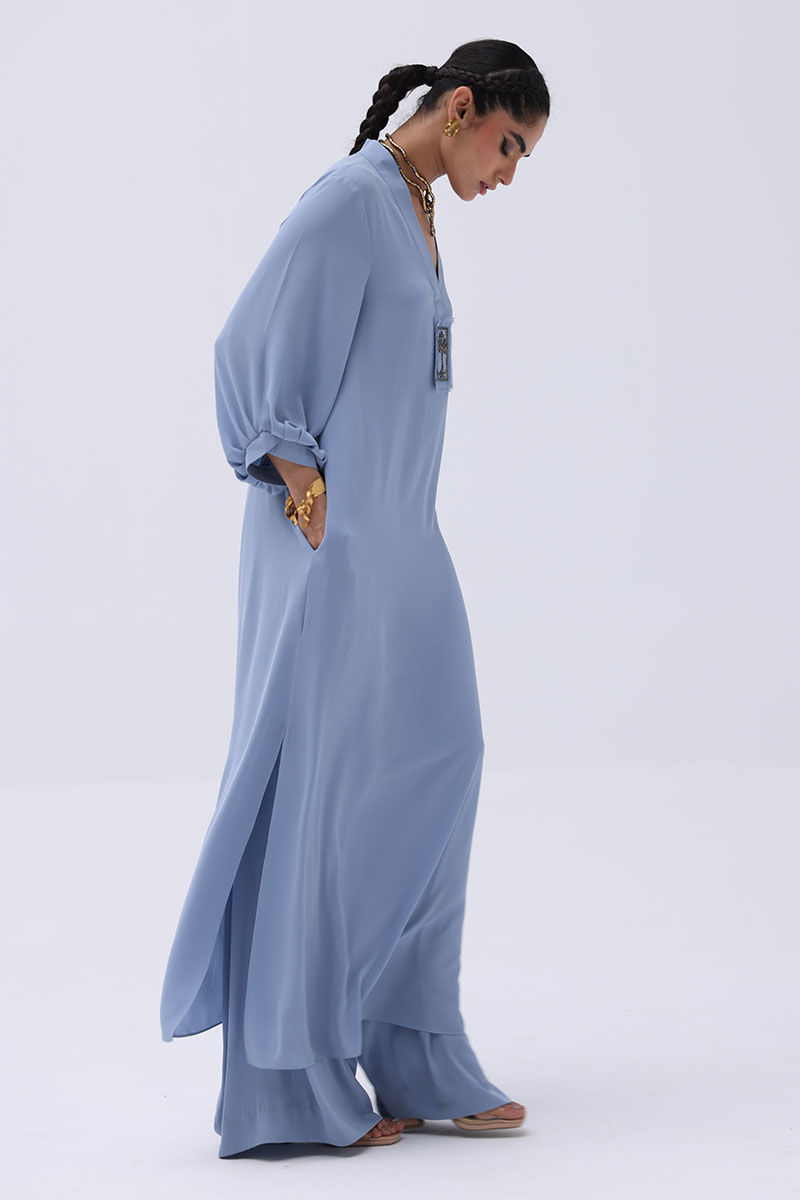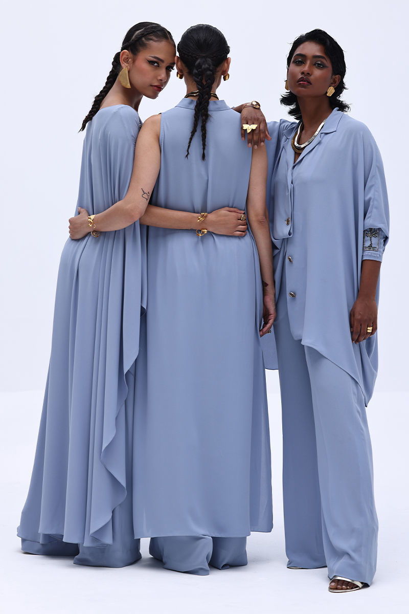 Make a subtle yet striking impression in this Blue Fog-colored georgette outfit. The long shirt features a beautifully handcrafted bunch on the neckline, adorned with intricate cut dana work in gold and varying shades of grey. This delicate embellishment adds depth and shimmer without overpowering the soft elegance of the ensemble. Paired with chic culottes.