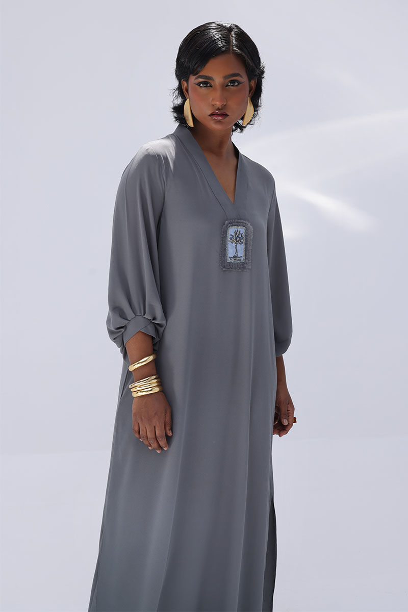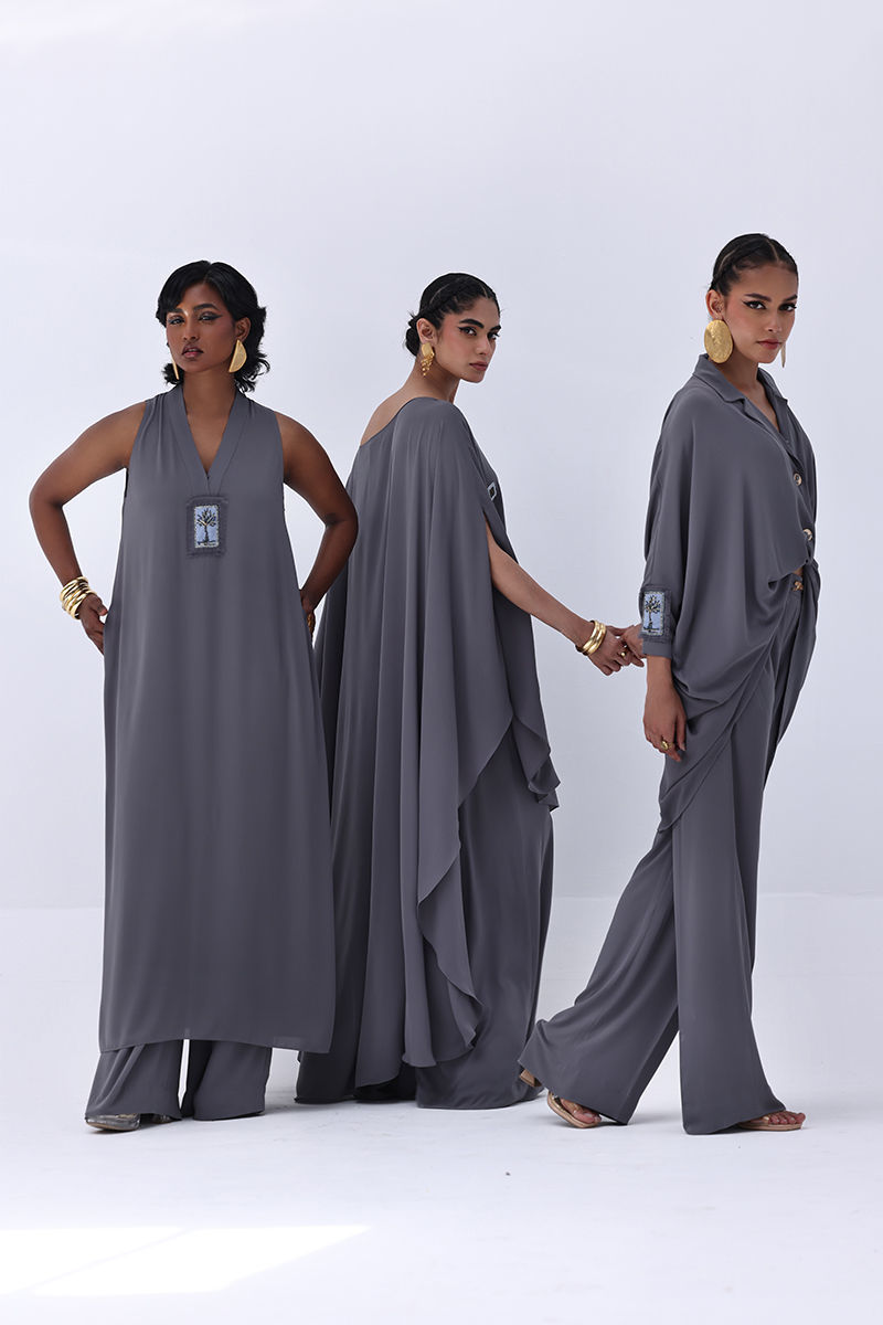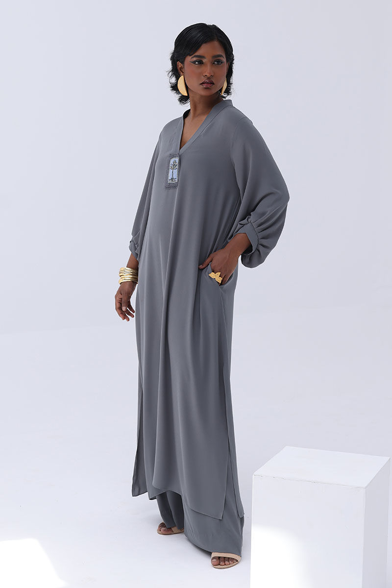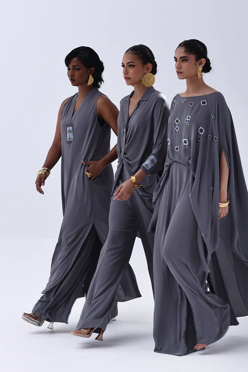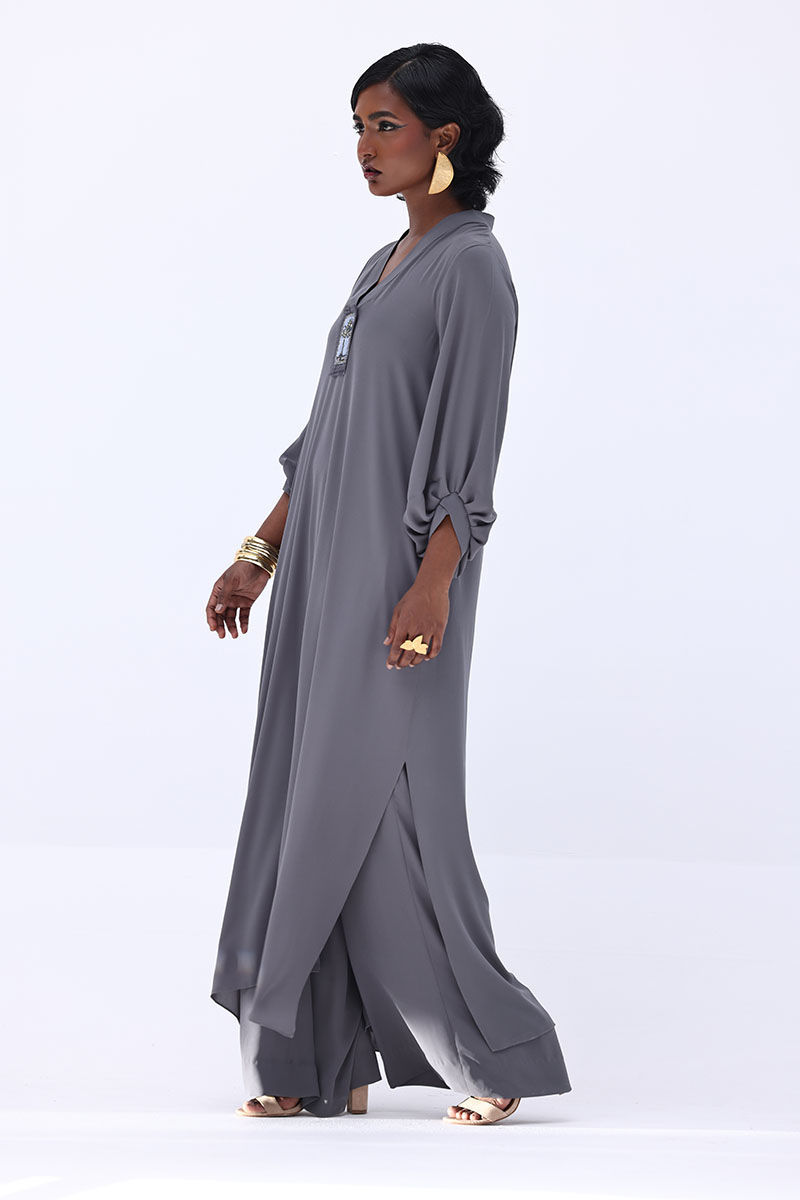 Elevate your wardrobe with this graceful charcoal grey ensemble, crafted from flowy georgette. The long shirt is highlighted by a hand-made bunch on the neckline, intricately embellished with gold and various shades of grey cut dana work. This refined detailing adds a sophisticated sparkle, perfect for making a statement at formal events. Finished with matching culottes.