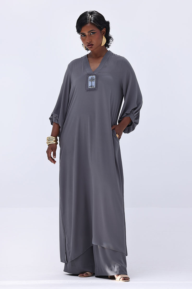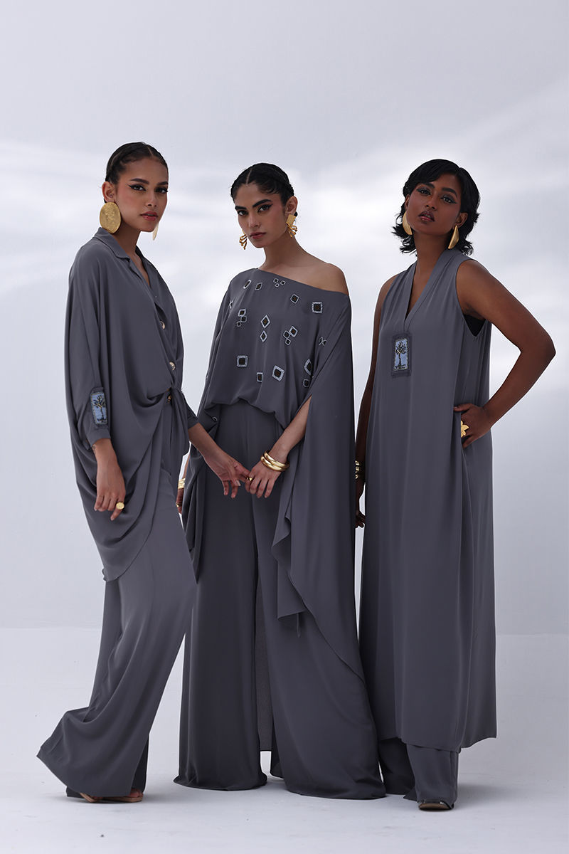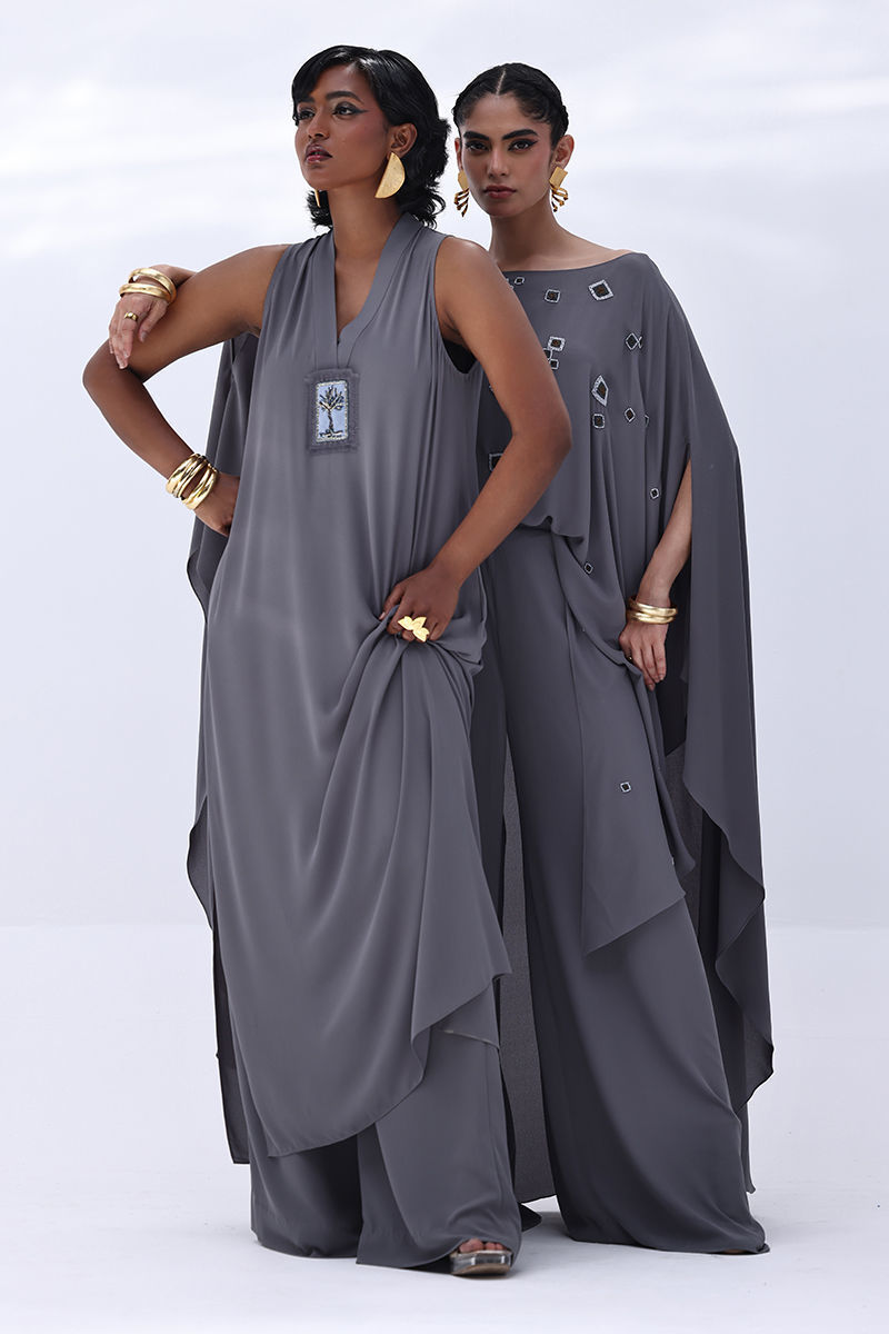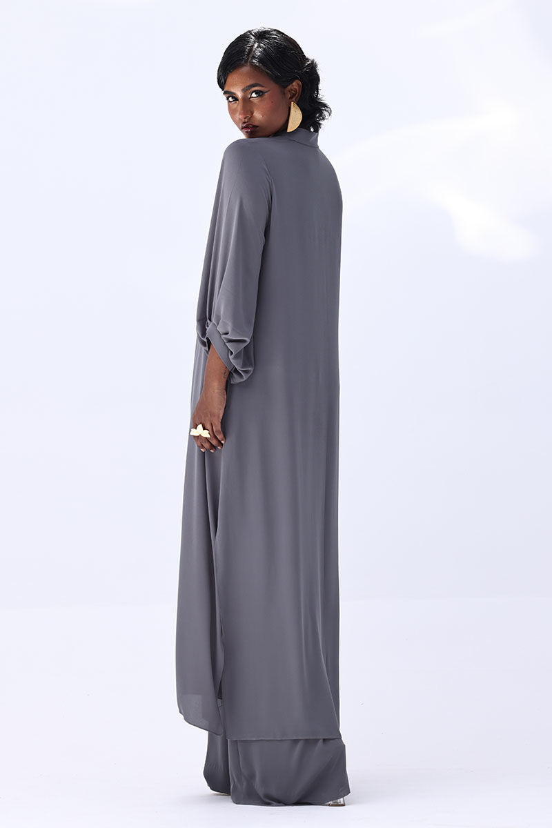 Elevate your wardrobe with this graceful charcoal grey ensemble, crafted from flowy georgette. The long shirt is highlighted by a handmade bunch on the neckline, intricately embellished with gold and various shades of grey cut dana work. This refined detailing adds a sophisticated sparkle, perfect for making a statement at formal events. Finished with matching culottes.