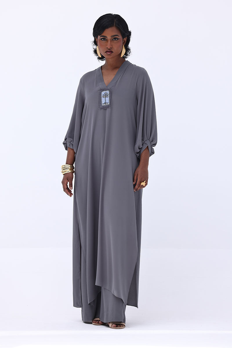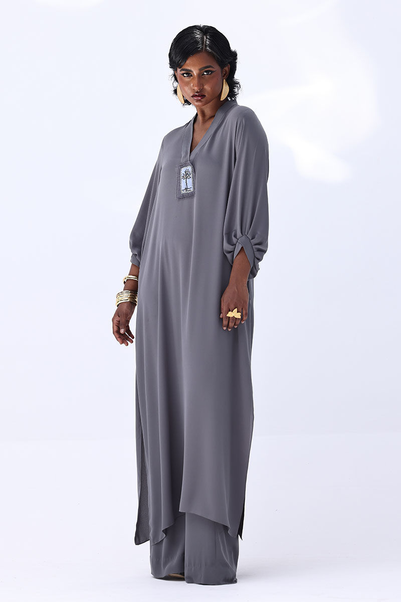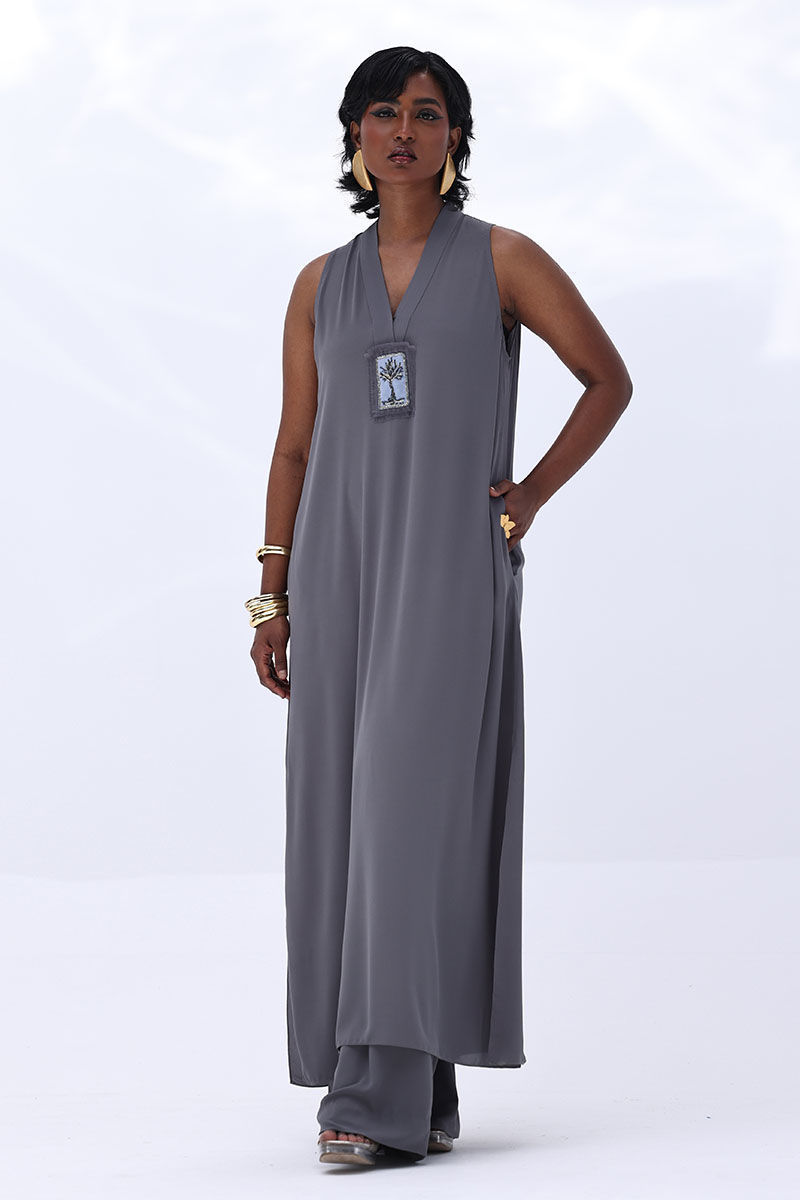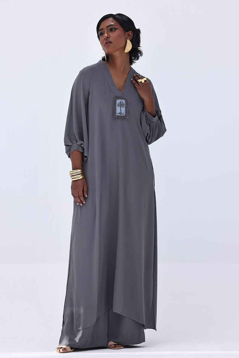 Elevate your wardrobe with this graceful charcoal grey ensemble, crafted from flowy georgette. The long shirt is highlighted by a handmade bunch on the neckline, intricately embellished with gold and various shades of grey cut dana work. This refined detailing adds a sophisticated sparkle, perfect for making a statement at formal events. Finished with matching culottes.