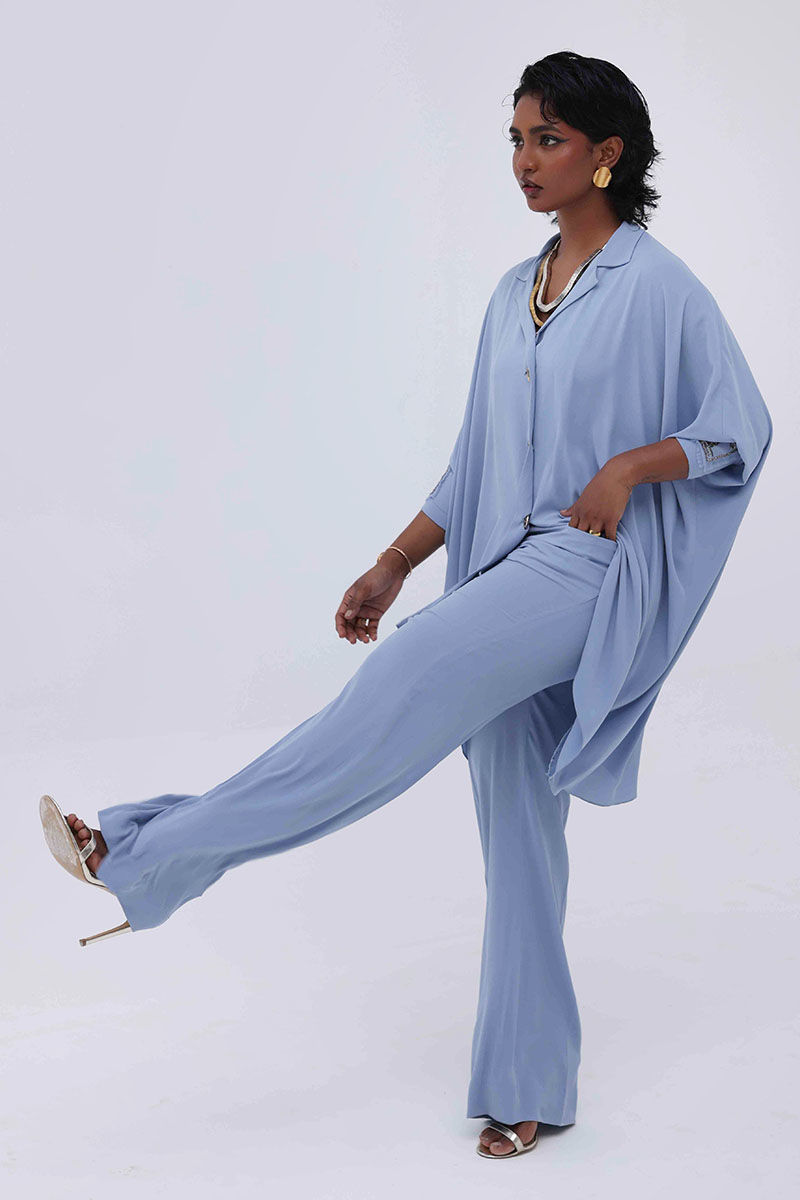 Grace meets craftsmanship in this exquisite Blue Fog Georgette piece, featuring delicate hand-made bunch detailing on both sleeves. Embellished with shimmering gold and varying shades of grey Cut Dana work, this design brings understated glamour and intricate artistry together. The lightweight georgette fabric drapes beautifully, making it perfect for refined festive gatherings