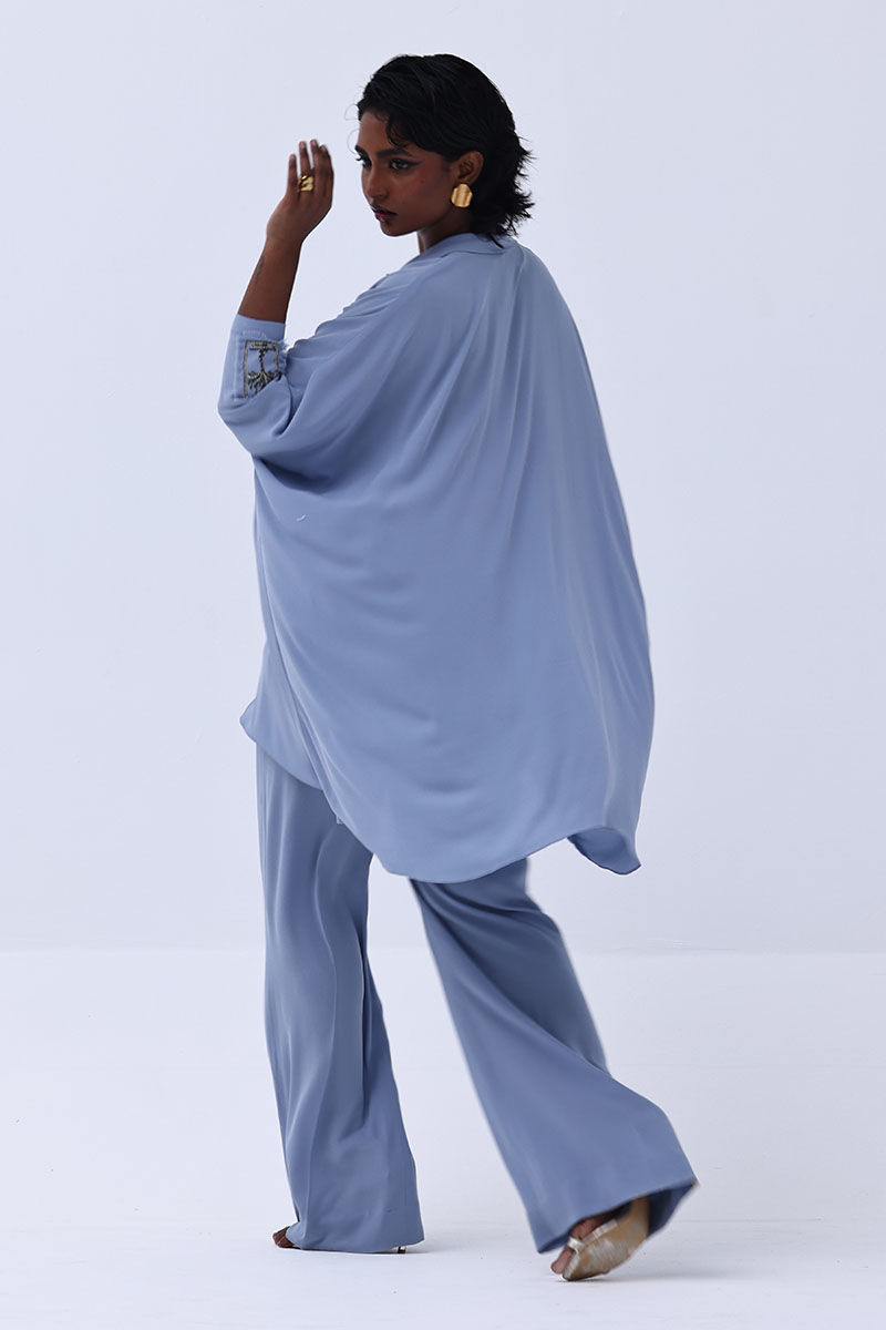 Color: Blue Fog Fabric: Georgette Work Details: Hand Made Bunch On Both Sleeves With Gold And Different Shades Of Grey Cut Dana
