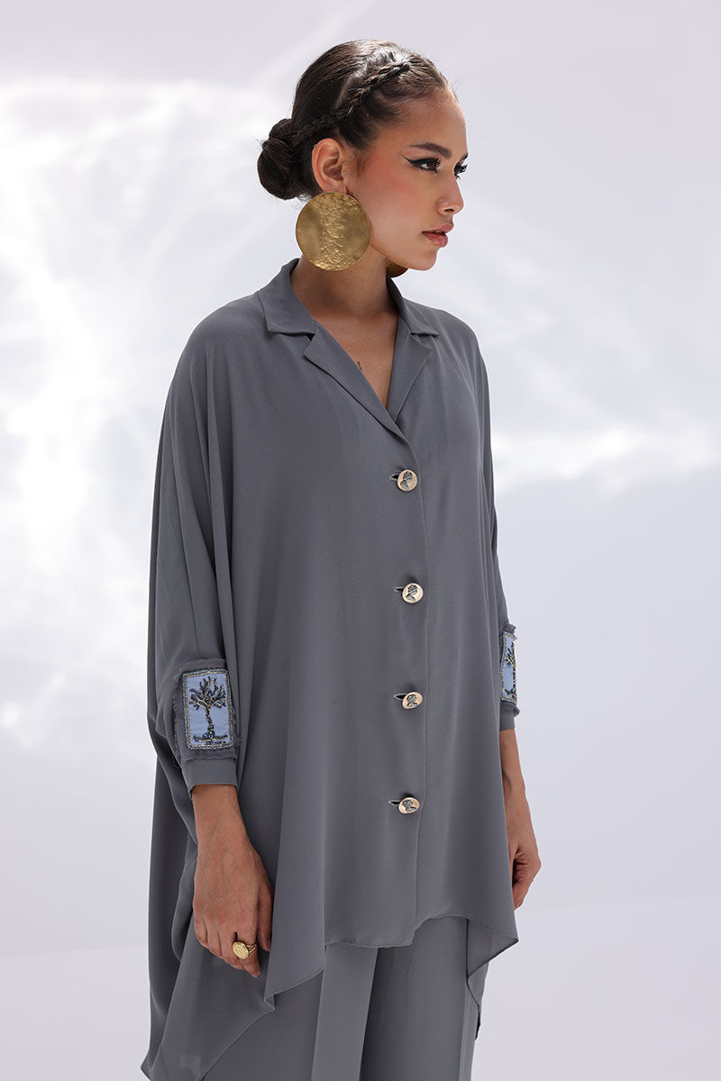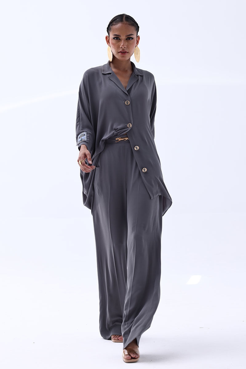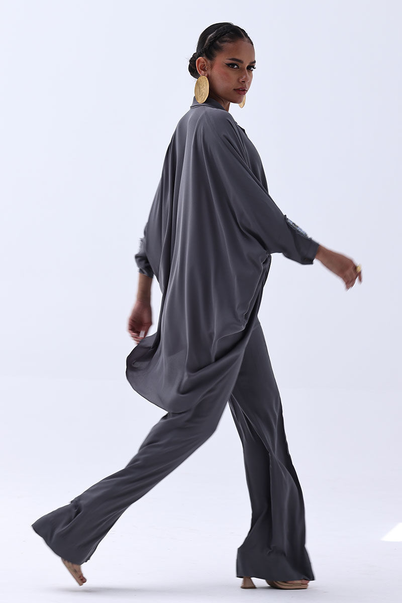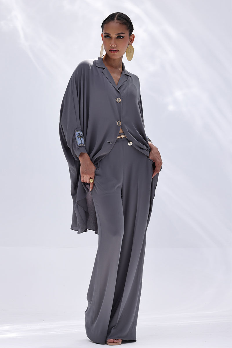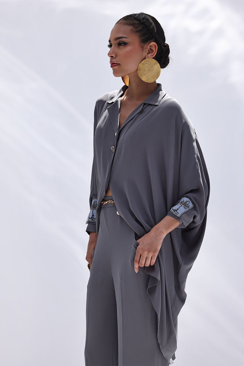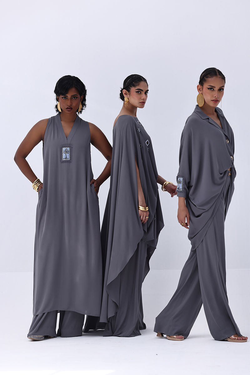 Color: Charcoal Grey Fabric: Georgette Work Details: Hand Made Bunch On Both Sleeves With Gold And Different Shades Of Grey Cut Dana