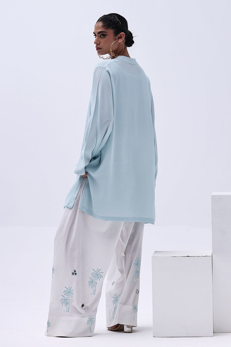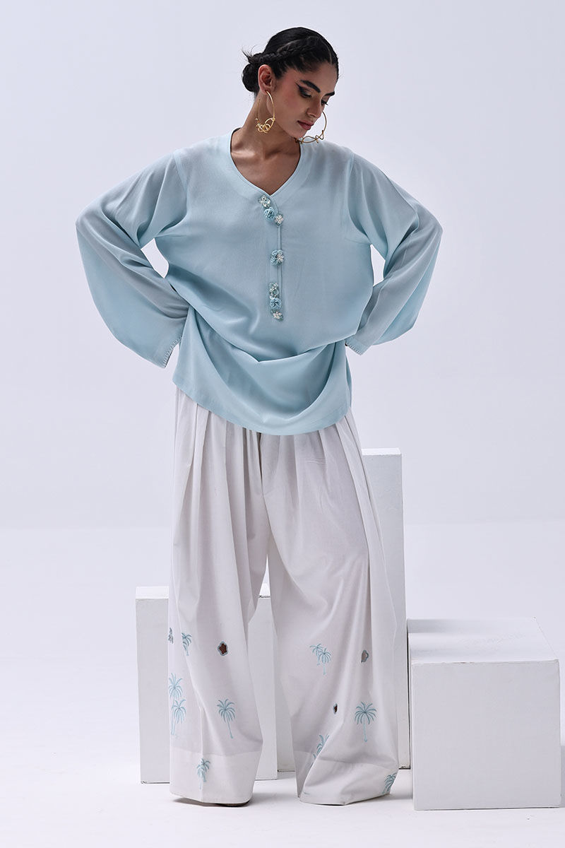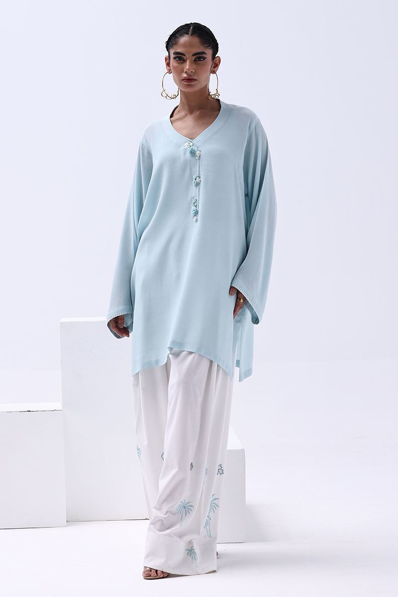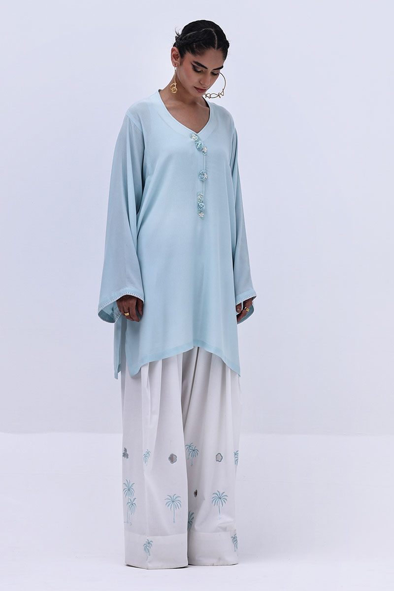A soft symphony of tones and textures, this elegant ensemble features a Pastel Blue Turkish Linen shirt paired with an Ivory Irish shalwar. The neckline is intricately adorned with handcrafted floral detailing, including pearls, shells, sequins, moti, and 3D flowers, creating a stunning focal point of artisanal beauty. The shalwar showcases delicate resham embroidery with cutwork, adding depth and refinement to the overall look.