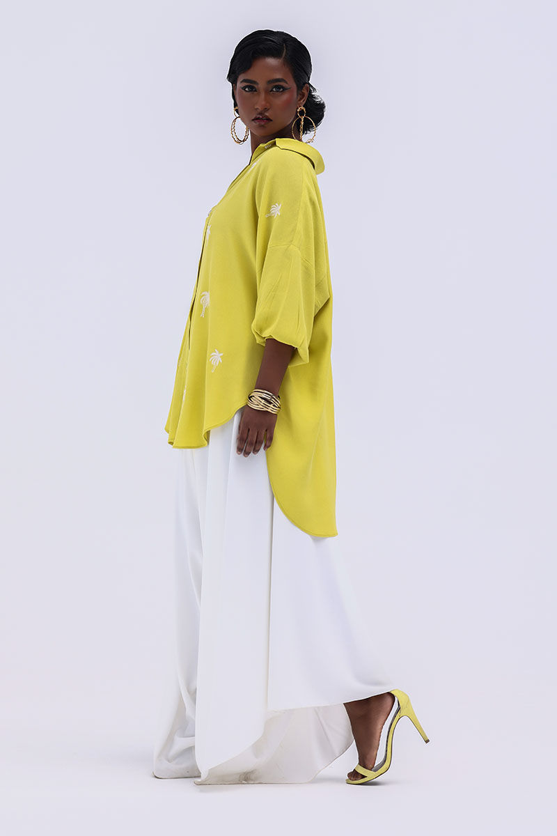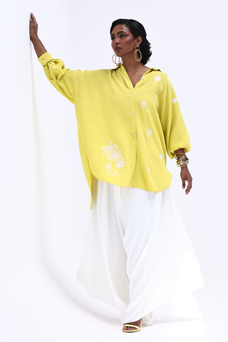 Fresh and graceful, this ensemble features a Celery Green Turkish Linen shirt paired with Ivory Turkish crepe pants for a look that’s both refined and modern. The shirt is beautifully accented with delicate Resham embroidery on the front, adding a subtle touch of artistry and texture. Lightweight and comfortable yet effortlessly elegant, this outfit is perfect for day-to-evening wear, exuding understated sophistication.