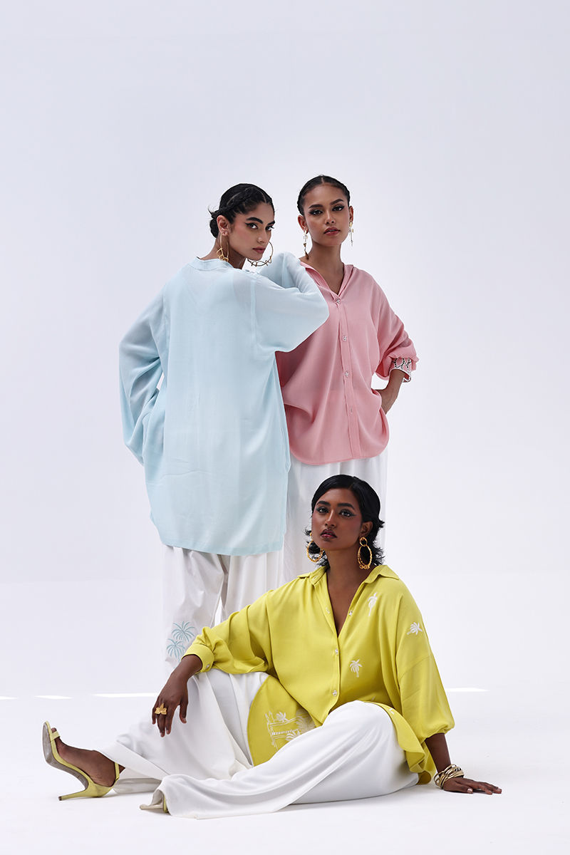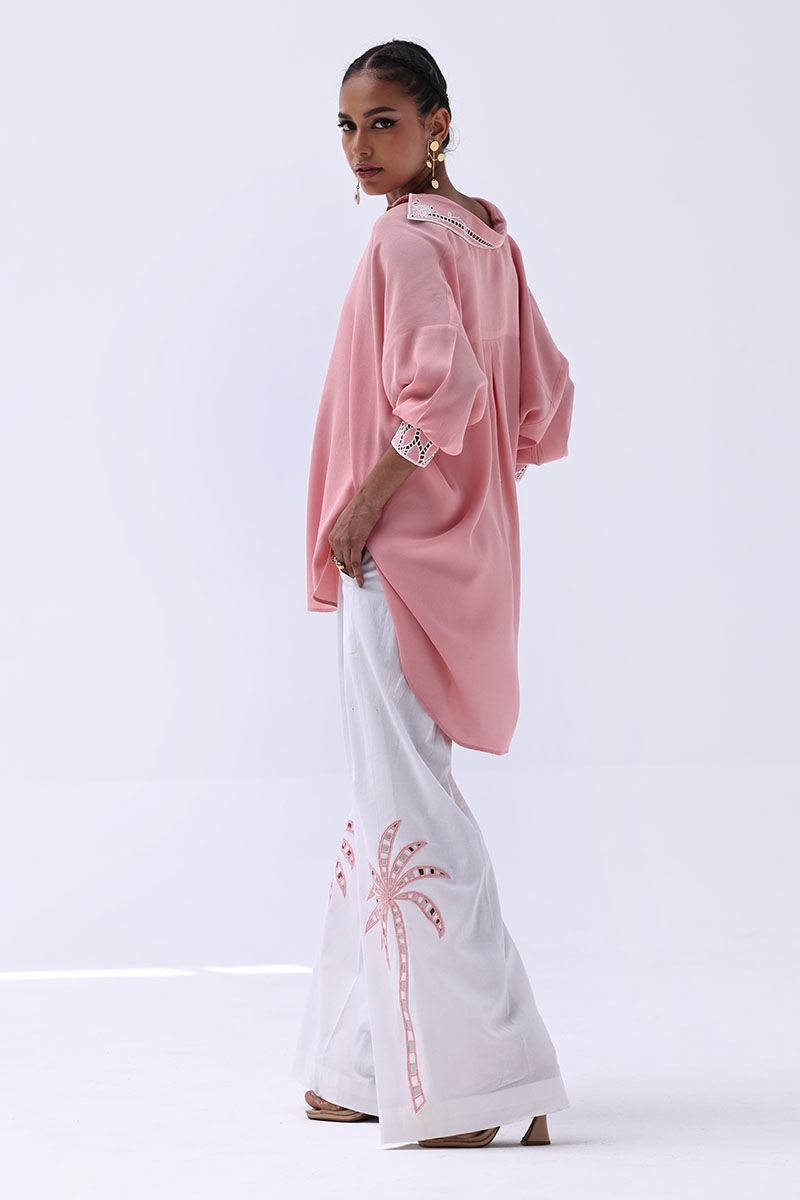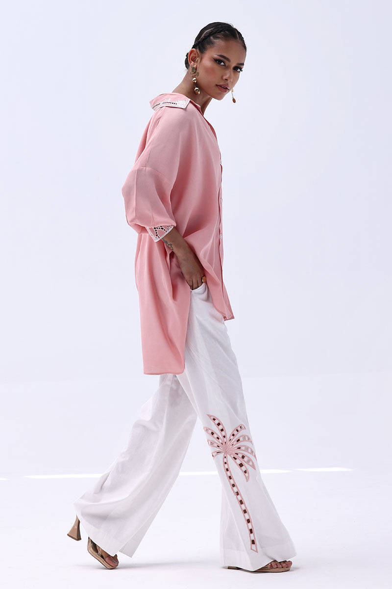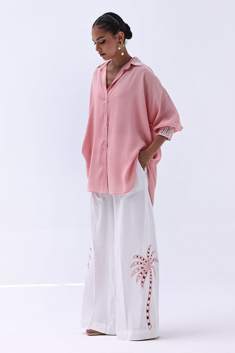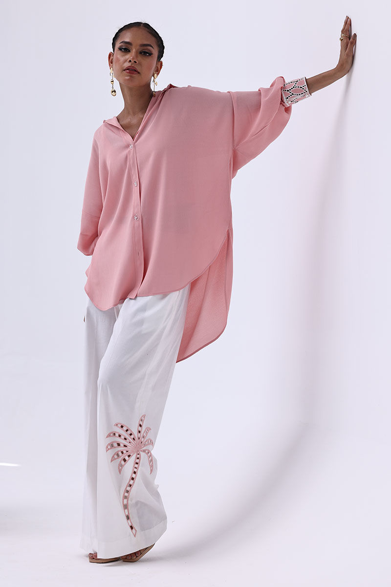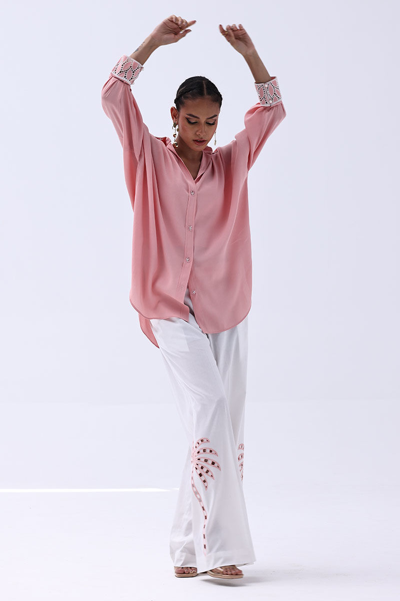 Chic and contemporary, this ensemble pairs a Peach Melba Turkish Linen shirt with Ivory Irish culottes, blending soft hues with artisanal detail. The shirt features delicate Resham embroidery and intricate cutwork on the cuffs and collar, creating a graceful and polished finish. Matching culottes mirror the look with coordinating Resham embroidery and cutwork, making this top-and-culottes set a seamless choice for refined day events or elegant gatherings.