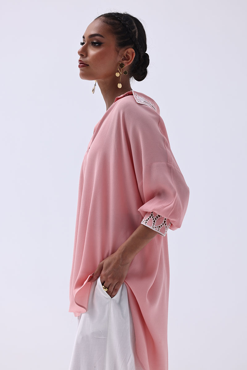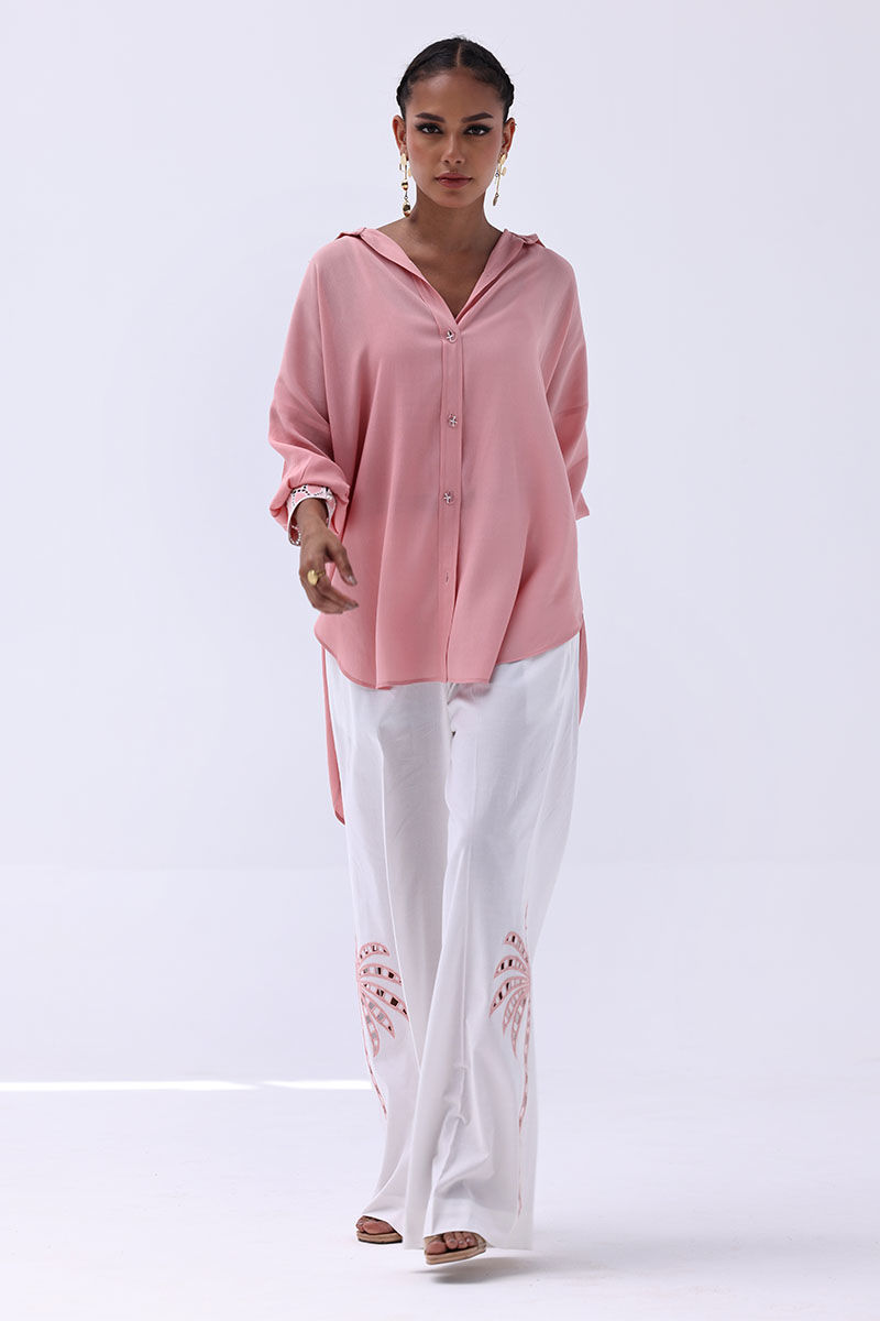 Chic and contemporary, this ensemble pairs a Peach Melba Turkish Linen shirt with Ivory Irish culottes, blending soft hues with artisanal detail. The shirt features delicate Resham embroidery and intricate cutwork on the cuffs and collar, creating a graceful and polished finish. Matching culottes mirror the look with coordinating Resham embroidery and cutwork, making this top-and-culottes set a seamless choice for refined day events or elegant gatherings.